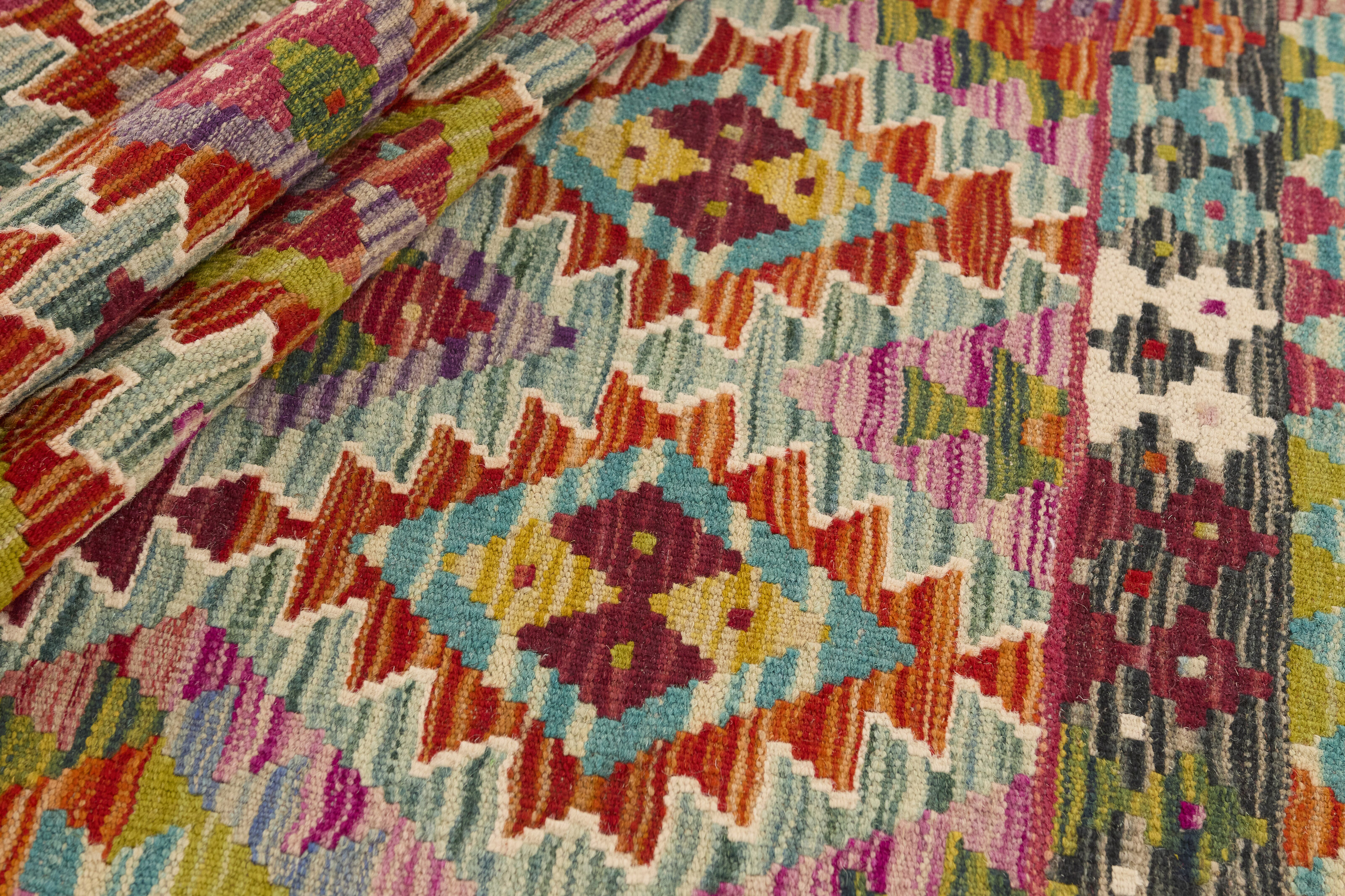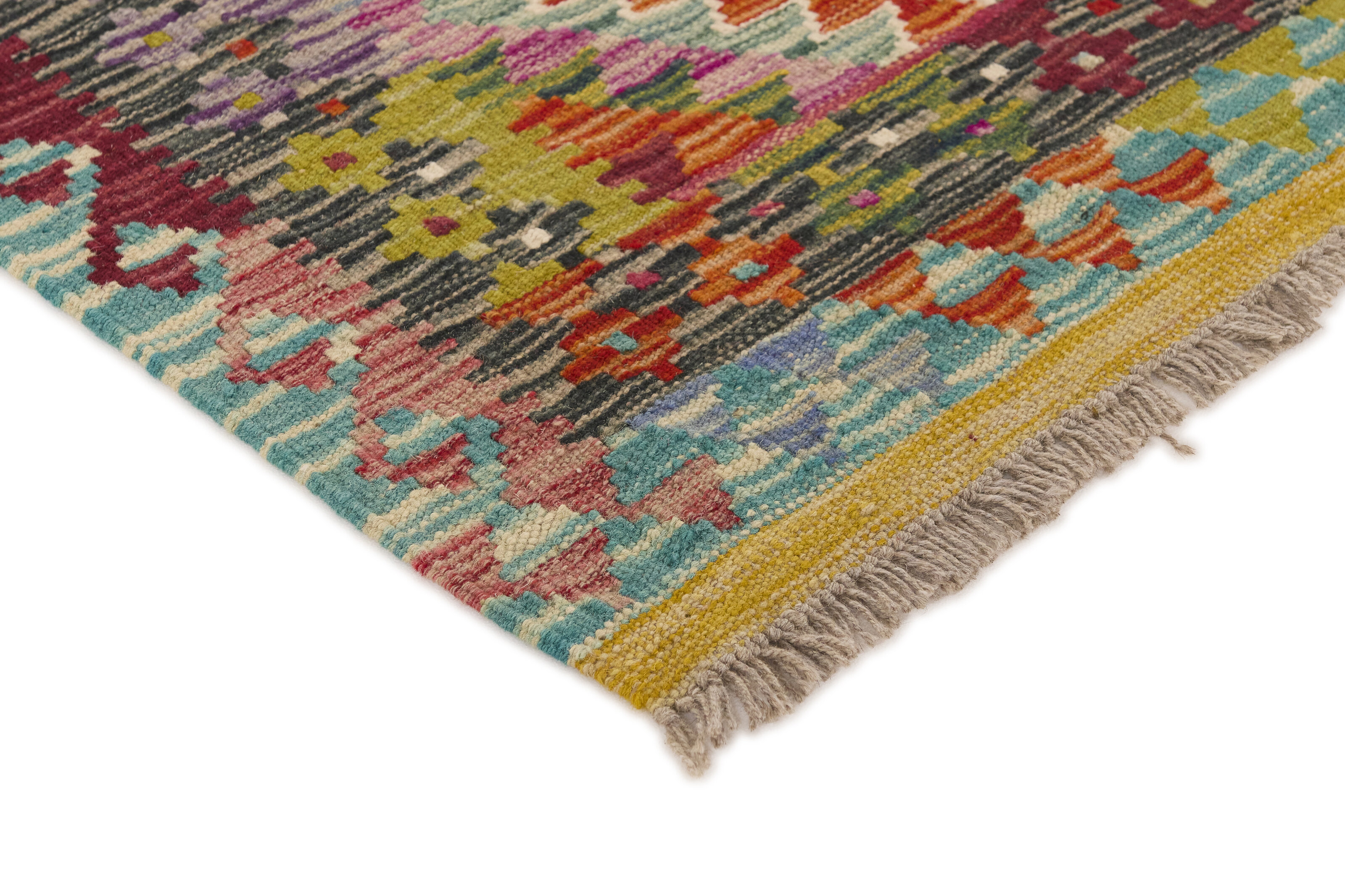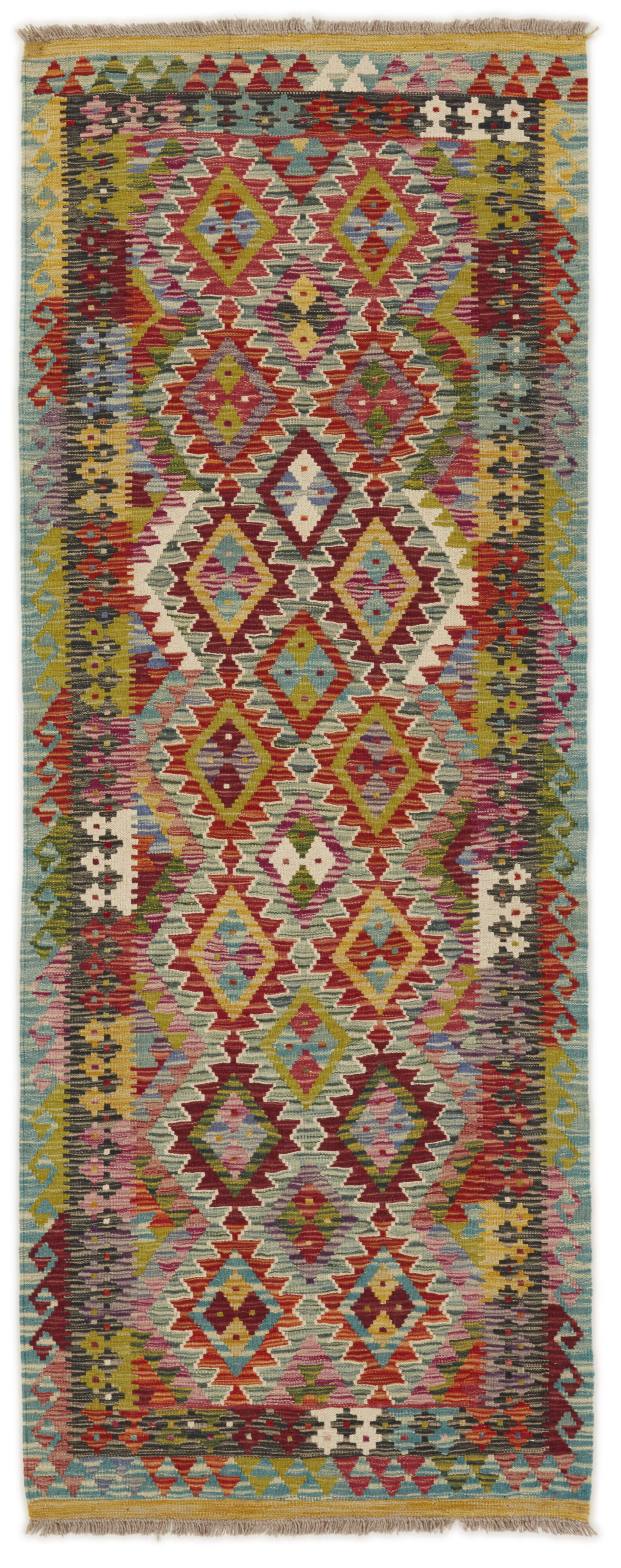 Afghan KelimItem no.: 1512909 Size: 89 cm x 235 cmAfghan Kelim rugs are hand woven by Turkmens in northern Afghanistan. Kelim is the name of a common Persian weave, but also of the technology used in the production. Kelims are primarily produced by nomads and are pile-less rugs, which are also used for bags, as wall decoration, or as curtains for tents. A natural colour scale with geometrical symbols and octagons is used.