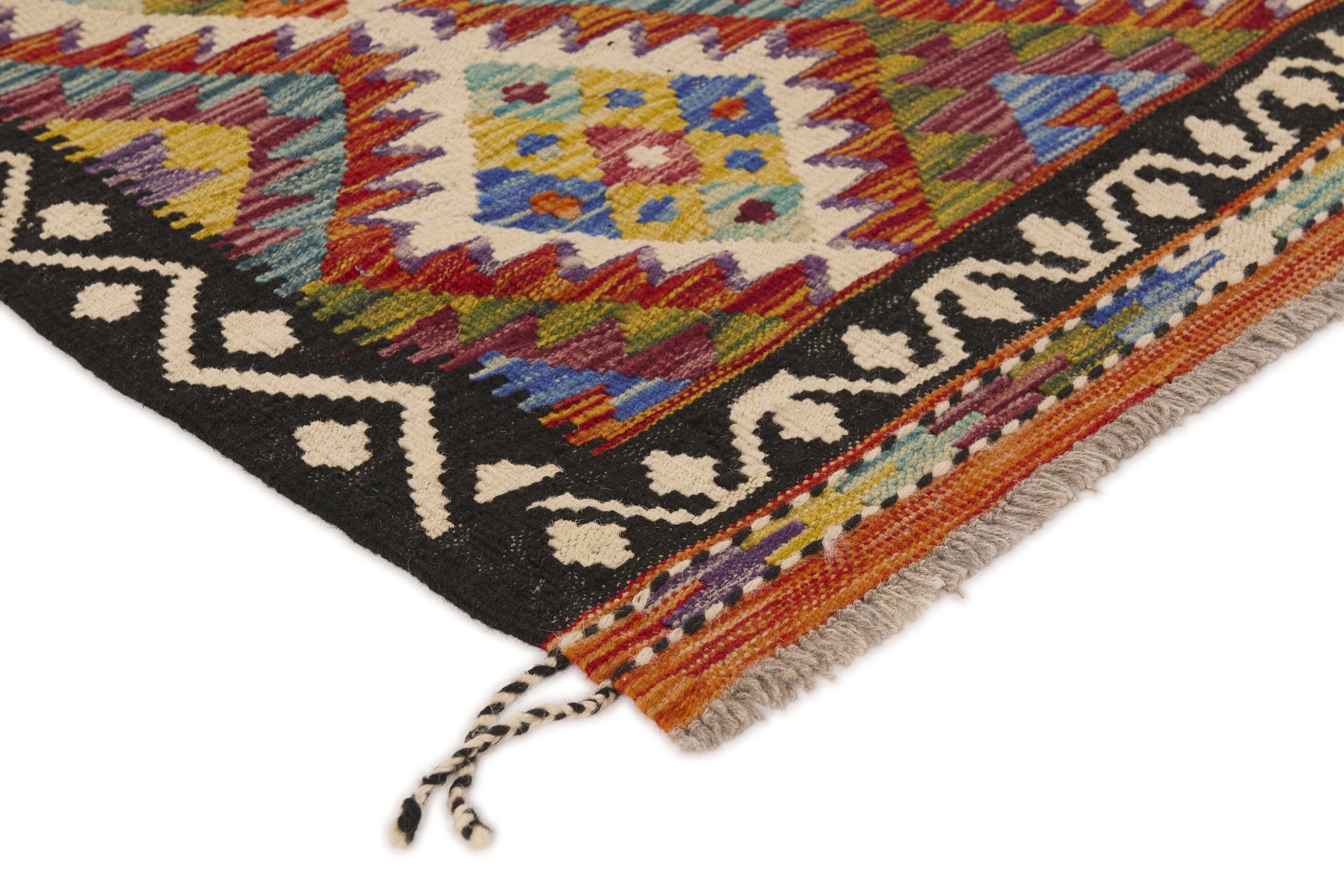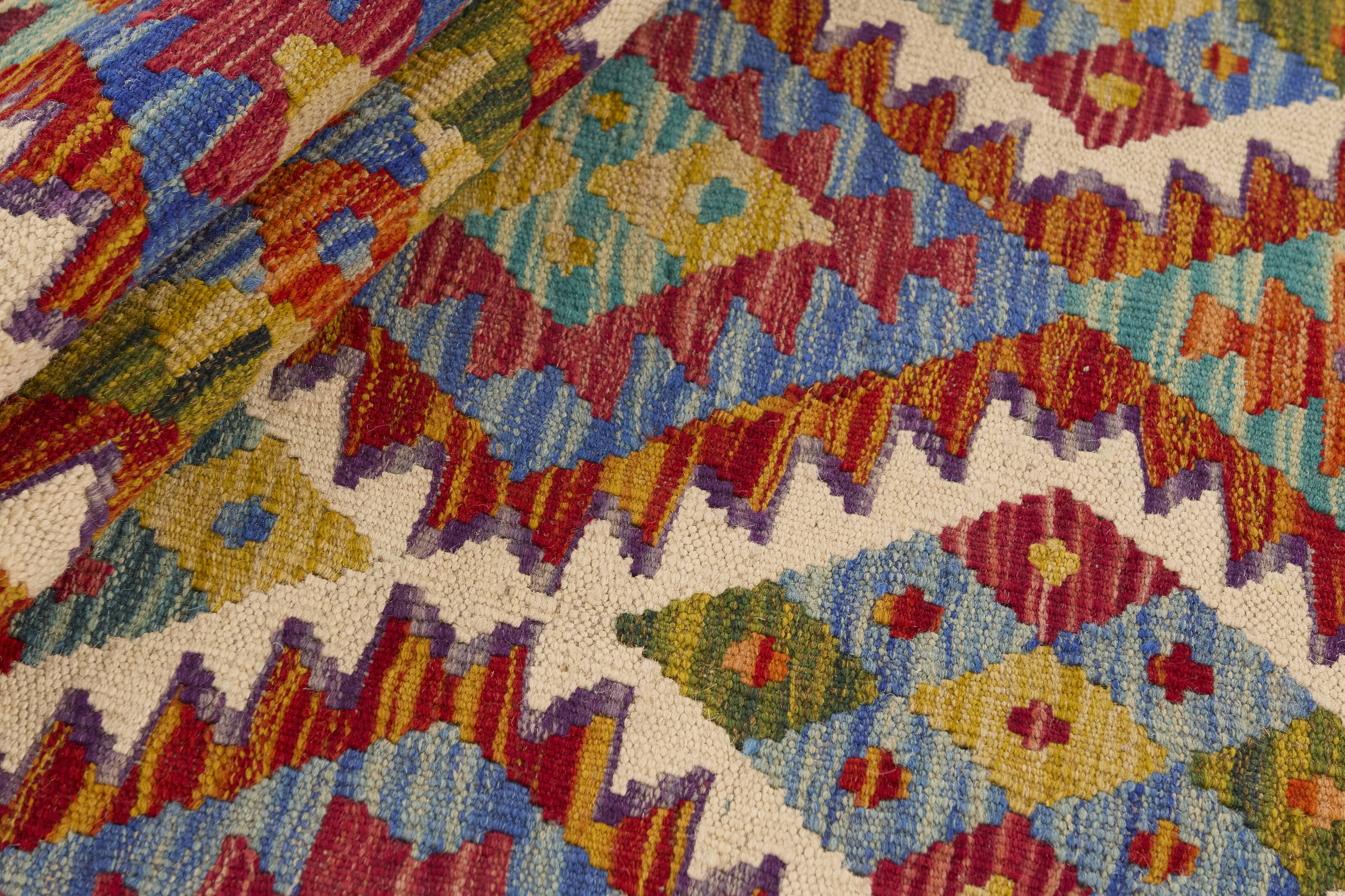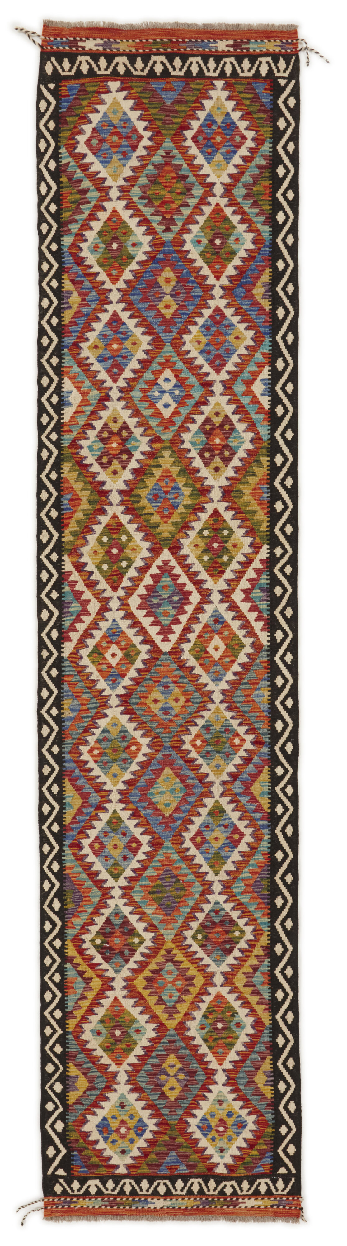 Afghan KelimItem no.: 1512987 Size: 84 cm x 386 cmAfghan Kelim rugs are hand woven by Turkmens in northern Afghanistan. Kelim is the name of a common Persian weave, but also of the technology used in the production. Kelims are primarily produced by nomads and are pile-less rugs, which are also used for bags, as wall decoration, or as curtains for tents. A natural colour scale with geometrical symbols and octagons is used.
