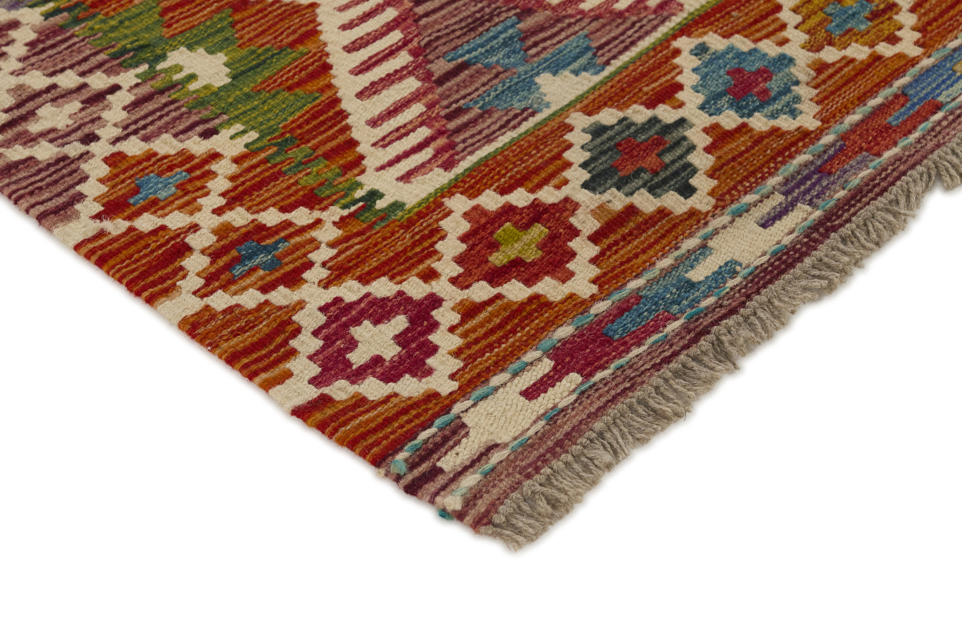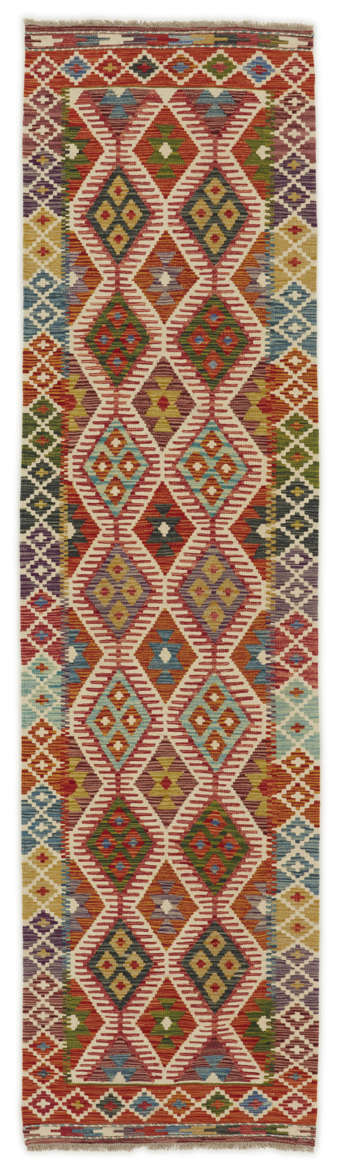 Afghan KelimItem no.: 1519045 Size: 80 cm x 303 cmAfghan Kelim rugs are hand woven by Turkmens in northern Afghanistan. Kelim is the name of a common Persian weave, but also of the technology used in the production. Kelims are primarily produced by nomads and are pile-less rugs, which are also used for bags, as wall decoration, or as curtains for tents. A natural colour scale with geometrical symbols and octagons is used.