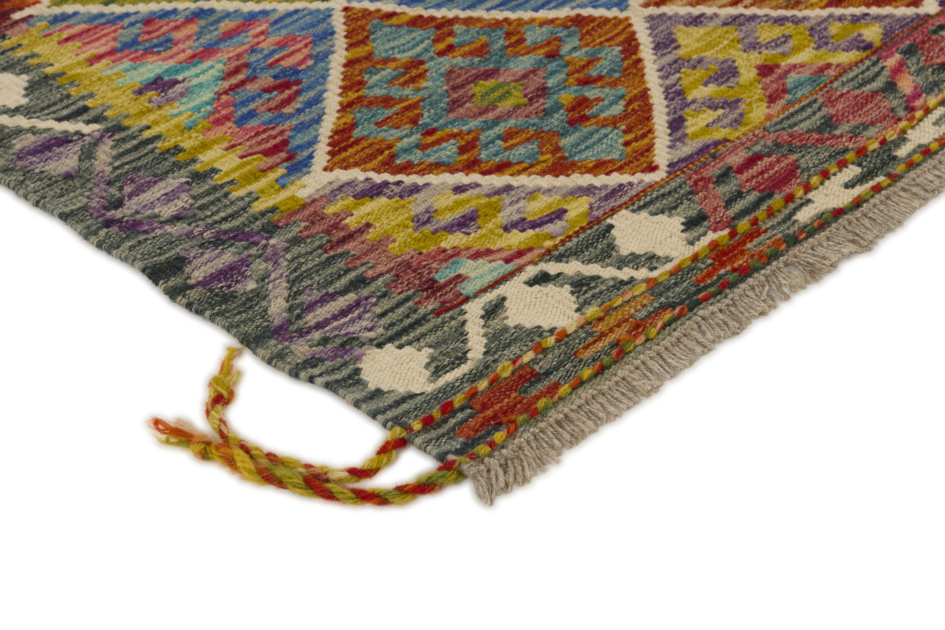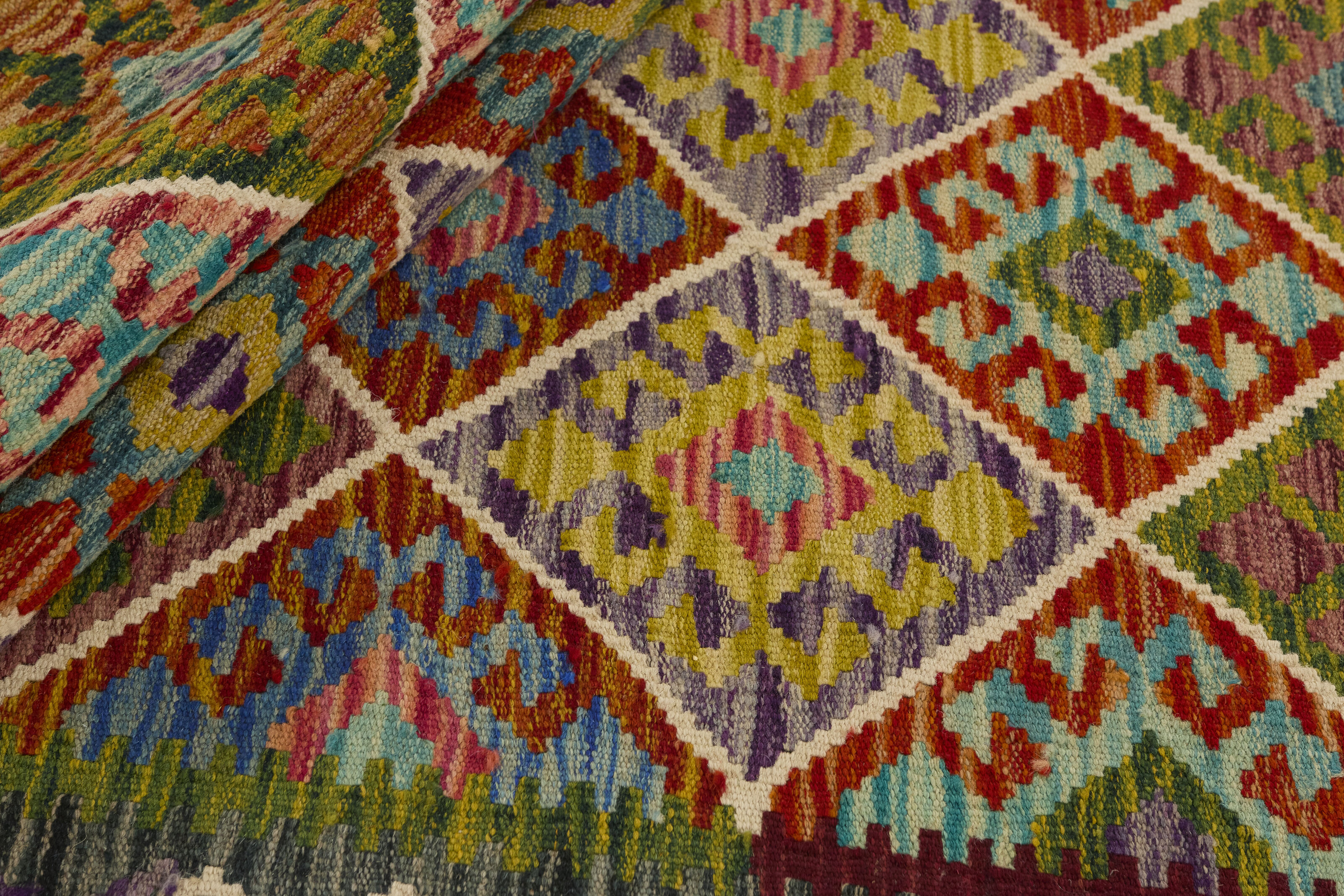 Afghan KelimItem no.: 1519049 Size: 83 cm x 305 cmAfghan Kelim rugs are hand woven by Turkmens in northern Afghanistan. Kelim is the name of a common Persian weave, but also of the technology used in the production. Kelims are primarily produced by nomads and are pile-less rugs, which are also used for bags, as wall decoration, or as curtains for tents. A natural colour scale with geometrical symbols and octagons is used.