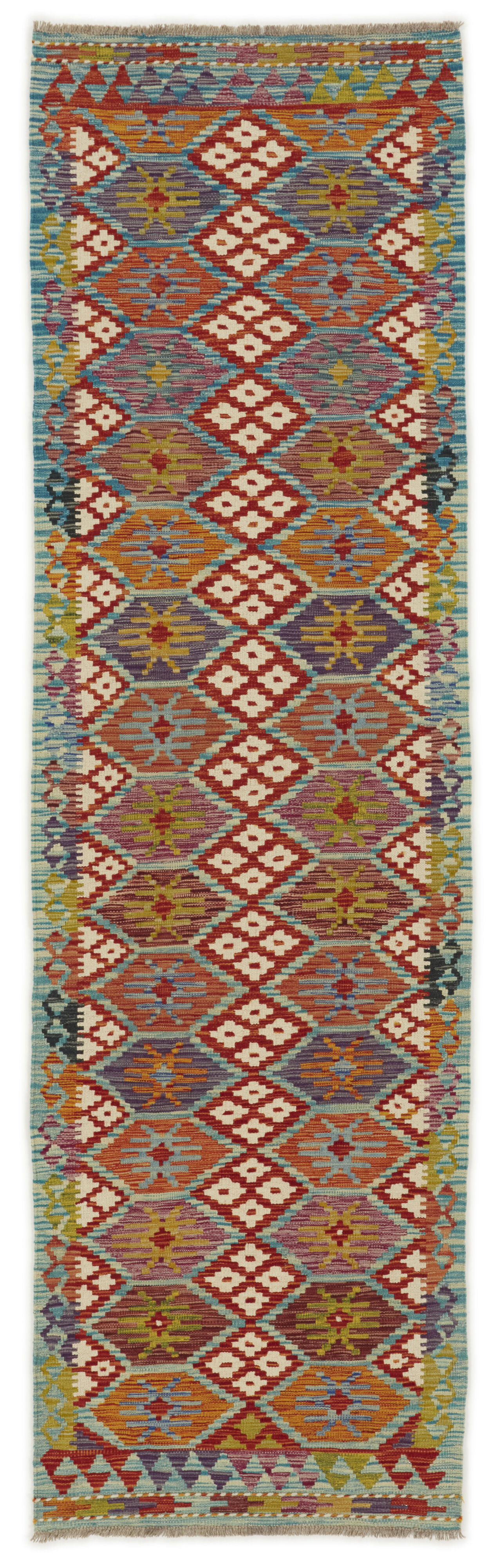 Afghan KelimItem no.: 1519053 Size: 85 cm x 292 cmAfghan Kelim rugs are hand woven by Turkmens in northern Afghanistan. Kelim is the name of a common Persian weave, but also of the technology used in the production. Kelims are primarily produced by nomads and are pile-less rugs, which are also used for bags, as wall decoration, or as curtains for tents. A natural colour scale with geometrical symbols and octagons is used.