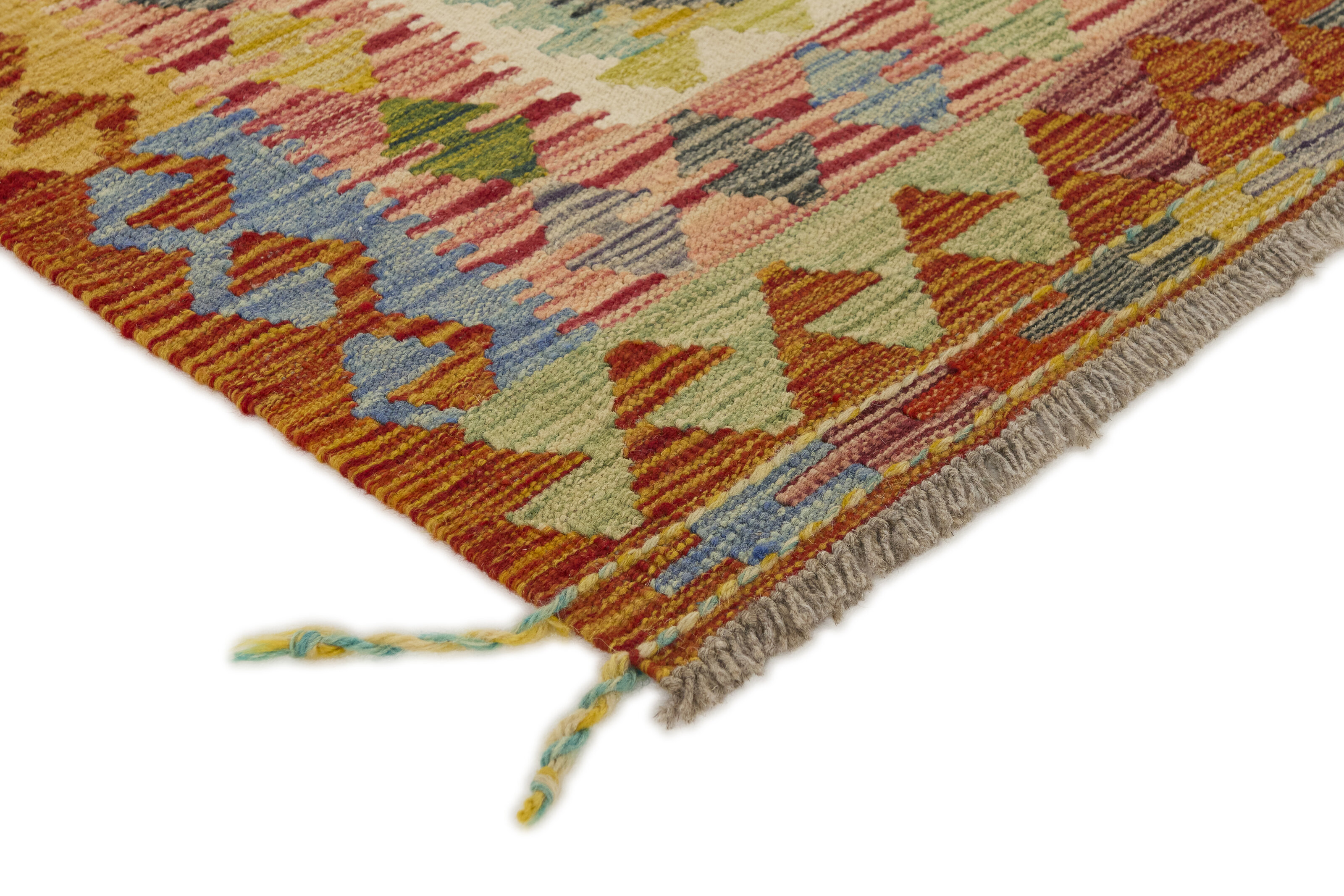 Afghan KelimItem no.: 1519062 Size: 86 cm x 243 cmAfghan Kelim rugs are hand woven by Turkmens in northern Afghanistan. Kelim is the name of a common Persian weave, but also of the technology used in the production. Kelims are primarily produced by nomads and are pile-less rugs, which are also used for bags, as wall decoration, or as curtains for tents. A natural colour scale with geometrical symbols and octagons is used.