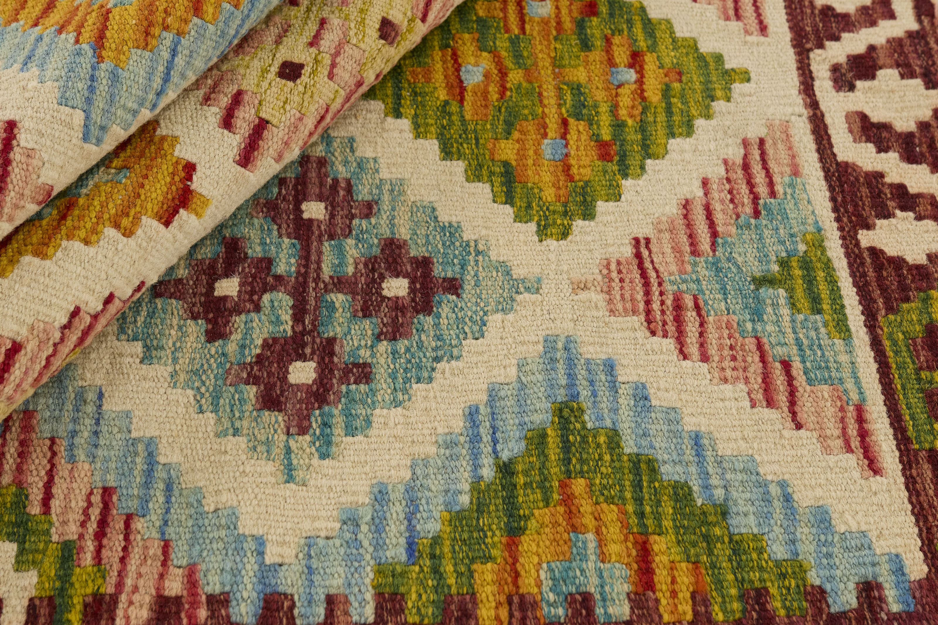 Afghan KelimItem no.: 1519123 Size: 80 cm x 120 cmAfghan Kelim rugs are hand woven by Turkmens in northern Afghanistan. Kelim is the name of a common Persian weave, but also of the technology used in the production. Kelims are primarily produced by nomads and are pile-less rugs, which are also used for bags, as wall decoration, or as curtains for tents. A natural colour scale with geometrical symbols and octagons is used.