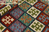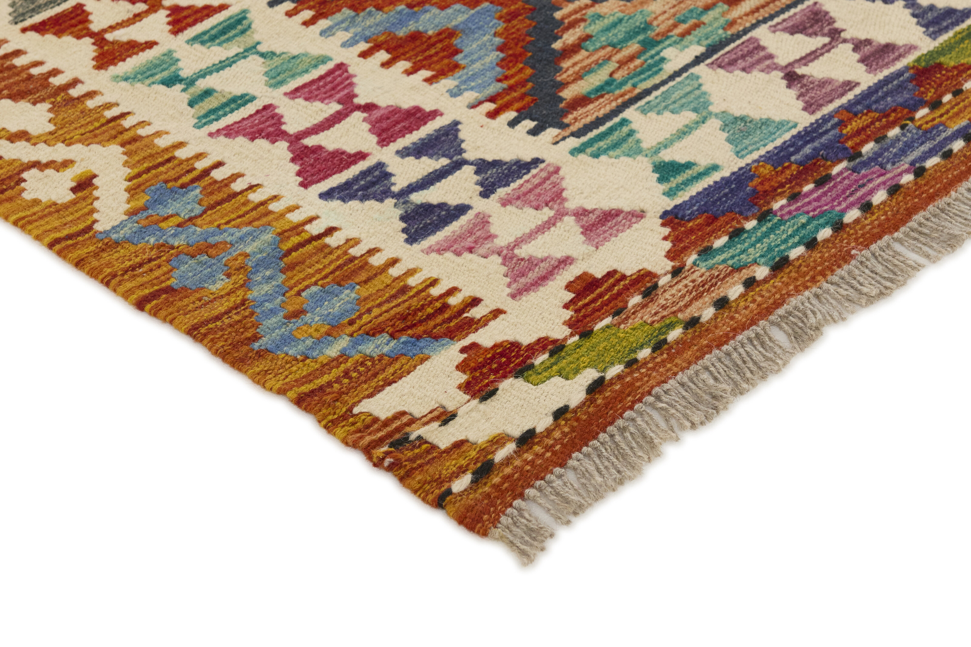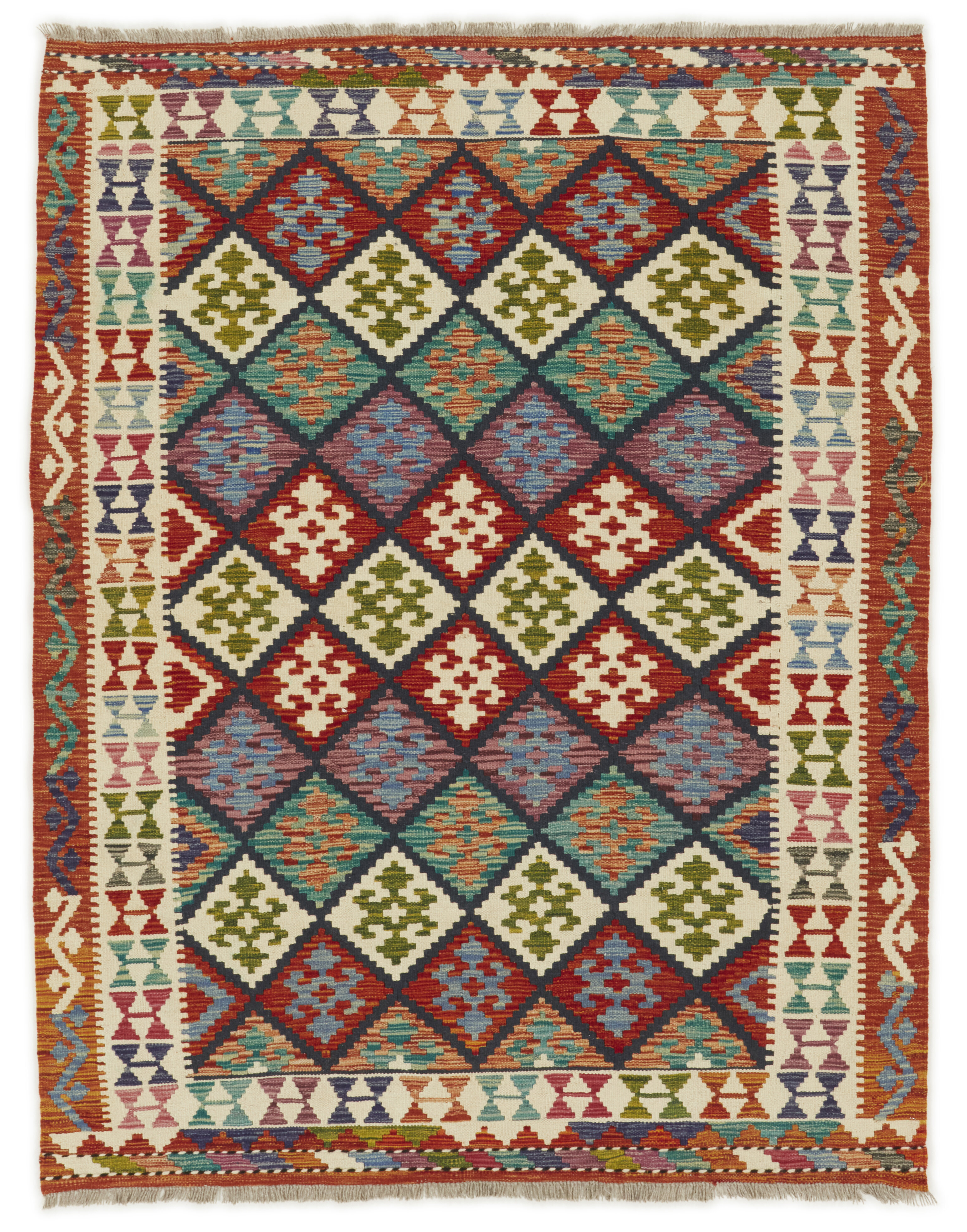 Afghan KelimItem no.: 1520342 Size: 155 cm x 198 cmAfghan Kelim rugs are hand woven by Turkmens in northern Afghanistan. Kelim is the name of a common Persian weave, but also of the technology used in the production. Kelims are primarily produced by nomads and are pile-less rugs, which are also used for bags, as wall decoration, or as curtains for tents. A natural colour scale with geometrical symbols and octagons is used.