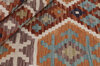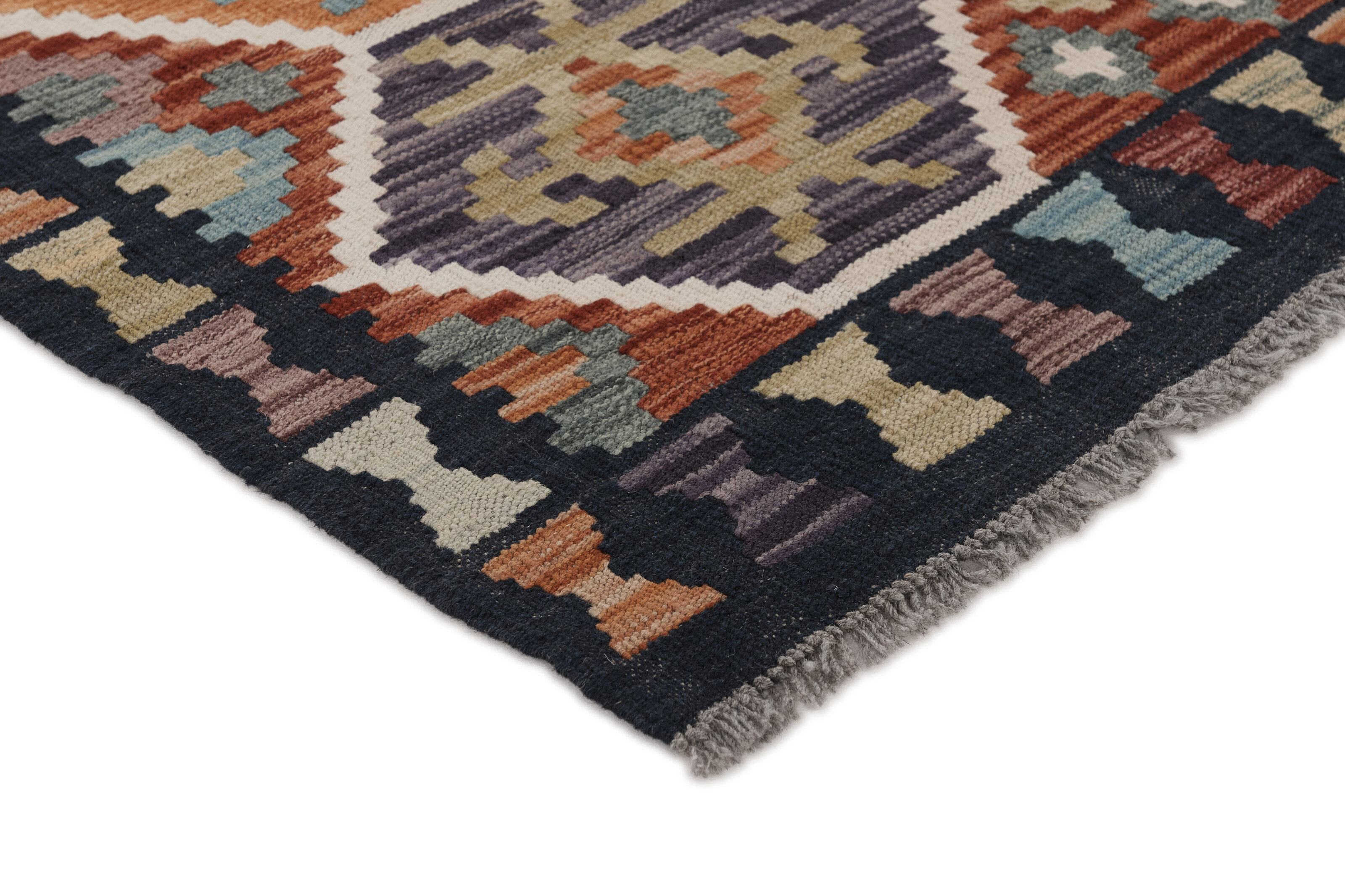 Afghan KelimItem no.: 1520397 Size: 104 cm x 159 cmAfghan Kelim rugs are hand woven by Turkmens in northern Afghanistan. Kelim is the name of a common Persian weave, but also of the technology used in the production. Kelims are primarily produced by nomads and are pile-less rugs, which are also used for bags, as wall decoration, or as curtains for tents. A natural colour scale with geometrical symbols and octagons is used.