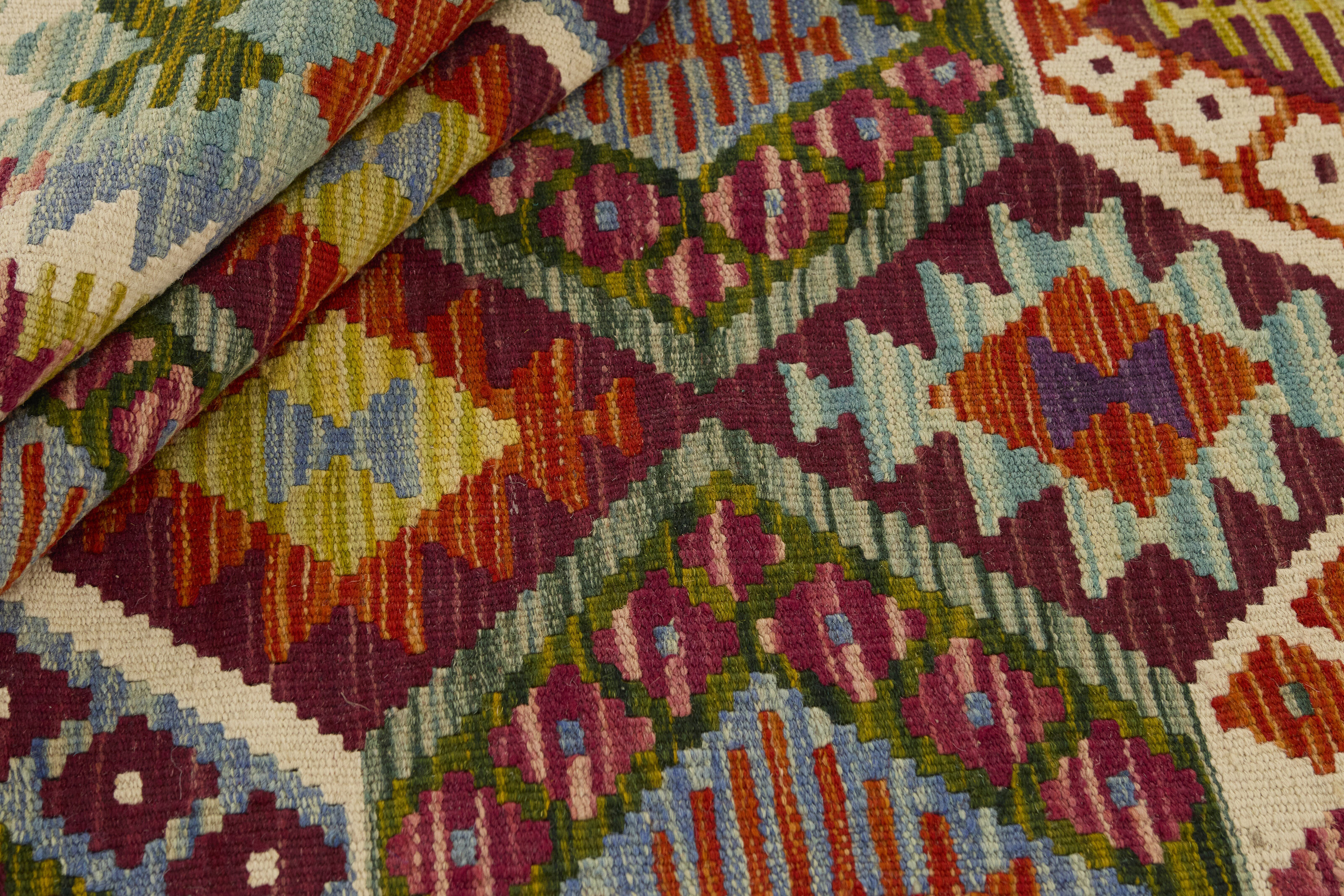 Afghan KelimItem no.: 1520492 Size: 130 cm x 191 cmAfghan Kelim rugs are hand woven by Turkmens in northern Afghanistan. Kelim is the name of a common Persian weave, but also of the technology used in the production. Kelims are primarily produced by nomads and are pile-less rugs, which are also used for bags, as wall decoration, or as curtains for tents. A natural colour scale with geometrical symbols and octagons is used.