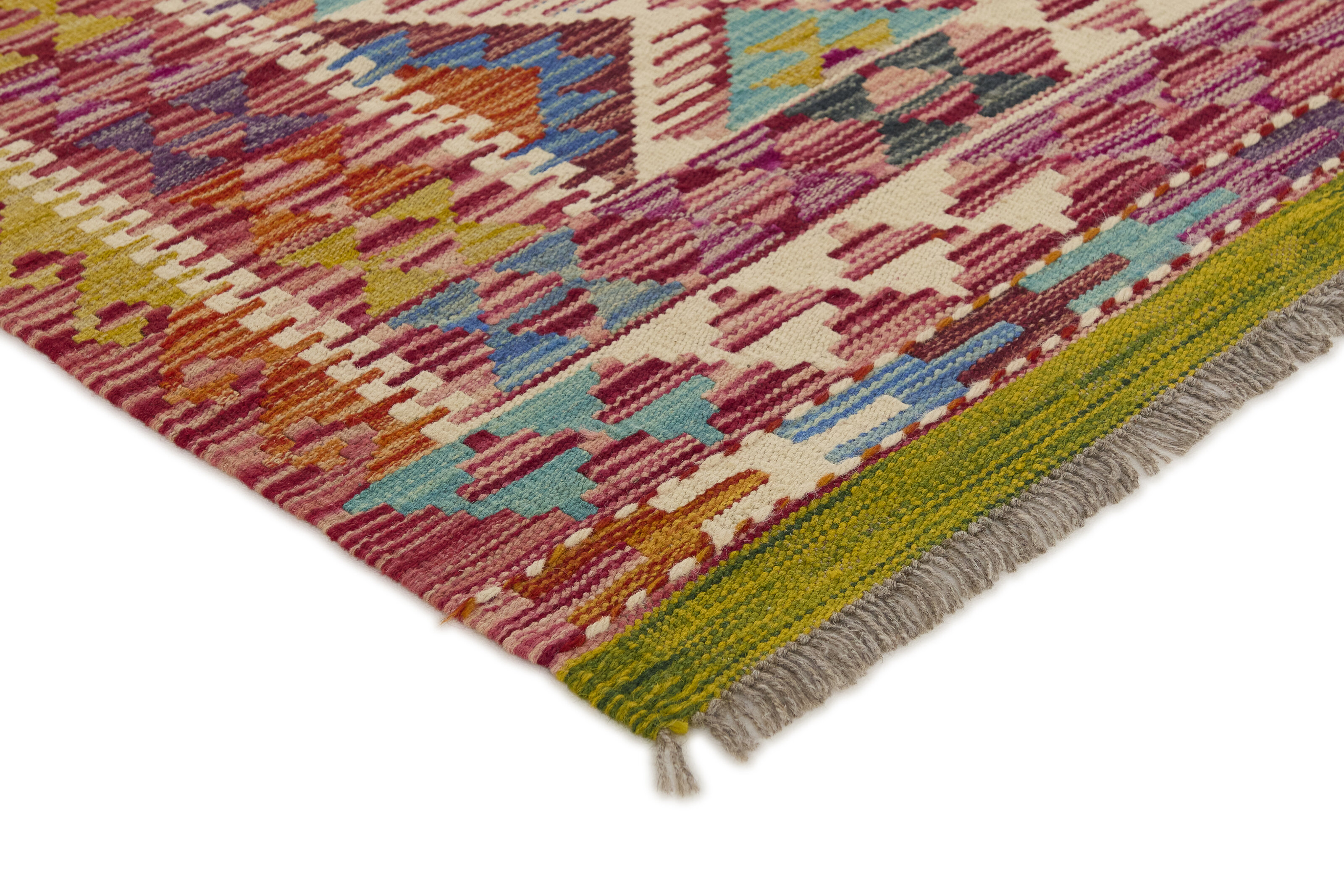 Afghan KelimItem no.: 1520531 Size: 150 cm x 192 cmAfghan Kelim rugs are hand woven by Turkmens in northern Afghanistan. Kelim is the name of a common Persian weave, but also of the technology used in the production. Kelims are primarily produced by nomads and are pile-less rugs, which are also used for bags, as wall decoration, or as curtains for tents. A natural colour scale with geometrical symbols and octagons is used.