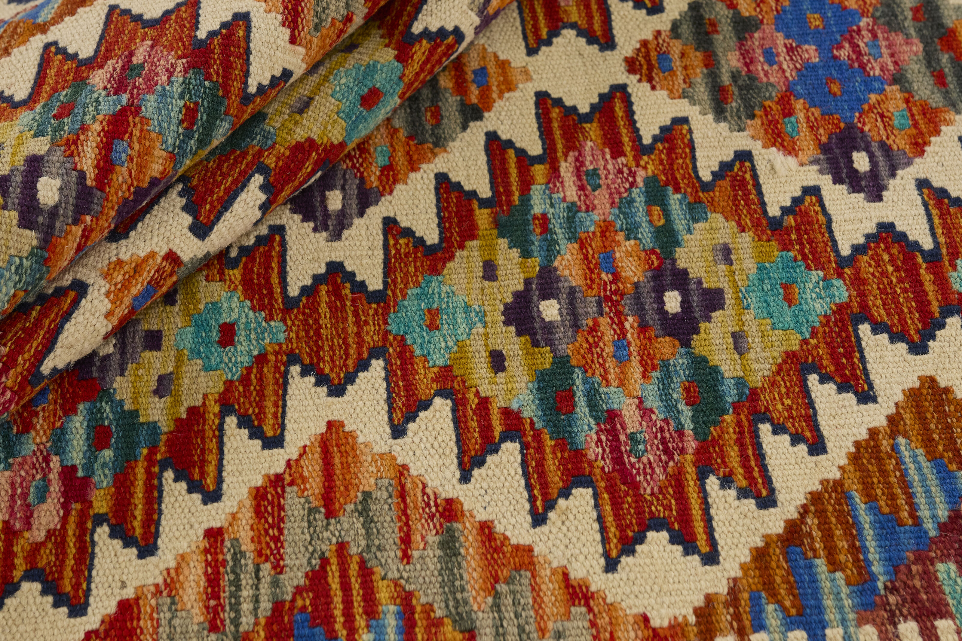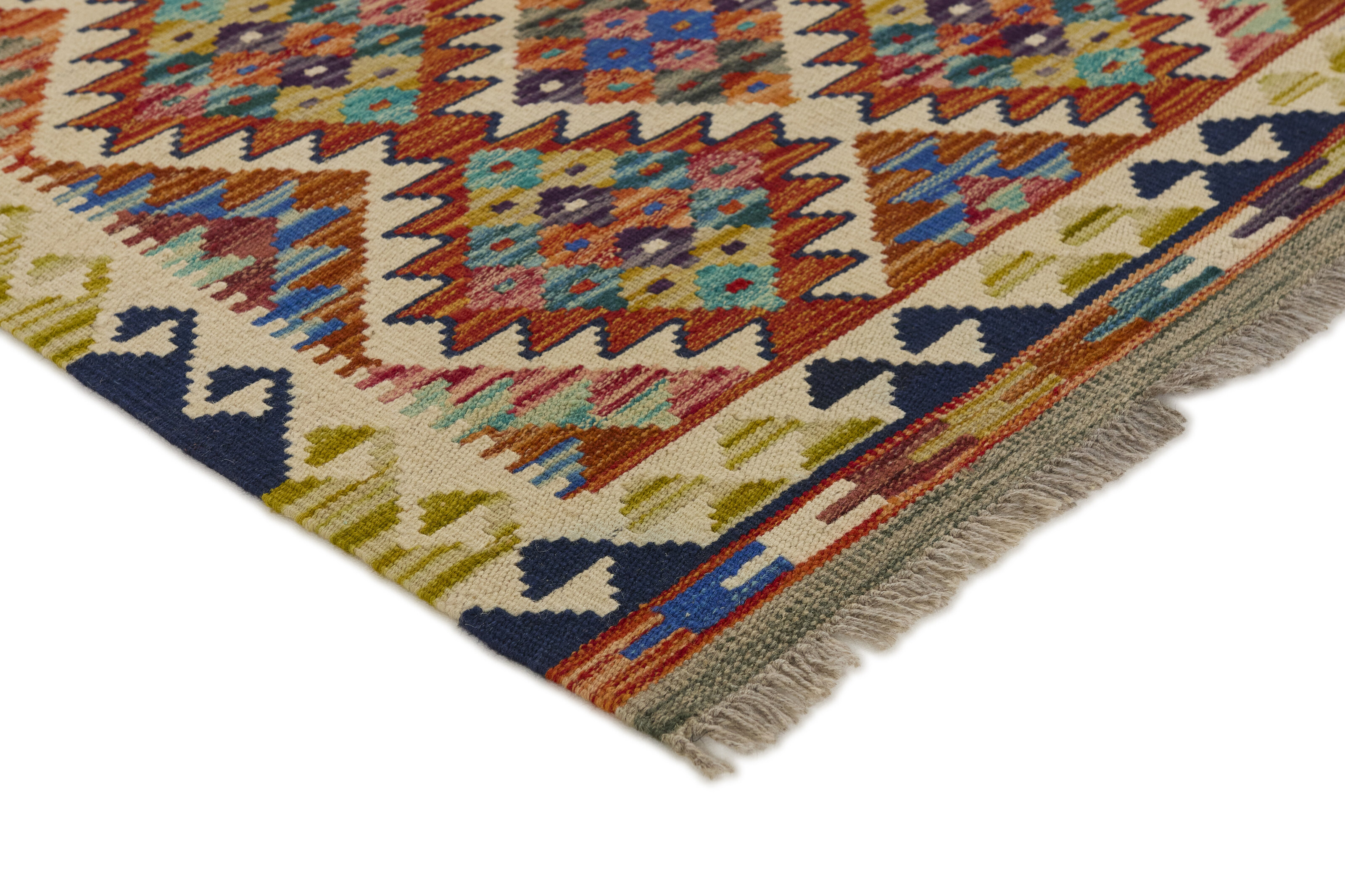 Afghan KelimItem no.: 1520564 Size: 80 cm x 177 cmAfghan Kelim rugs are hand woven by Turkmens in northern Afghanistan. Kelim is the name of a common Persian weave, but also of the technology used in the production. Kelims are primarily produced by nomads and are pile-less rugs, which are also used for bags, as wall decoration, or as curtains for tents. A natural colour scale with geometrical symbols and octagons is used.