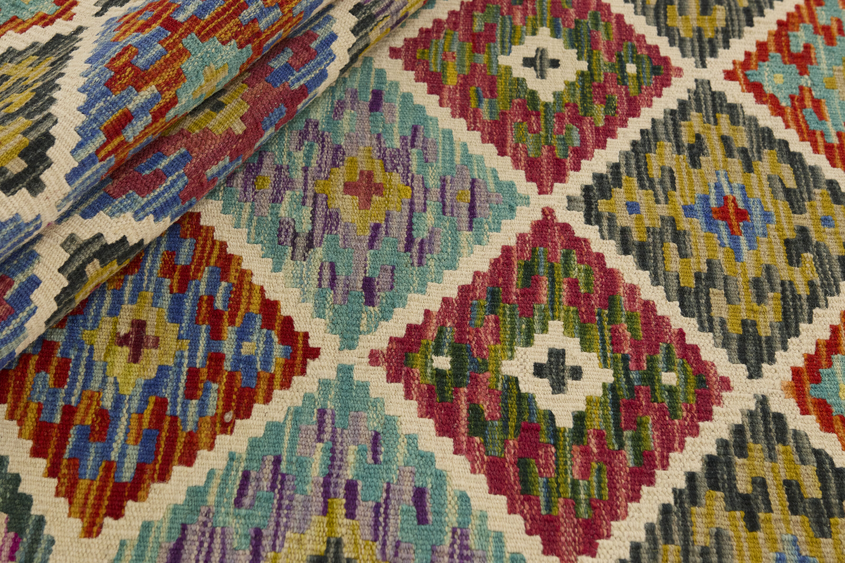 Afghan KelimItem no.: 1520565 Size: 80 cm x 191 cmAfghan Kelim rugs are hand woven by Turkmens in northern Afghanistan. Kelim is the name of a common Persian weave, but also of the technology used in the production. Kelims are primarily produced by nomads and are pile-less rugs, which are also used for bags, as wall decoration, or as curtains for tents. A natural colour scale with geometrical symbols and octagons is used.