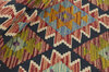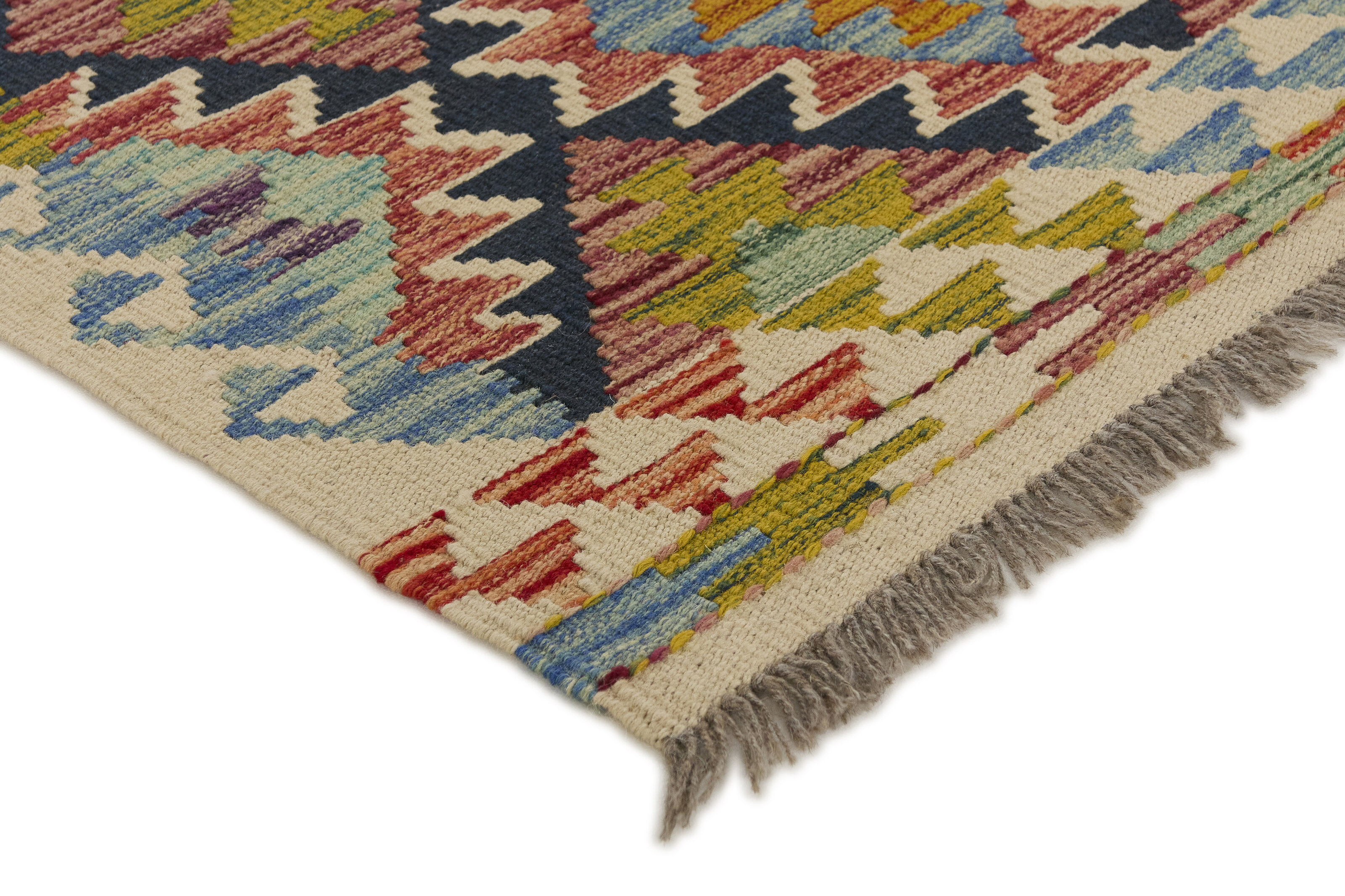 Afghan KelimItem no.: 1520572 Size: 81 cm x 203 cmAfghan Kelim rugs are hand woven by Turkmens in northern Afghanistan. Kelim is the name of a common Persian weave, but also of the technology used in the production. Kelims are primarily produced by nomads and are pile-less rugs, which are also used for bags, as wall decoration, or as curtains for tents. A natural colour scale with geometrical symbols and octagons is used.
