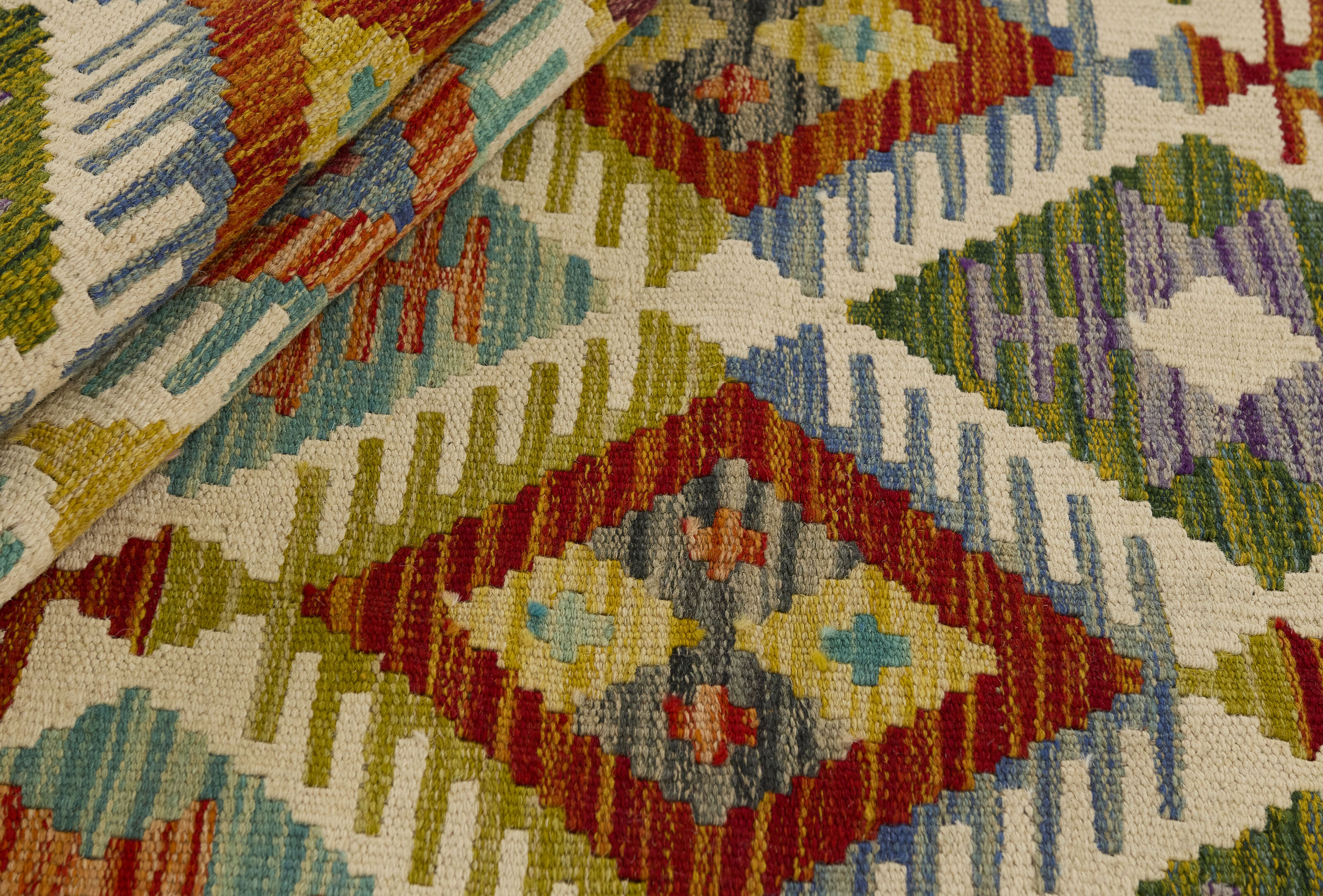 Afghan KelimItem no.: 1520583 Size: 82 cm x 196 cmAfghan Kelim rugs are hand woven by Turkmens in northern Afghanistan. Kelim is the name of a common Persian weave, but also of the technology used in the production. Kelims are primarily produced by nomads and are pile-less rugs, which are also used for bags, as wall decoration, or as curtains for tents. A natural colour scale with geometrical symbols and octagons is used.