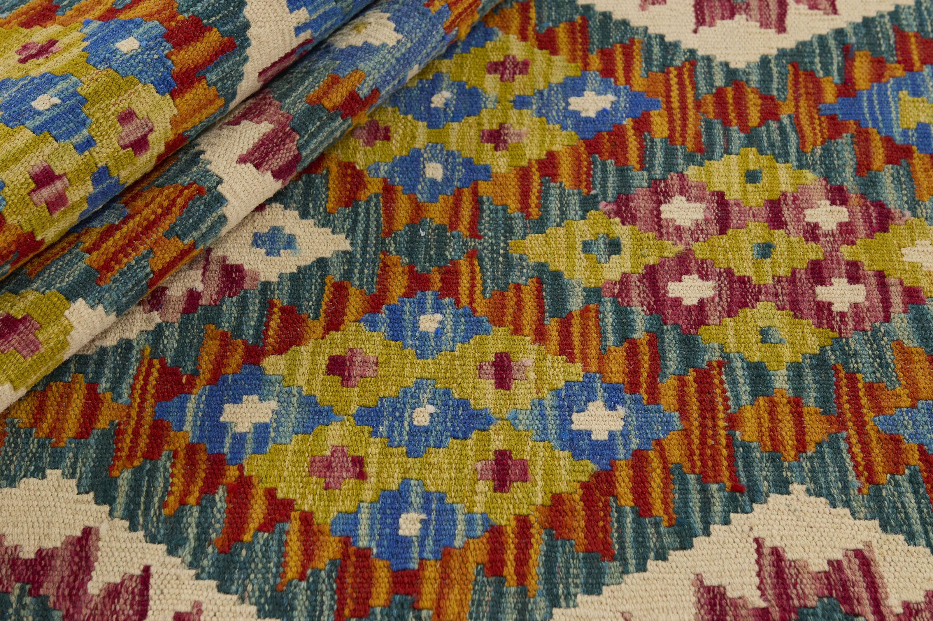 Afghan KelimItem no.: 1520596 Size: 87 cm x 197 cmAfghan Kelim rugs are hand woven by Turkmens in northern Afghanistan. Kelim is the name of a common Persian weave, but also of the technology used in the production. Kelims are primarily produced by nomads and are pile-less rugs, which are also used for bags, as wall decoration, or as curtains for tents. A natural colour scale with geometrical symbols and octagons is used.