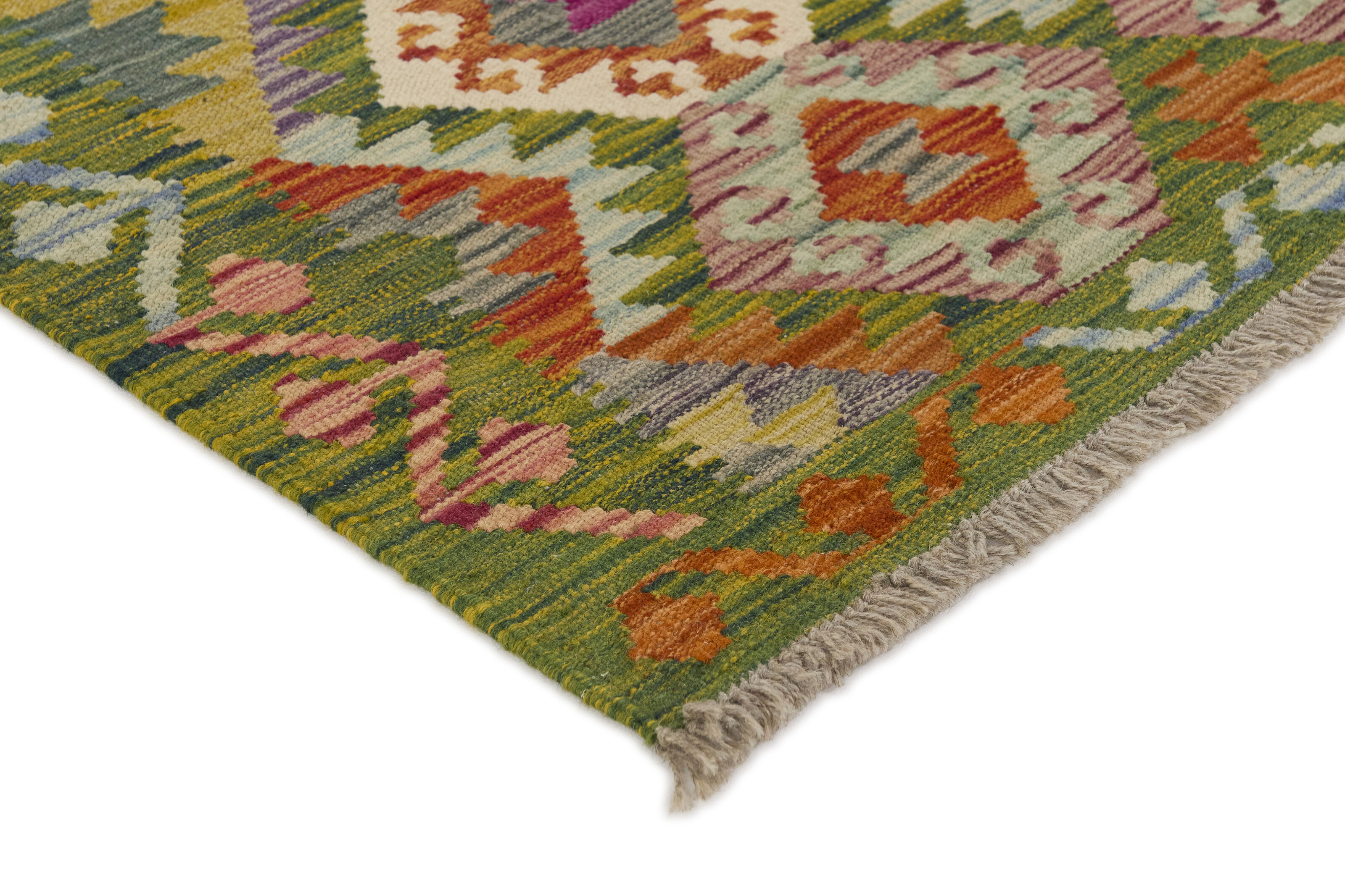 Afghan KelimItem no.: 1520610 Size: 90 cm x 305 cmAfghan Kelim rugs are hand woven by Turkmens in northern Afghanistan. Kelim is the name of a common Persian weave, but also of the technology used in the production. Kelims are primarily produced by nomads and are pile-less rugs, which are also used for bags, as wall decoration, or as curtains for tents. A natural colour scale with geometrical symbols and octagons is used.