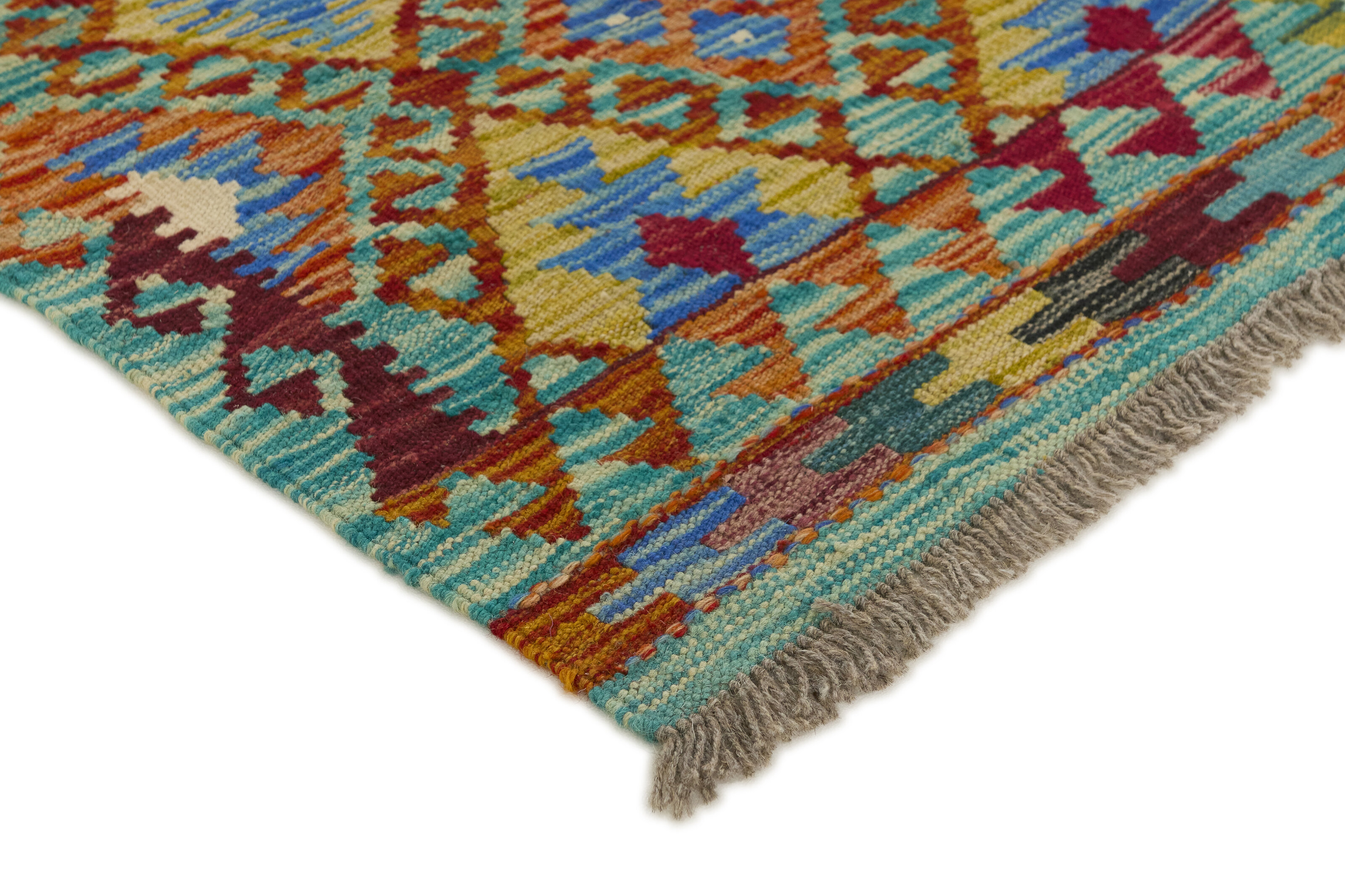 Afghan KelimItem no.: 1520639 Size: 66 cm x 149 cmAfghan Kelim rugs are hand woven by Turkmens in northern Afghanistan. Kelim is the name of a common Persian weave, but also of the technology used in the production. Kelims are primarily produced by nomads and are pile-less rugs, which are also used for bags, as wall decoration, or as curtains for tents. A natural colour scale with geometrical symbols and octagons is used.