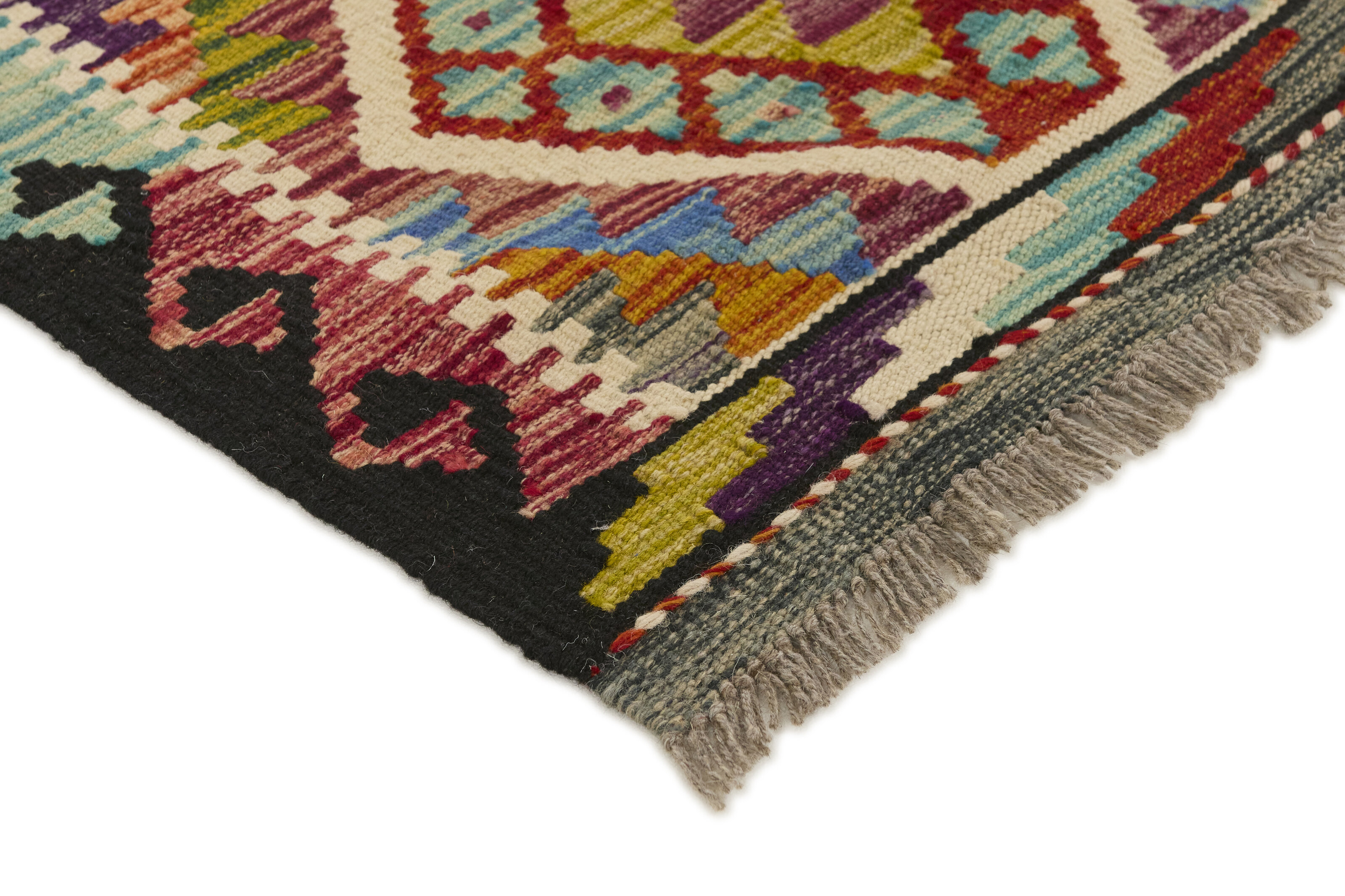 Afghan KelimItem no.: 1520640 Size: 63 cm x 151 cmAfghan Kelim rugs are hand woven by Turkmens in northern Afghanistan. Kelim is the name of a common Persian weave, but also of the technology used in the production. Kelims are primarily produced by nomads and are pile-less rugs, which are also used for bags, as wall decoration, or as curtains for tents. A natural colour scale with geometrical symbols and octagons is used.