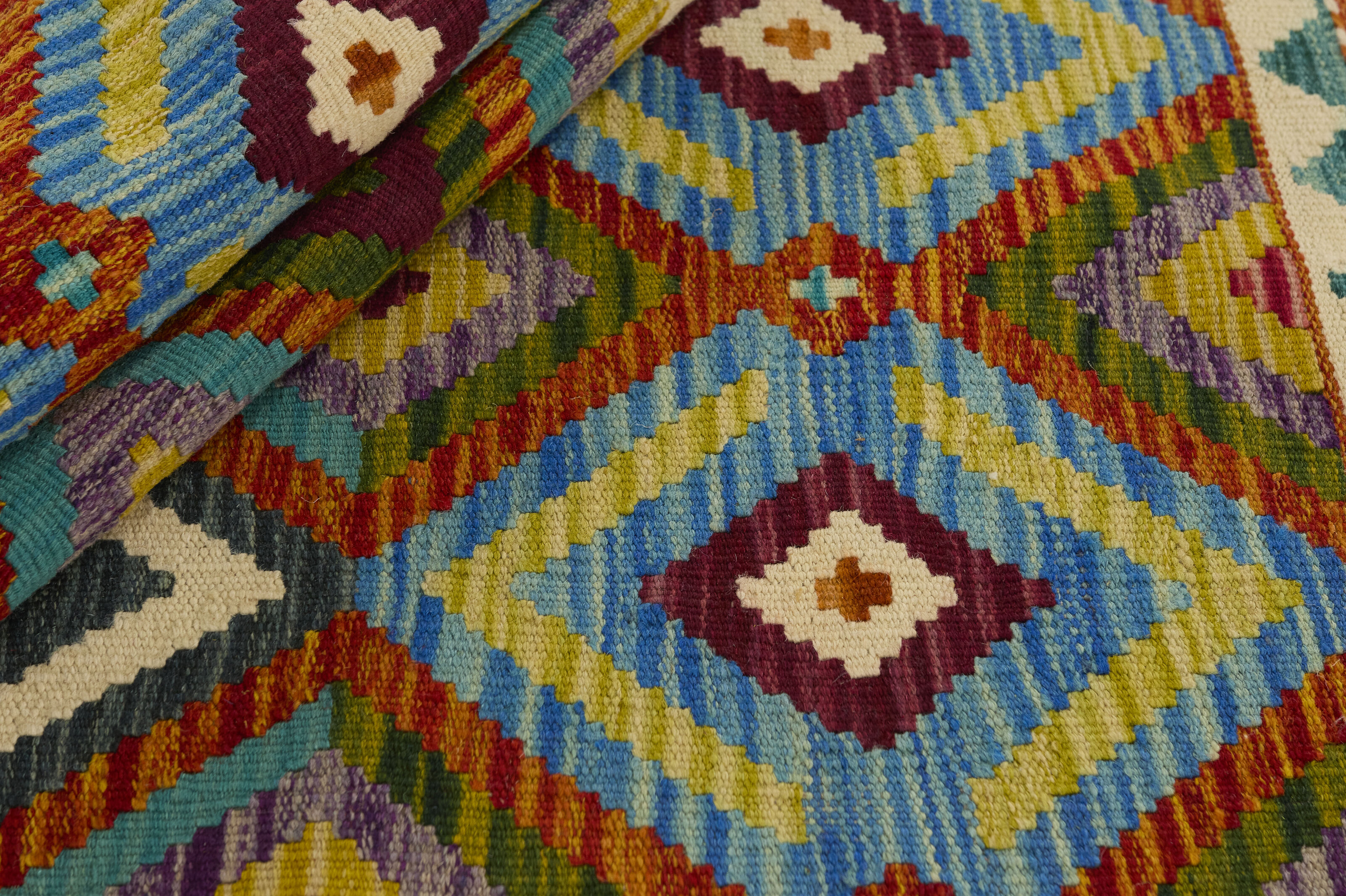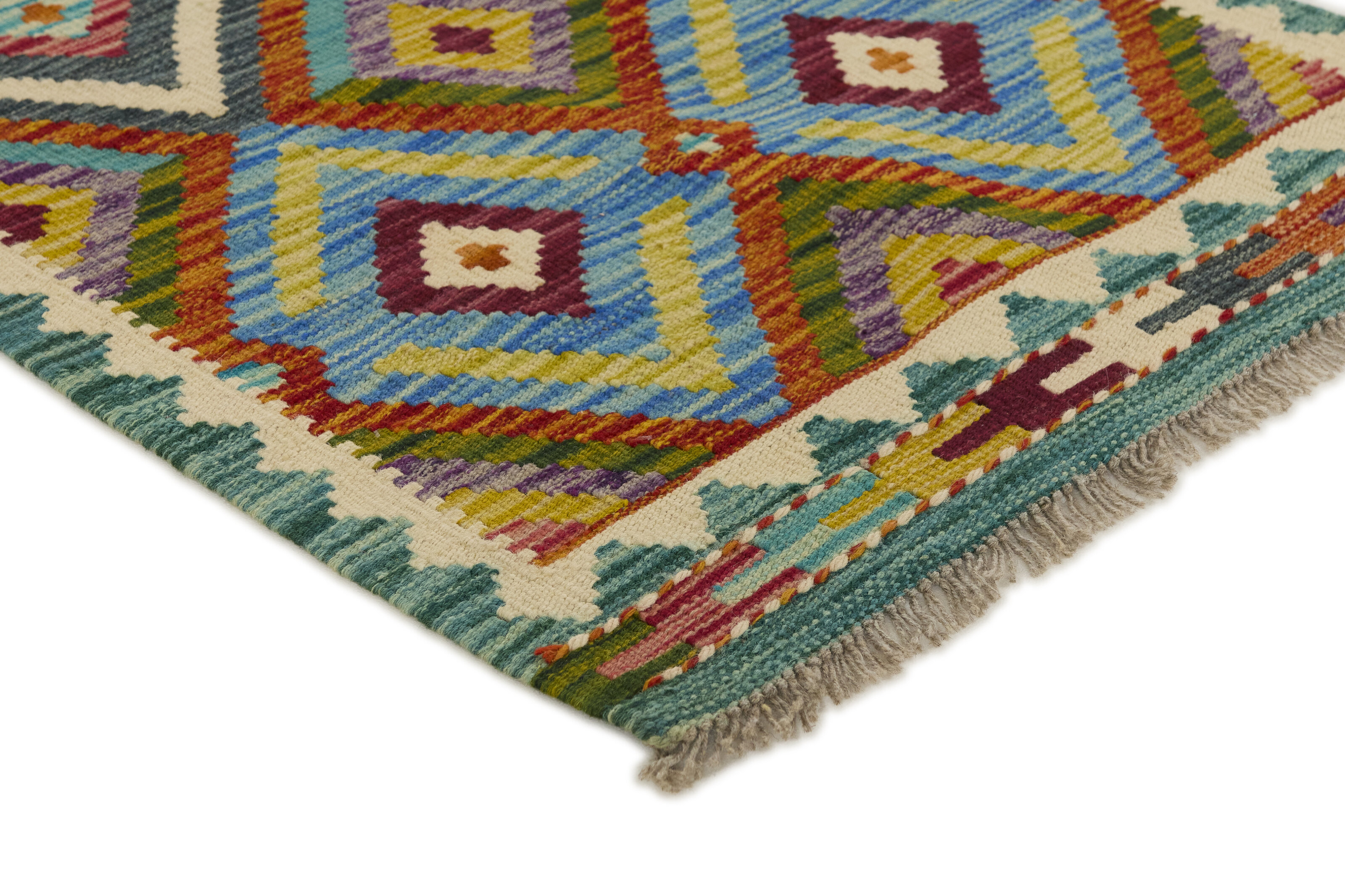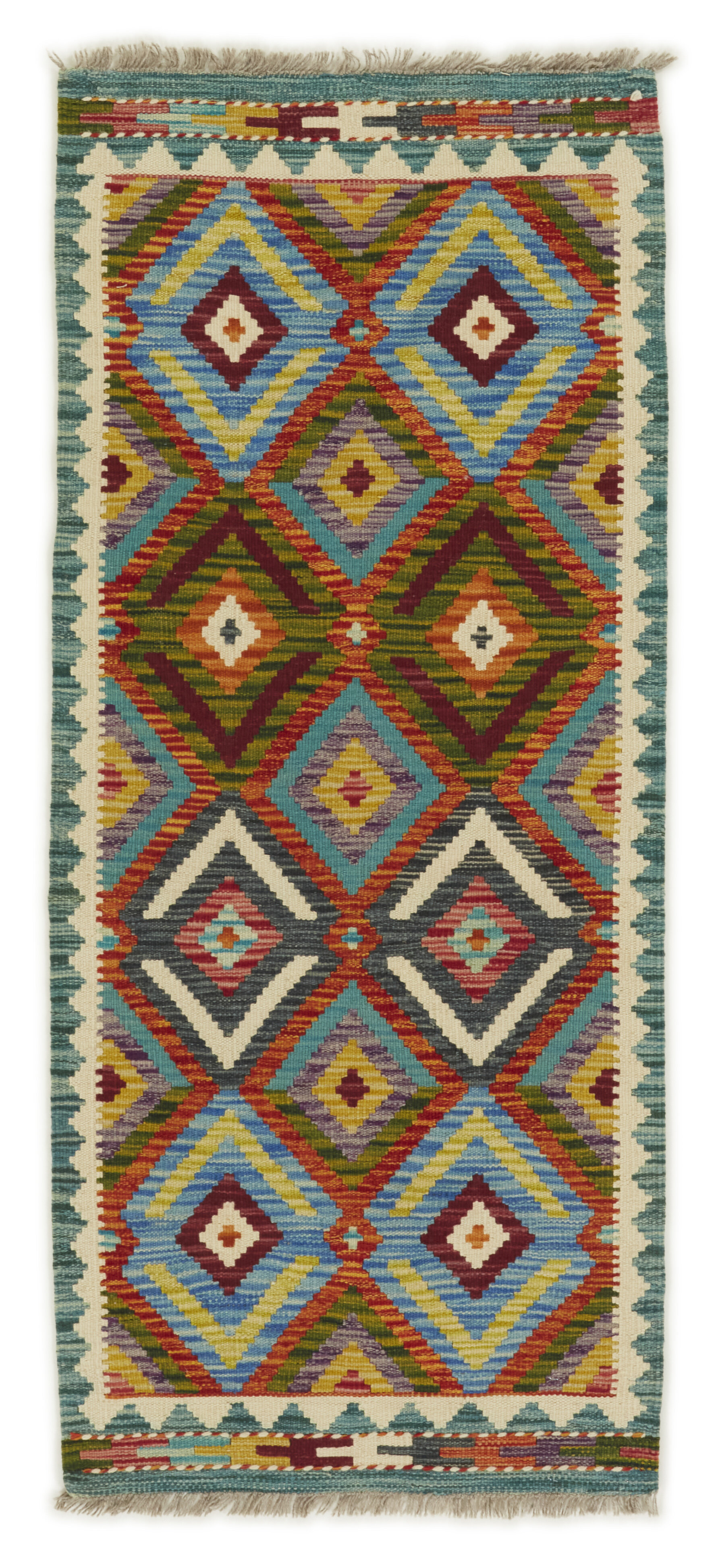 Afghan KelimItem no.: 1520641 Size: 63 cm x 154 cmAfghan Kelim rugs are hand woven by Turkmens in northern Afghanistan. Kelim is the name of a common Persian weave, but also of the technology used in the production. Kelims are primarily produced by nomads and are pile-less rugs, which are also used for bags, as wall decoration, or as curtains for tents. A natural colour scale with geometrical symbols and octagons is used.