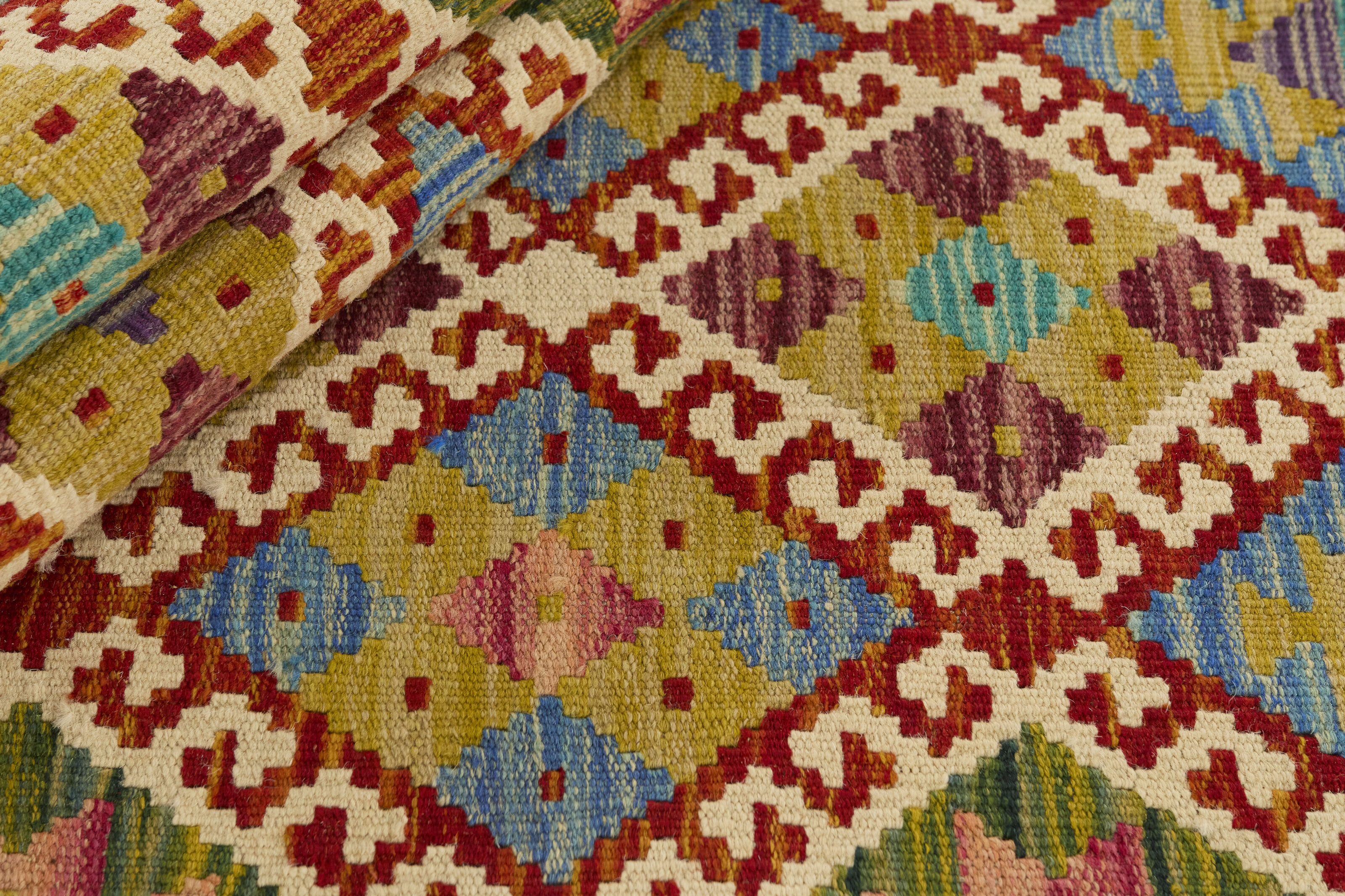 Afghan KelimItem no.: 1520662 Size: 61 cm x 145 cmAfghan Kelim rugs are hand woven by Turkmens in northern Afghanistan. Kelim is the name of a common Persian weave, but also of the technology used in the production. Kelims are primarily produced by nomads and are pile-less rugs, which are also used for bags, as wall decoration, or as curtains for tents. A natural colour scale with geometrical symbols and octagons is used.