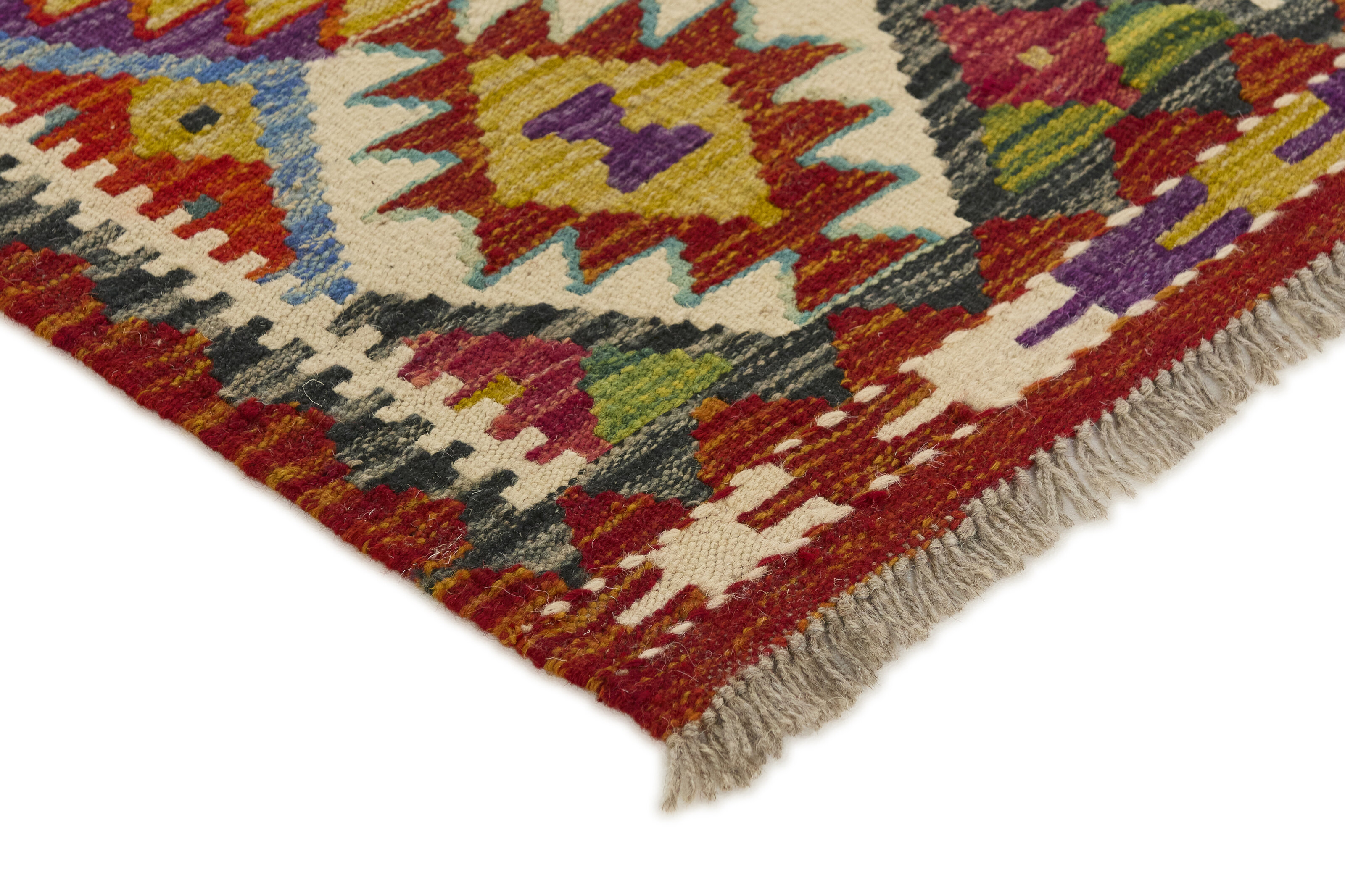 Afghan KelimItem no.: 1520665 Size: 62 cm x 153 cmAfghan Kelim rugs are hand woven by Turkmens in northern Afghanistan. Kelim is the name of a common Persian weave, but also of the technology used in the production. Kelims are primarily produced by nomads and are pile-less rugs, which are also used for bags, as wall decoration, or as curtains for tents. A natural colour scale with geometrical symbols and octagons is used.