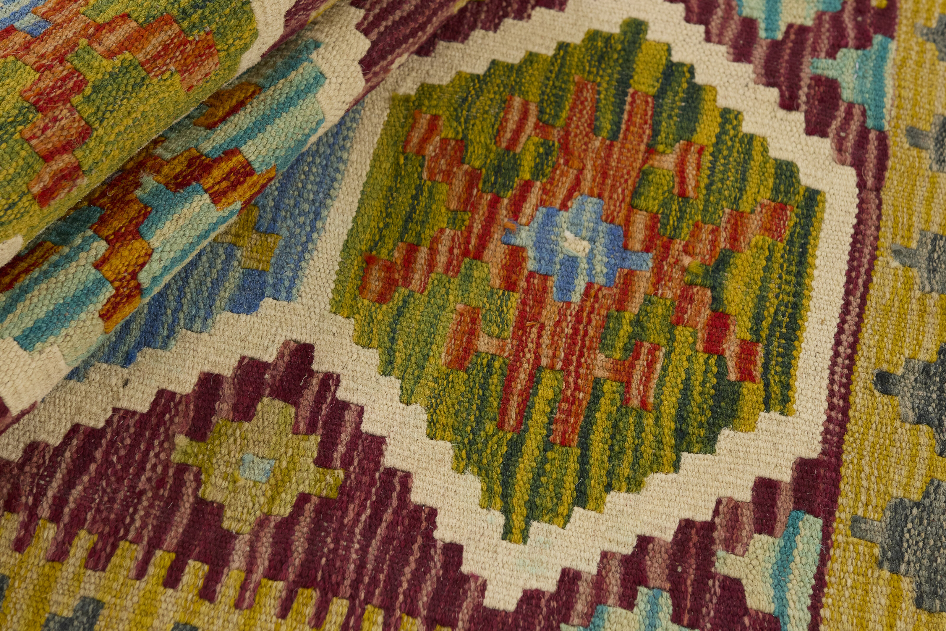 Afghan KelimItem no.: 1520667 Size: 50 cm x 152 cmAfghan Kelim rugs are hand woven by Turkmens in northern Afghanistan. Kelim is the name of a common Persian weave, but also of the technology used in the production. Kelims are primarily produced by nomads and are pile-less rugs, which are also used for bags, as wall decoration, or as curtains for tents. A natural colour scale with geometrical symbols and octagons is used.