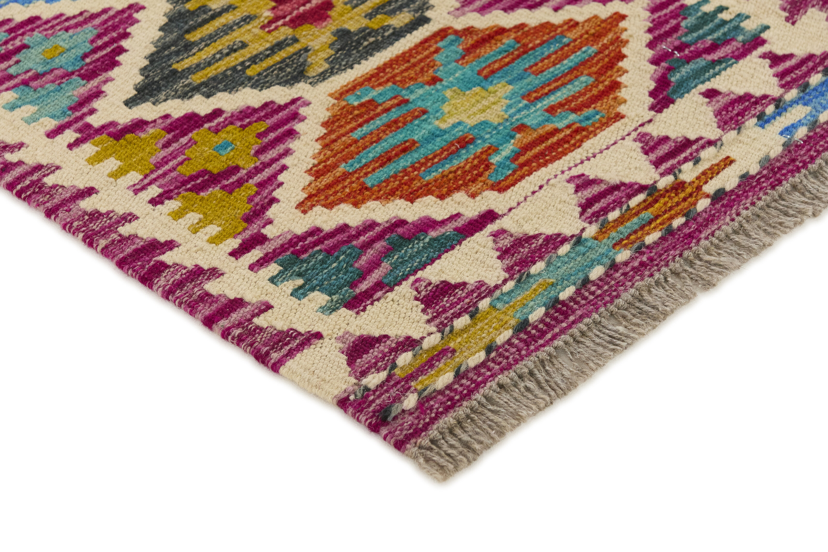 Afghan KelimItem no.: 1520668 Size: 44 cm x 145 cmAfghan Kelim rugs are hand woven by Turkmens in northern Afghanistan. Kelim is the name of a common Persian weave, but also of the technology used in the production. Kelims are primarily produced by nomads and are pile-less rugs, which are also used for bags, as wall decoration, or as curtains for tents. A natural colour scale with geometrical symbols and octagons is used.