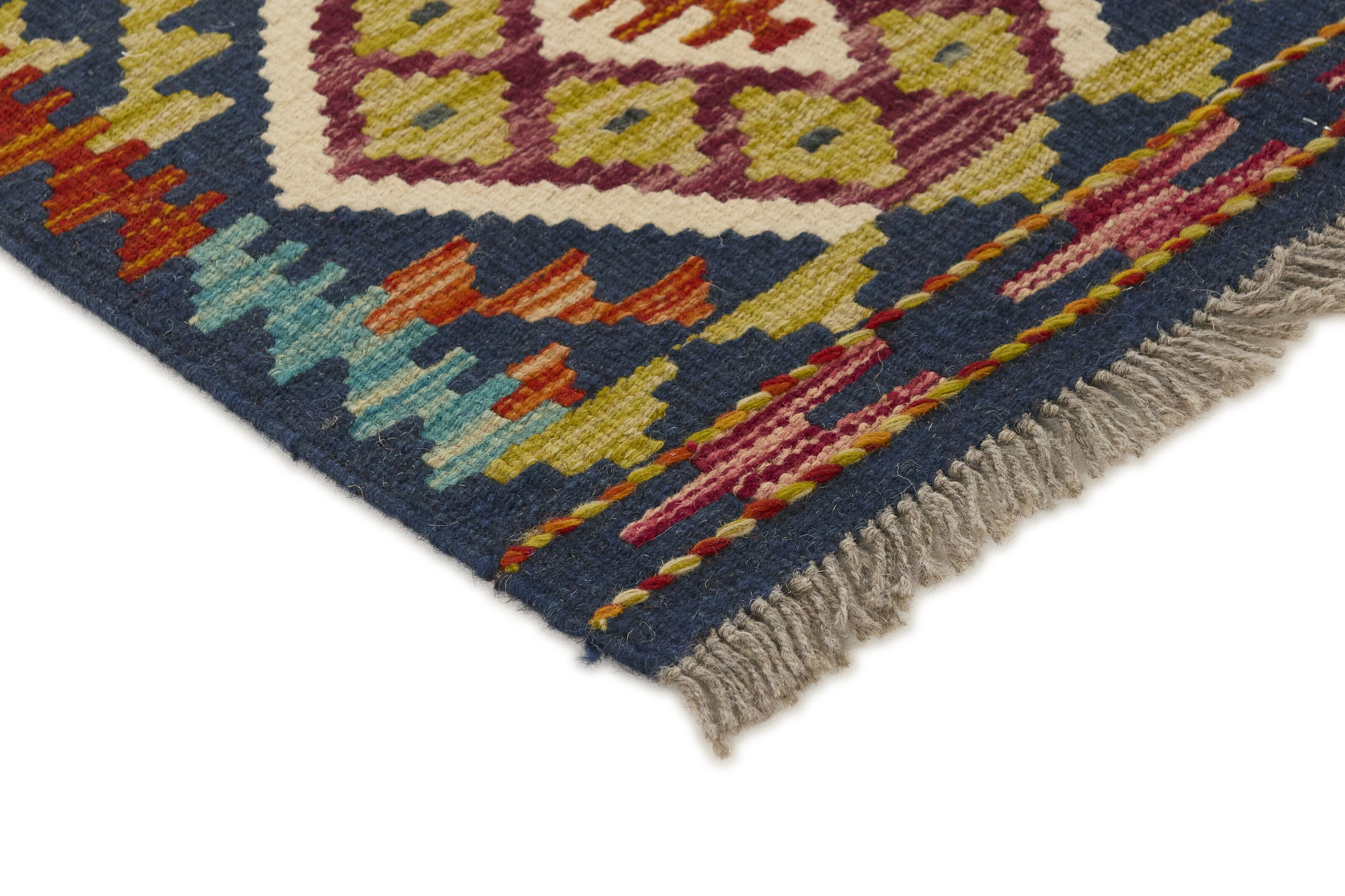 Afghan KelimItem no.: 1520680 Size: 43 cm x 149 cmAfghan Kelim rugs are hand woven by Turkmens in northern Afghanistan. Kelim is the name of a common Persian weave, but also of the technology used in the production. Kelims are primarily produced by nomads and are pile-less rugs, which are also used for bags, as wall decoration, or as curtains for tents. A natural colour scale with geometrical symbols and octagons is used.