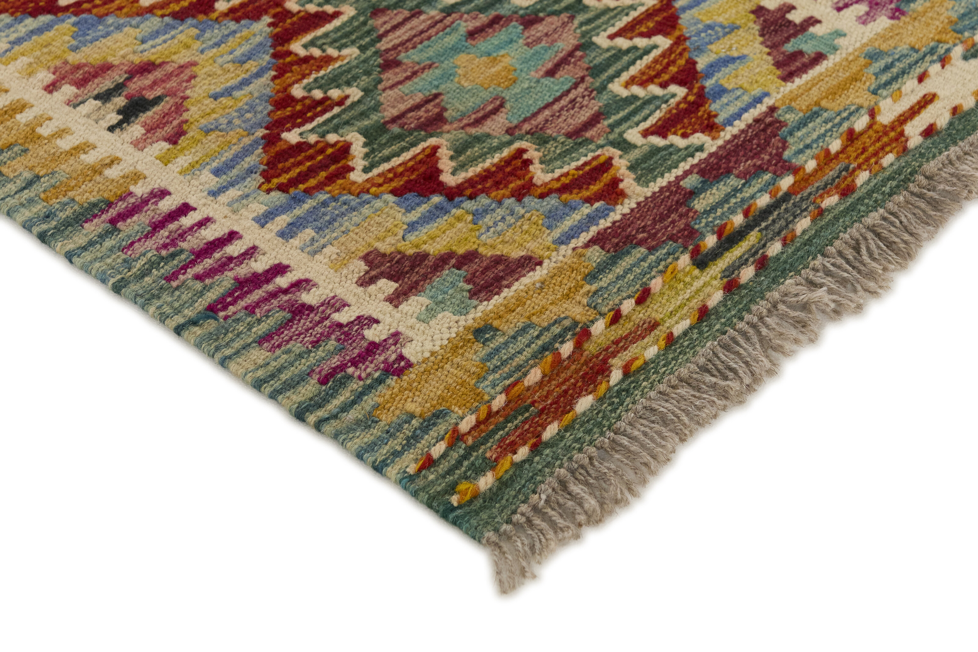 Afghan KelimItem no.: 1520682 Size: 44 cm x 147 cmAfghan Kelim rugs are hand woven by Turkmens in northern Afghanistan. Kelim is the name of a common Persian weave, but also of the technology used in the production. Kelims are primarily produced by nomads and are pile-less rugs, which are also used for bags, as wall decoration, or as curtains for tents. A natural colour scale with geometrical symbols and octagons is used.