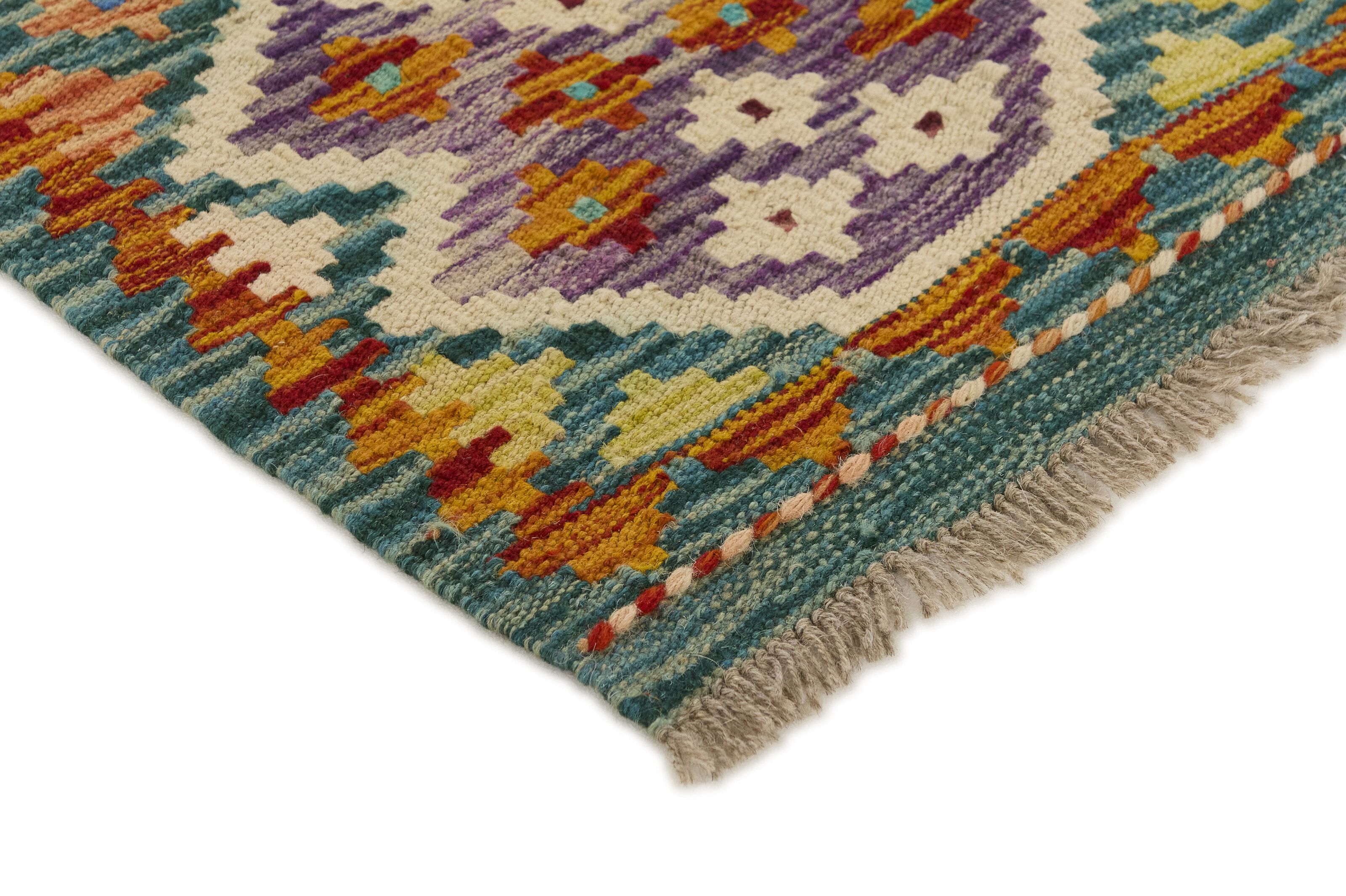 Afghan KelimItem no.: 1520685 Size: 46 cm x 150 cmAfghan Kelim rugs are hand woven by Turkmens in northern Afghanistan. Kelim is the name of a common Persian weave, but also of the technology used in the production. Kelims are primarily produced by nomads and are pile-less rugs, which are also used for bags, as wall decoration, or as curtains for tents. A natural colour scale with geometrical symbols and octagons is used.