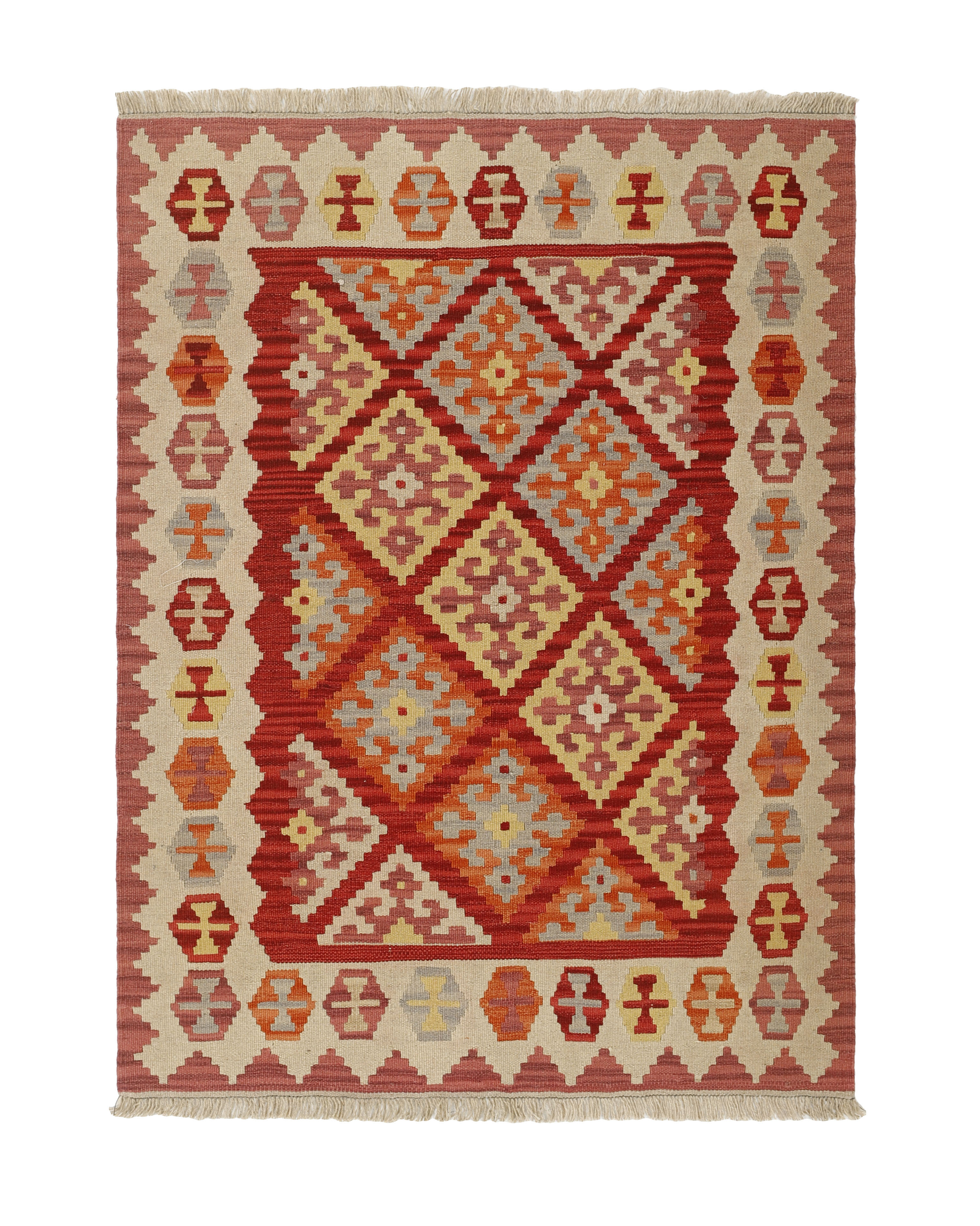 KelimItem no.: 1519259 Size: 130 cm x 177 cmThese Kelims are flat woven rugs, woven by nomads in western Persia. A special weaving technique is used, giving the rug a thinner, flatter surface, with no pile. Kelims are also quicker to produce, compared to common Oriental rugs. The colours are natural and no two rugs are alike. Kelims are produced in several regions and under many names, but the most well known Kelim types are Seneh, Sumak, Fars, and Kelim Gashghai.