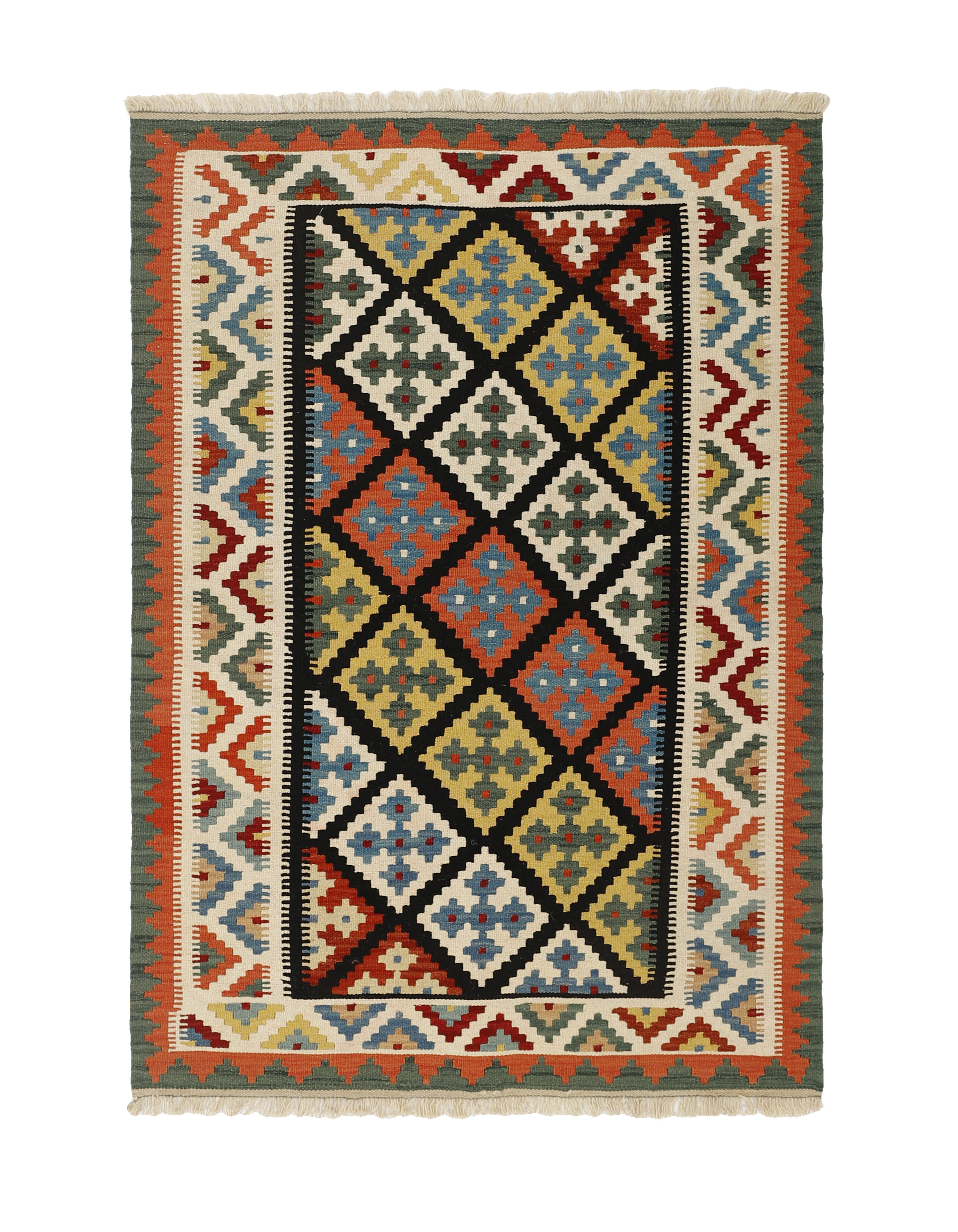 KelimItem no.: 1519300 Size: 128 cm x 181 cmThese Kelims are flat woven rugs, woven by nomads in western Persia. A special weaving technique is used, giving the rug a thinner, flatter surface, with no pile. Kelims are also quicker to produce, compared to common Oriental rugs. The colours are natural and no two rugs are alike. Kelims are produced in several regions and under many names, but the most well known Kelim types are Seneh, Sumak, Fars, and Kelim Gashghai.