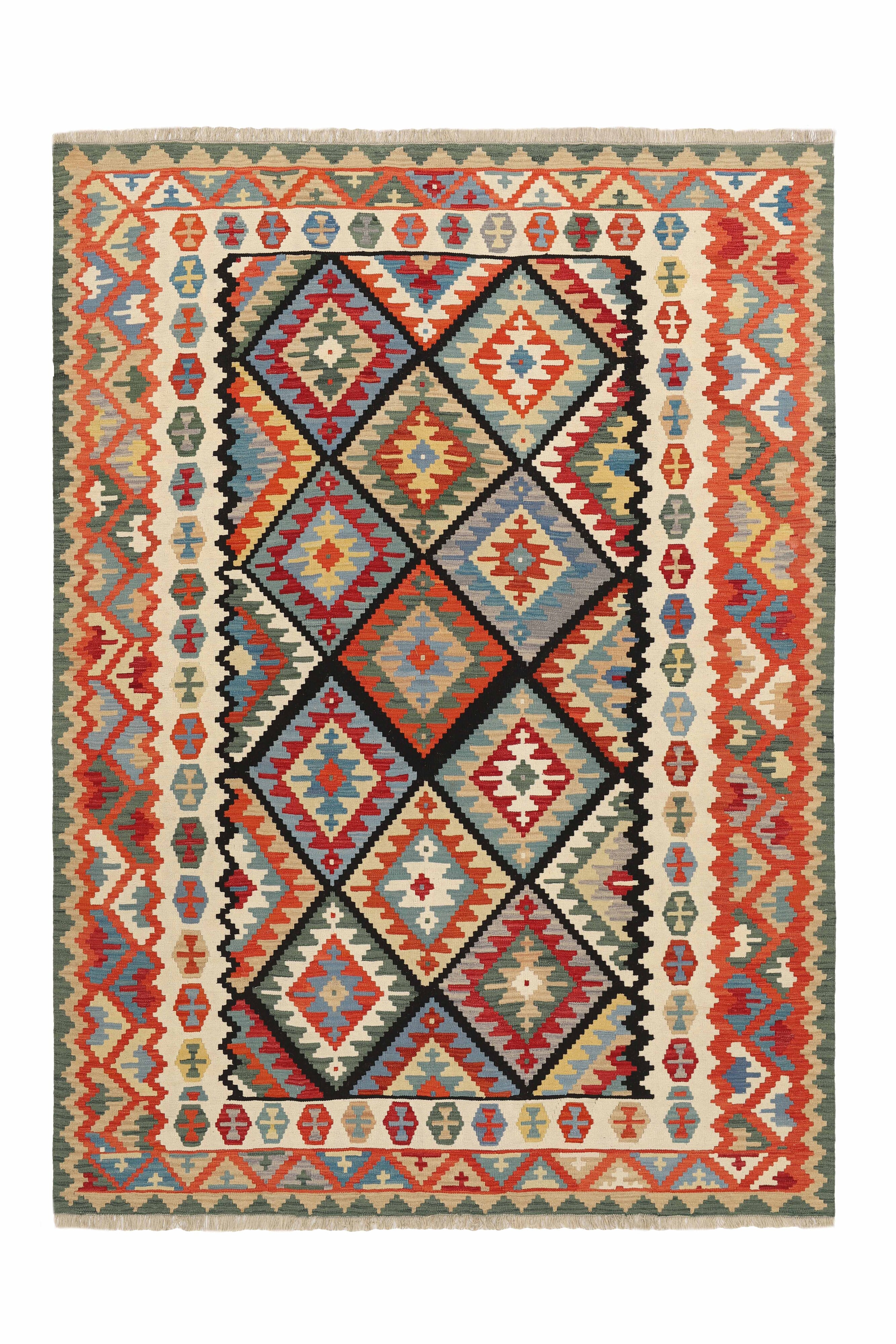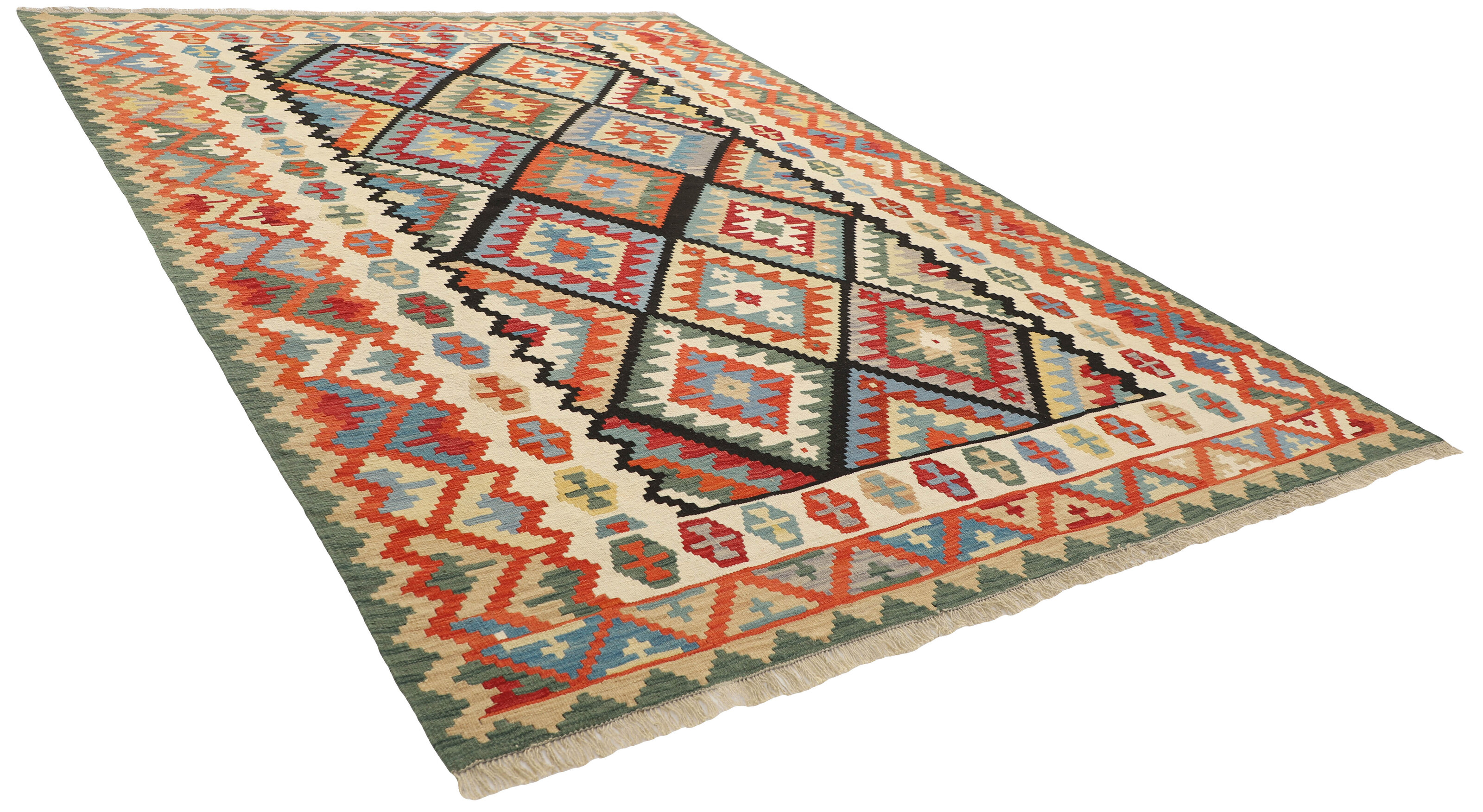 KelimItem no.: 1519377 Size: 266 cm x 362 cmThese Kelims are flat woven rugs, woven by nomads in western Persia. A special weaving technique is used, giving the rug a thinner, flatter surface, with no pile. Kelims are also quicker to produce, compared to common Oriental rugs. The colours are natural and no two rugs are alike. Kelims are produced in several regions and under many names, but the most well known Kelim types are Seneh, Sumak, Fars, and Kelim Gashghai.
