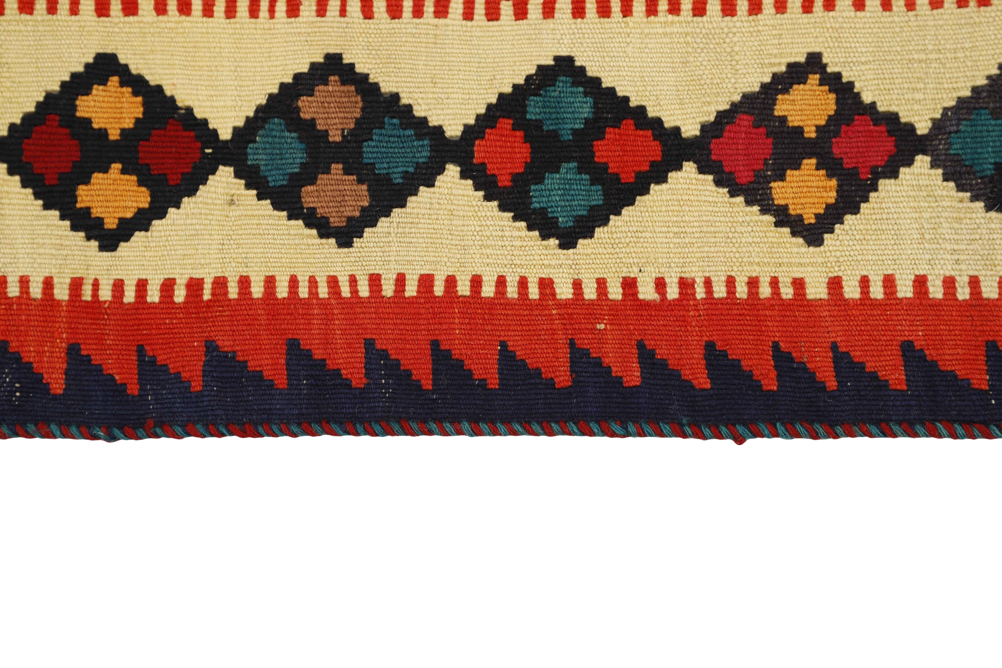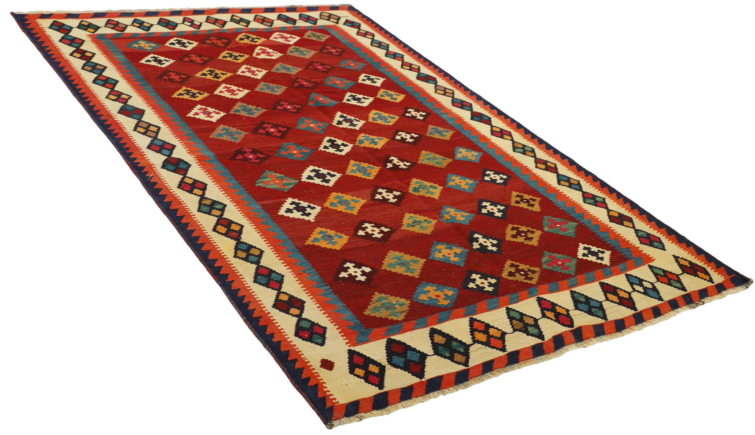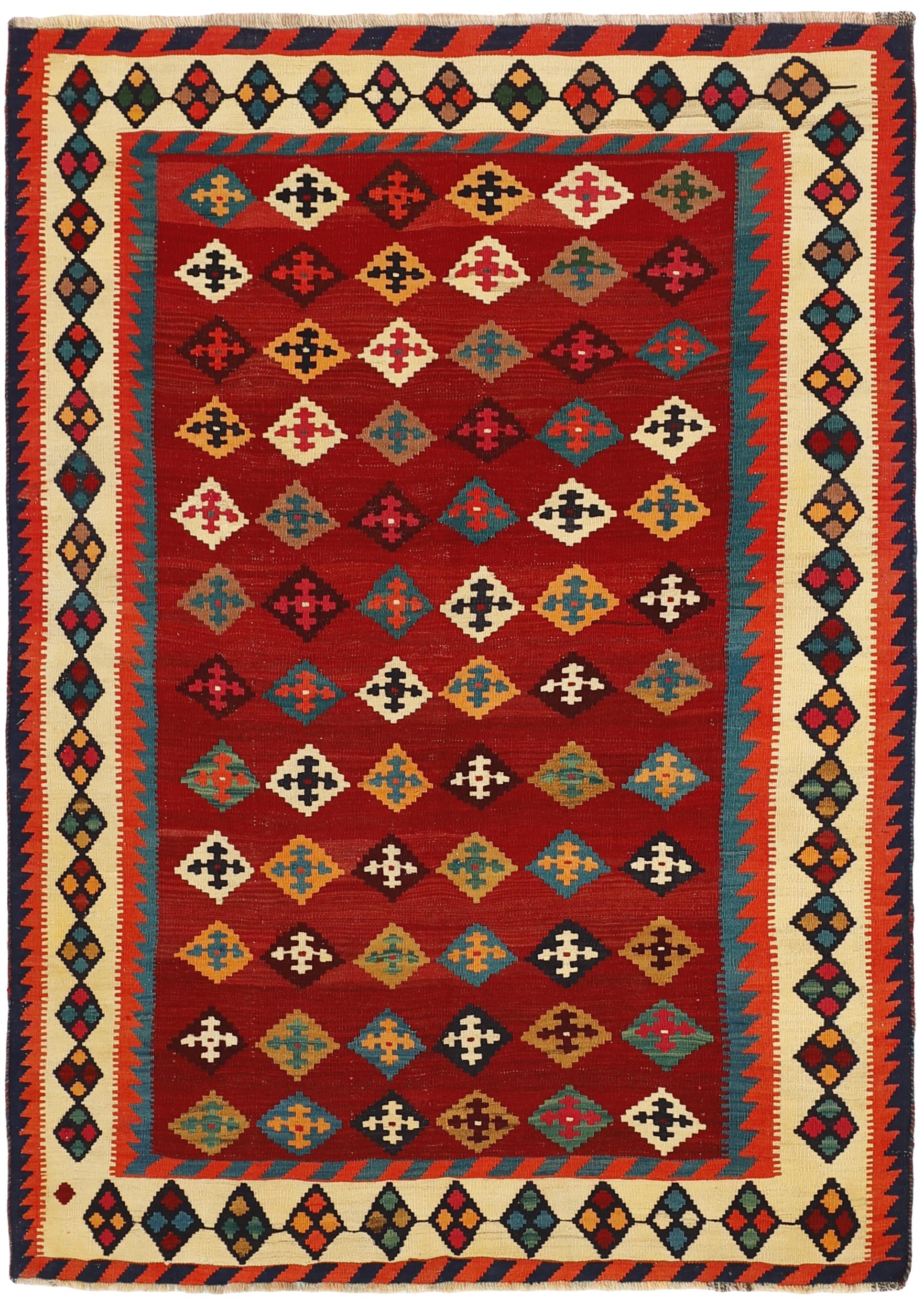 Kelim OldItem no.: 1486880 Size: 154 cm x 220 cmPersian Kelim Old are often oblong, and were originally used in tents by the nomads. Kelim rugs are often placed on top of other rugs as insulation. The rugs are often up to 50 years old, sometimes more than 80 years. The nomads knot or weave the rugs they need themselves, and use them for many different purposes, such as saddlebags for camels and donkeys, but they are mostly used for motorbikes, storing clothes, for sitting on, and as sleeping blankets.