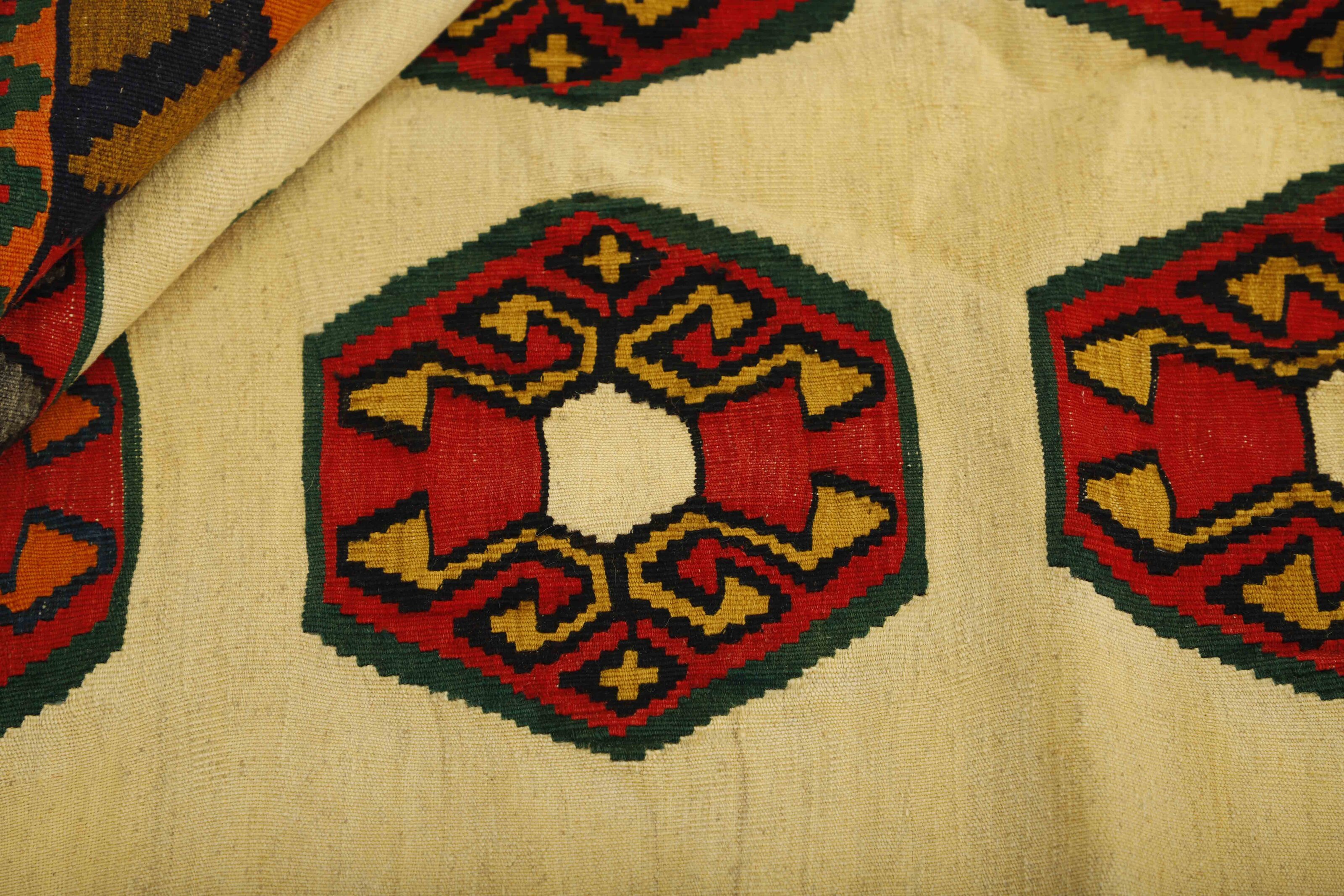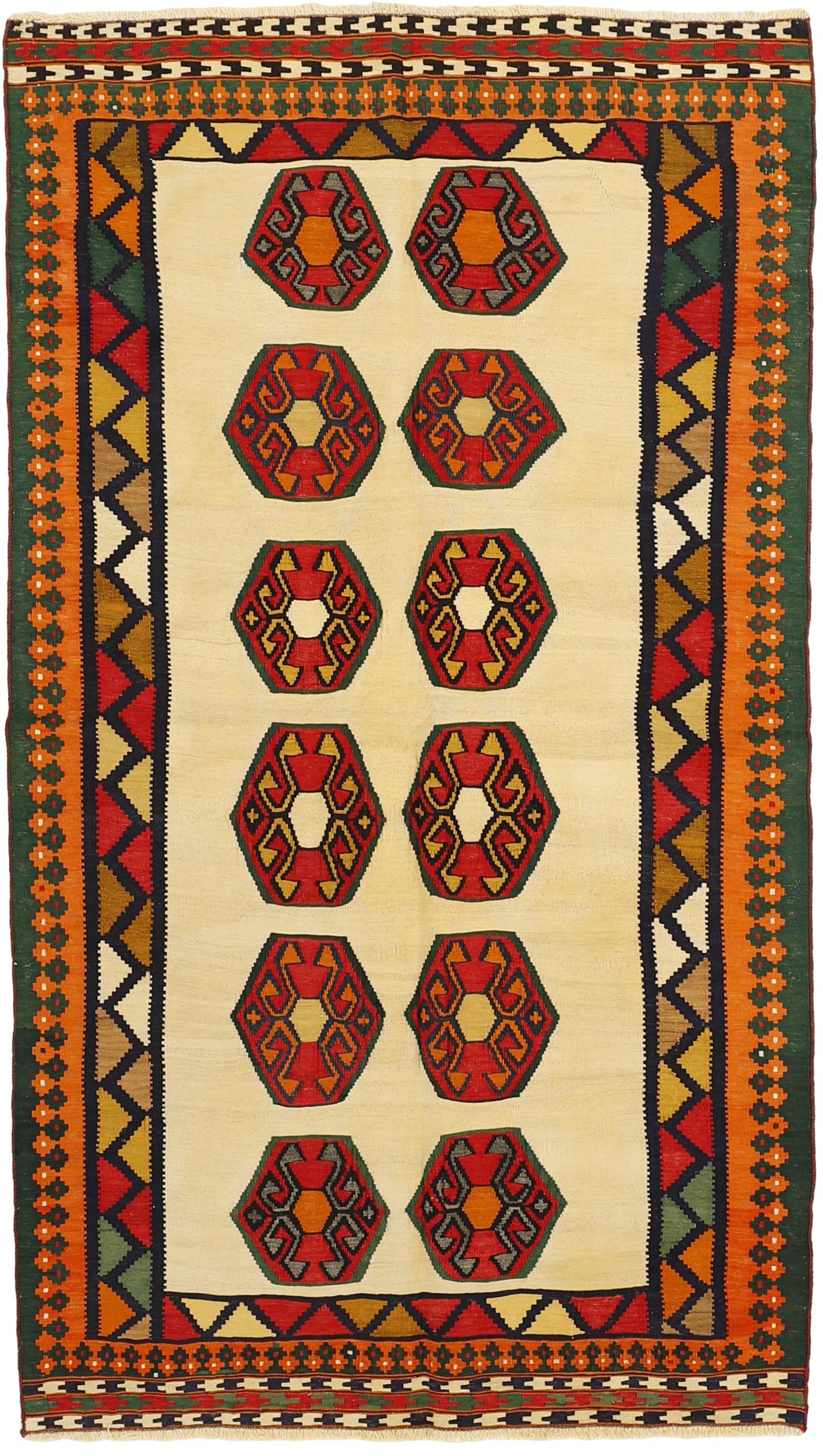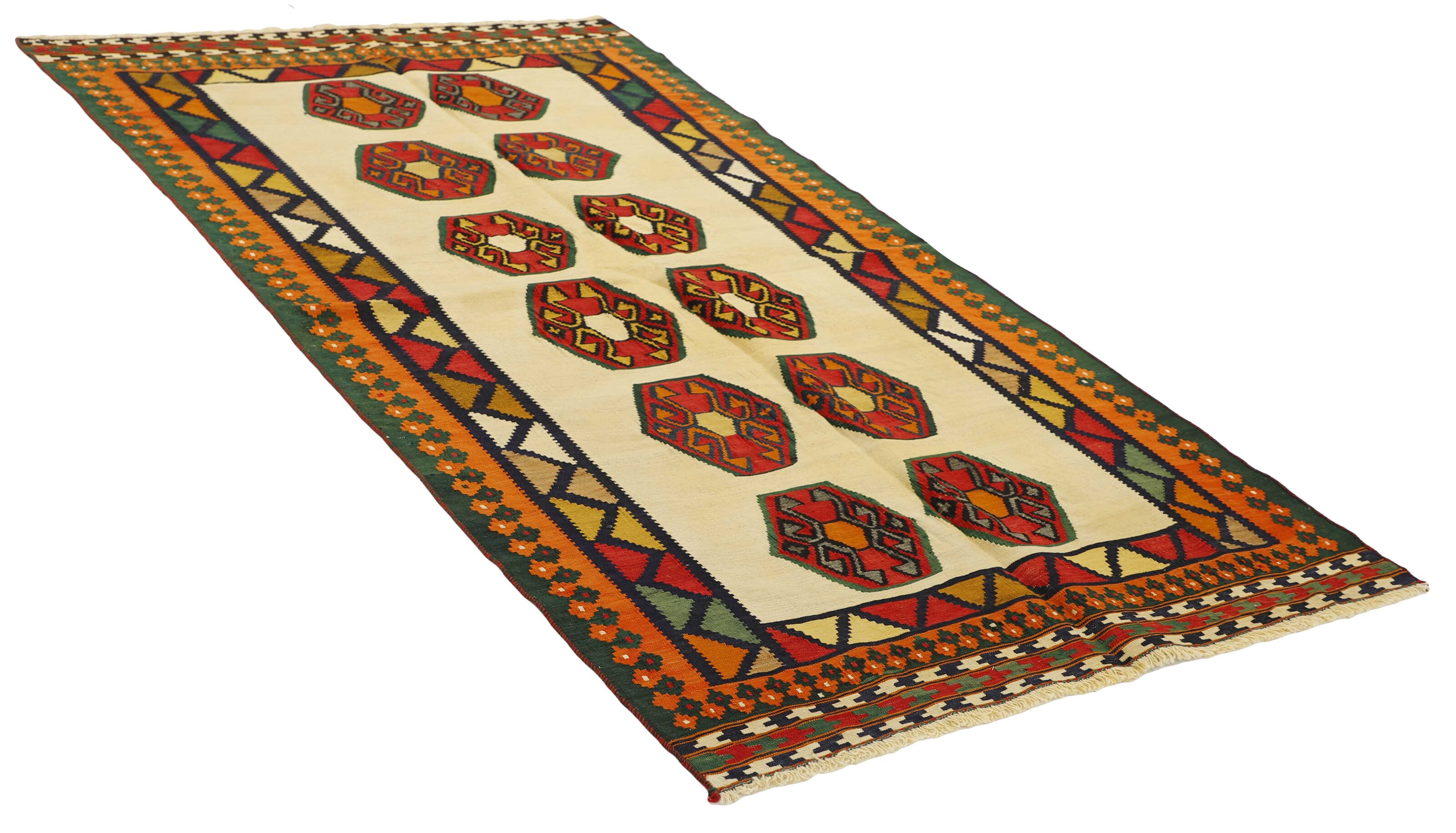 Kelim OldItem no.: 1486884 Size: 133 cm x 235 cmPersian Kelim Old are often oblong, and were originally used in tents by the nomads. Kelim rugs are often placed on top of other rugs as insulation. The rugs are often up to 50 years old, sometimes more than 80 years. The nomads knot or weave the rugs they need themselves, and use them for many different purposes, such as saddlebags for camels and donkeys, but they are mostly used for motorbikes, storing clothes, for sitting on, and as sleeping blankets.