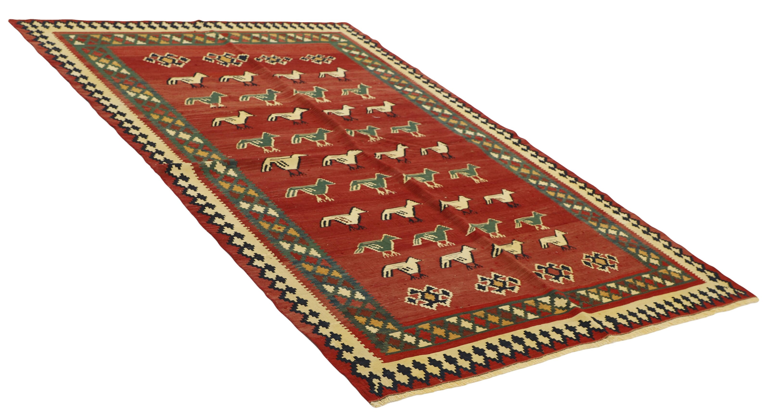 Kelim OldItem no.: 1486895 Size: 152 cm x 236 cmPersian Kelim Old are often oblong, and were originally used in tents by the nomads. Kelim rugs are often placed on top of other rugs as insulation. The rugs are often up to 50 years old, sometimes more than 80 years. The nomads knot or weave the rugs they need themselves, and use them for many different purposes, such as saddlebags for camels and donkeys, but they are mostly used for motorbikes, storing clothes, for sitting on, and as sleeping blankets.