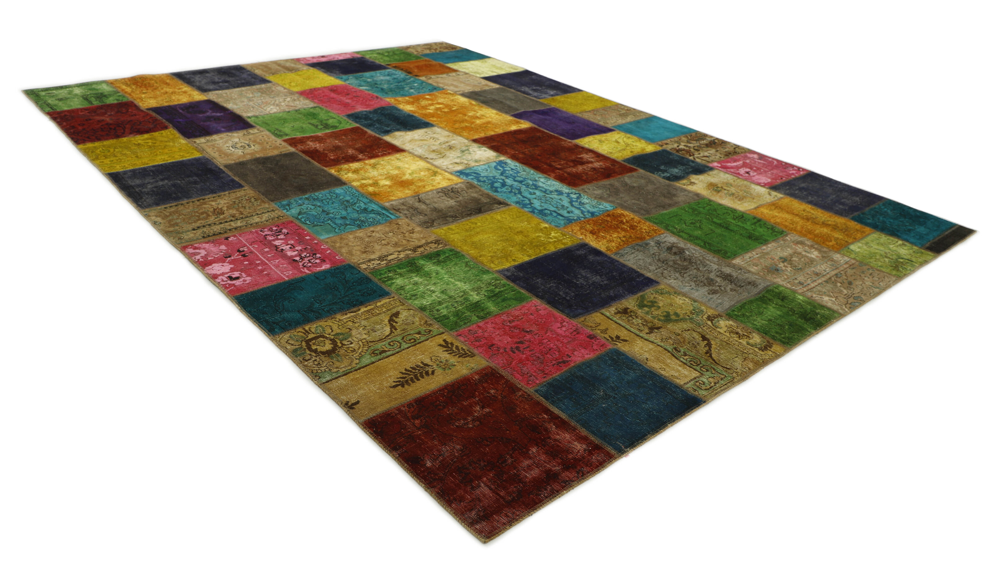 Vintage PatchworkItem no.: 1495656 Size: 307 cm x 412 cmVintage Royals are antique hand knotted rugs of Persian origin. The Patchwork Collection consists of old rugs that have been beyond repair, and instead cut into smaller pieces and used for patchwork. The Patchwork pieces are stonewashed and recoloured in light, dark, or bright colours, with the old pattern just being visible. The Patchwork rug forms a whole new and unique design. The rugs are of a very high quality and are available in large sizes. With the Vintage Royal Patchwork Collection, you do not just get a rug; you adorn your home with a unique piece of antique, Persian handcraft.