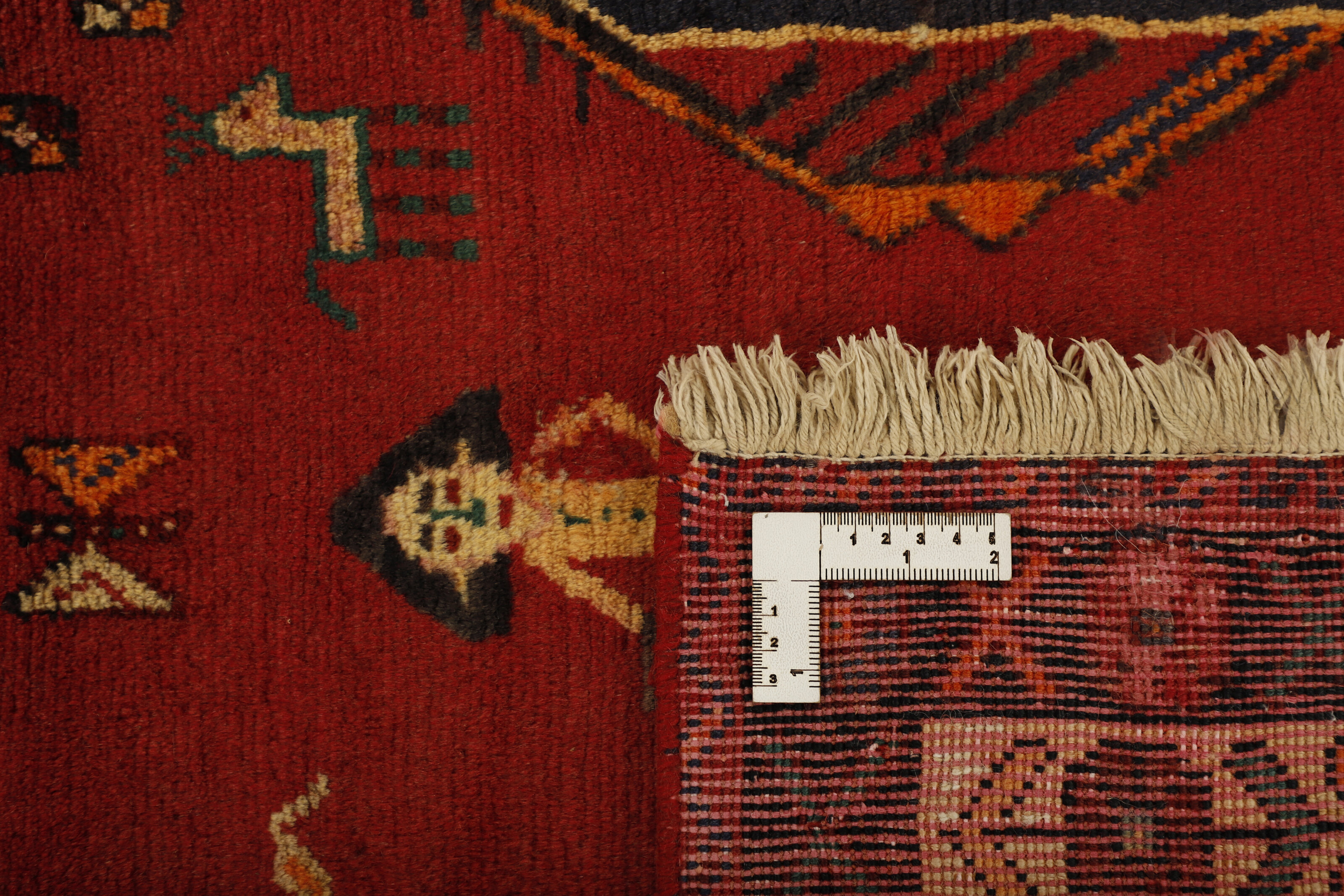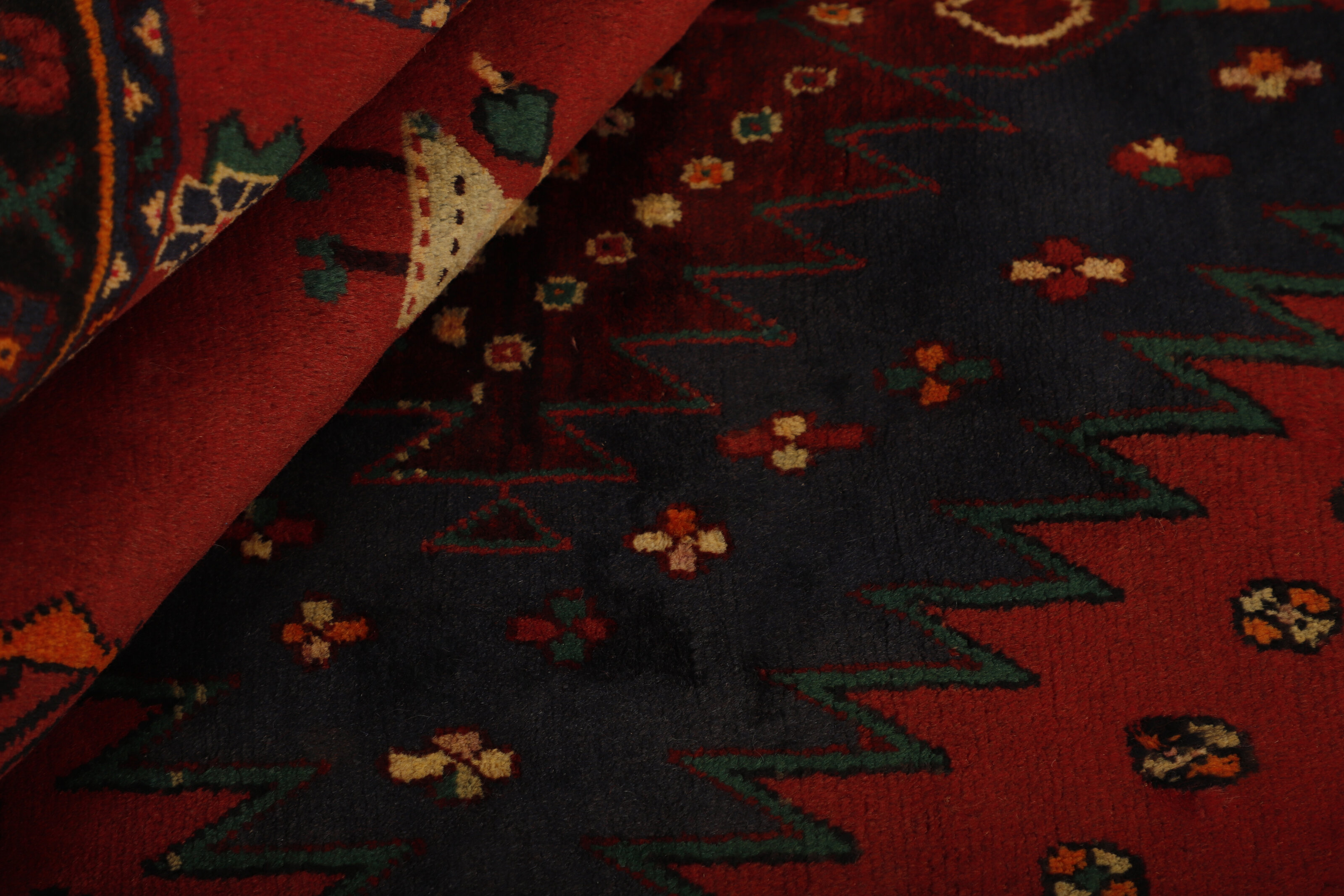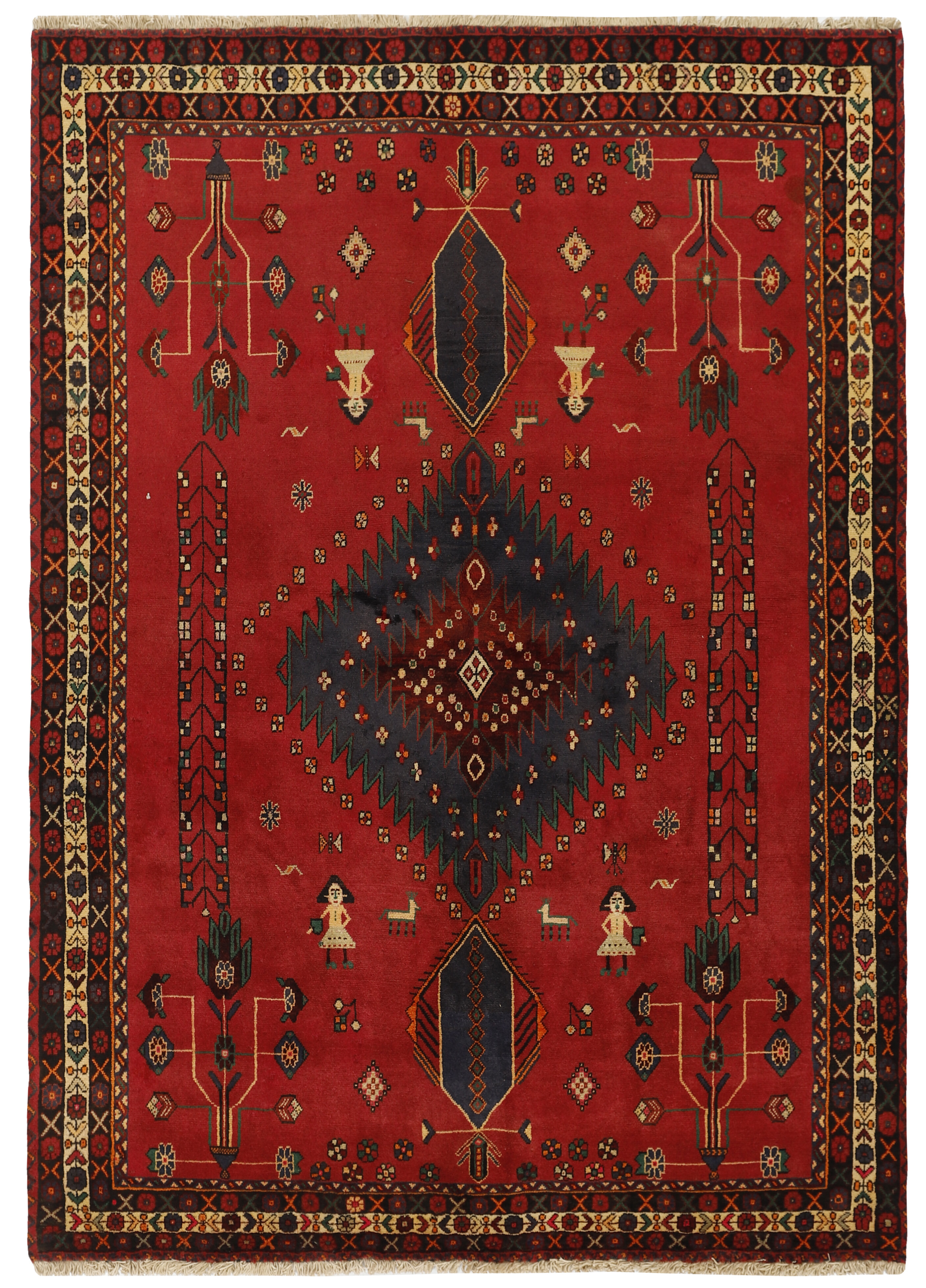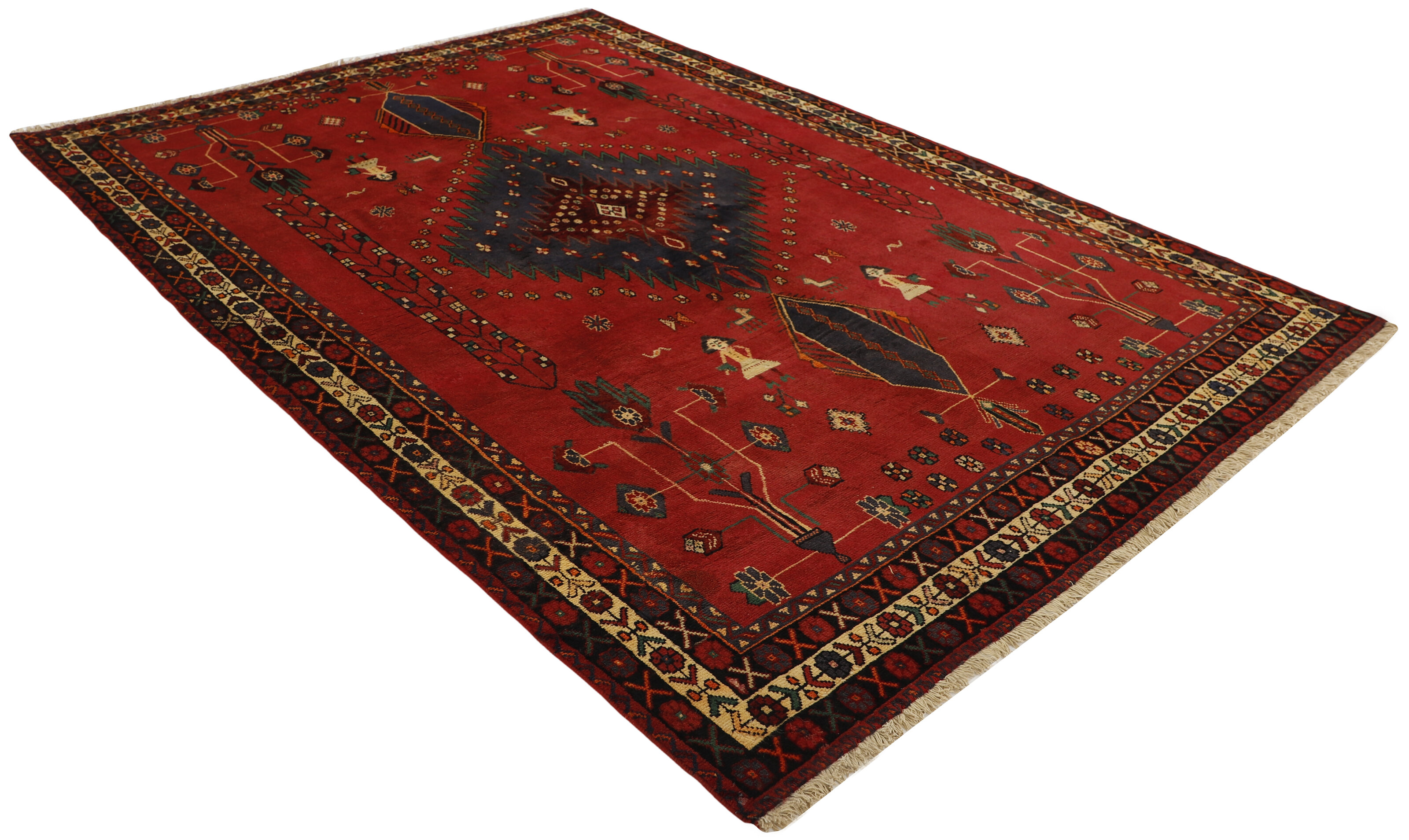 AfsharItem no.: 1514309 Size: 180 cm x 248 cmThe Afshar are one of the most important nomadic tribes in Iran. The most famous member of the tribe was Nadir Shah, an 18th century king who fought an Afghan rebellion to defeat Delhi and return the Peacock Throne and other treasures to Iran. Nowadays, the Afshar keep a low profile and are mainly famous for their rugs. These are classified according to the names of the cities where they are sold. The most important of these are Shahr-e-Babak and Sirjan, , which are situated west/south west of Kerman, in south-eastern Iran. Sirjan was a very important city in the 10th century, and some ruins can be seen today. All Afshar rugs have a wool pile, while the warp and weft are usually cotton. Sirjan rugs have a medium density and are rigid and firmly knotted. The patterns are simple; a pattern covering the entire rug, or large hexagonal medallions and three rhombus shaped medallions in a central axis. Deep blue and red are dominant. Most Sirjan rugs are the size of a large Dozar. Shahr-e-Babak rugs are finer and more flexible. The patterns are geometrical, very inventive, and often decorated with animals or birds. A wide range of colours is used.