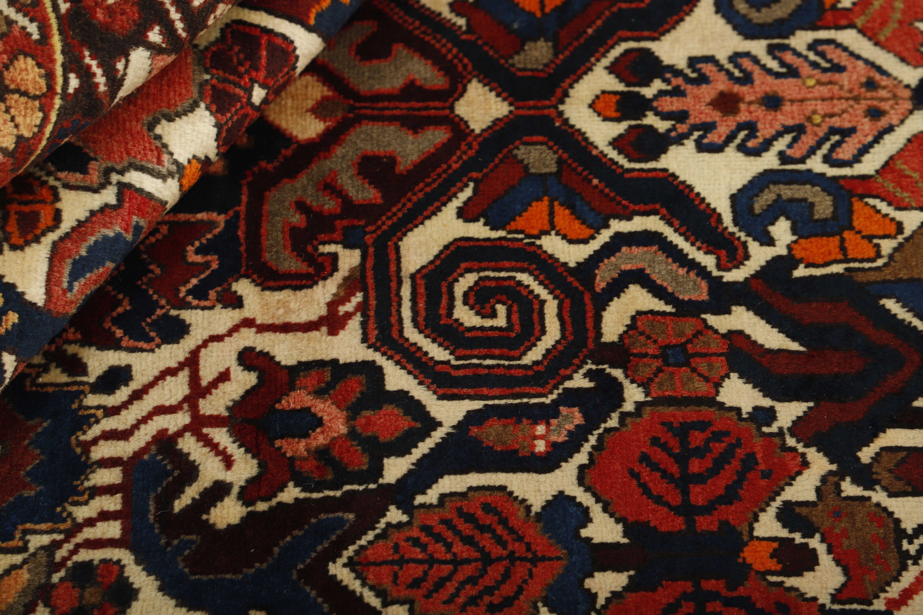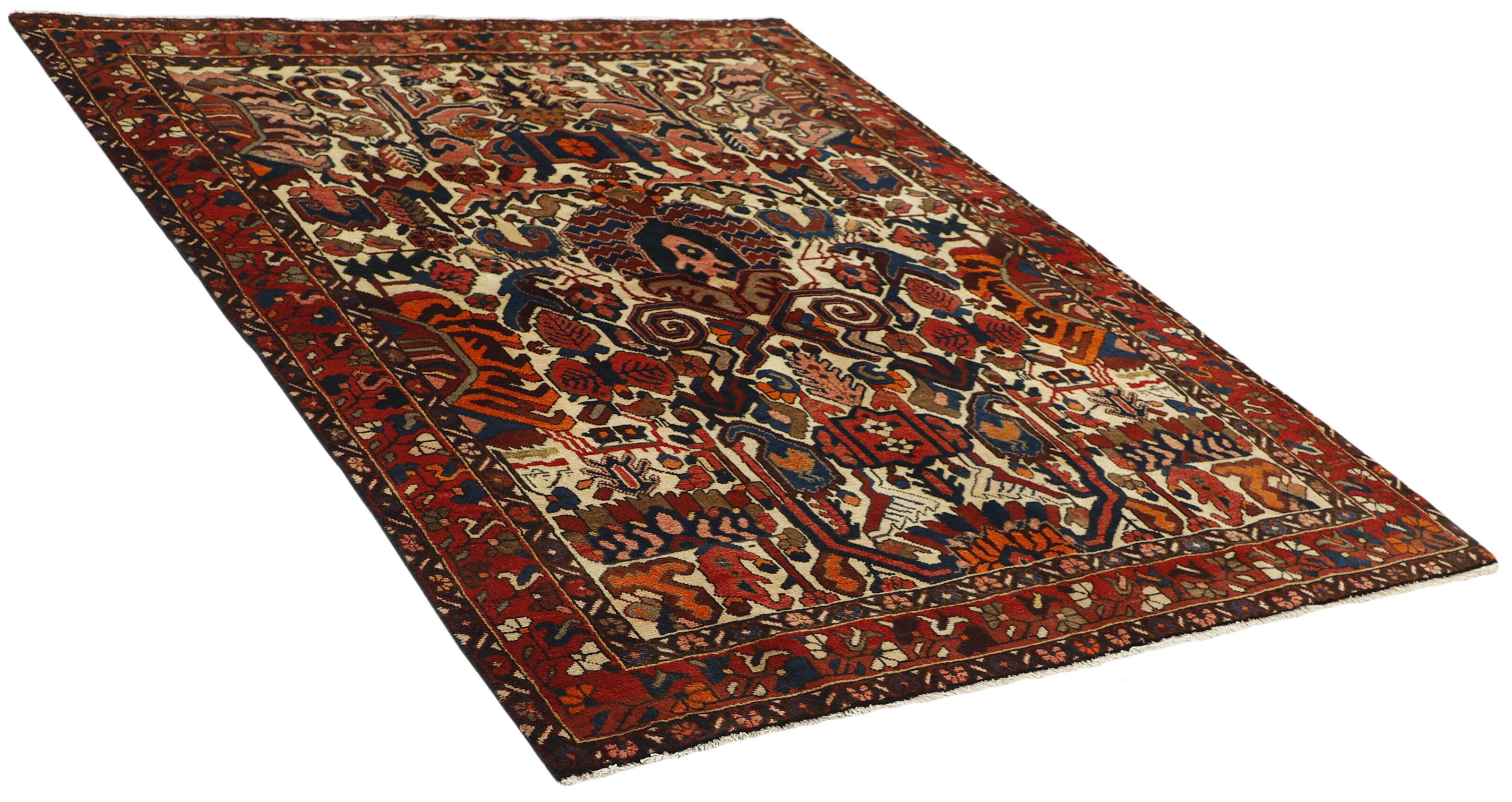 BakhtiyarItem no.: 1491103 Size: 154 cm x 205 cmBakhtiyar is the name of two types of rugs: one is produced by nomads in the Zagros Mountains west of Isfahan in central Iran, and the other more important rug is produced by permanent residents of the villages in the area. Only few Bakhtiyar nomad rugs reach the market – the most common are probably bag rugs that combine pile and Kelim work. Rugs from the villages are more common, and they are produced in numerous mountain villages, whose inhabitants are of Turkish, Persian or Armenian descent. They are most often sold in the bazaars of Isfahan. The most common patterns are medallions and the so-called garden patterns, which are divided into squares of different flower patterns. The pattern has ancient roots, and is often rustic, as large blocks of colour with heavy contours are used. Most colours are made from locally produced plant pigments, giving a harmonious effect to the rugs.