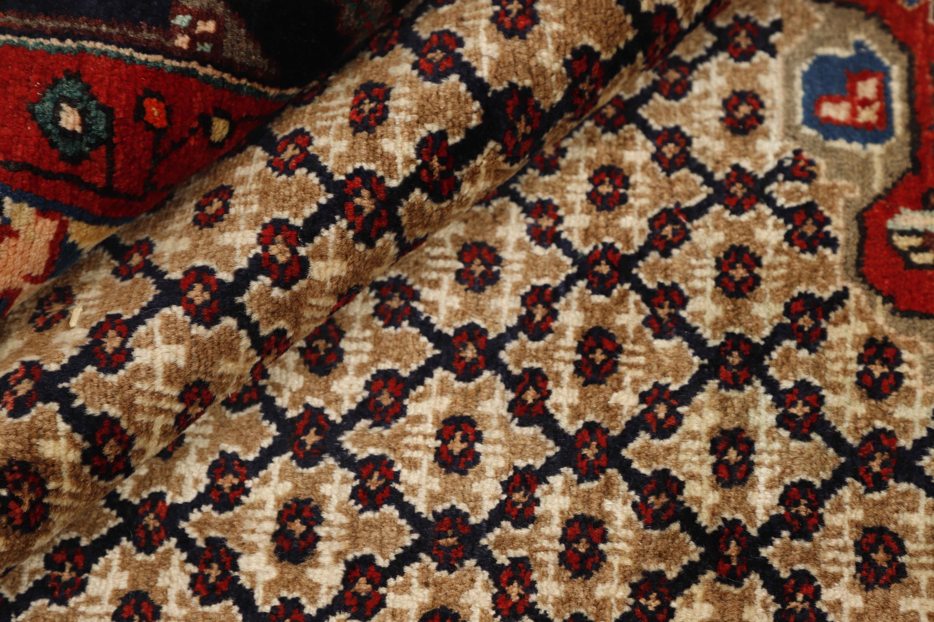 This rug is from the district of Hamadan which is an important centre for the rug trade, as well as the most productive rug production area of Iran. Hamadan is a major city with hundreds of thousands of people. Like Ekbatan, it was a main city of the Achemenian kings. It has an indigenous Jewish population and numerous monuments, of which the most important are the tombs of Esther and Mordicai (central to Jewish pilgrims), and the tomb at Avicenna. Hamadan is a provincial capitol. Two types of rugs are knotted. One is the so-called “city rug”, also known as the Shahrbaff. The production is modern and largely state controlled. The village production, however, is much more important; Hamadan is a market city for many rug producing villages that each has its own pattern. Most prominent are Borchalu, Tuserkman, Memraban, Khamseh, Begardeh, Enjilas, Hosseinabad, and Zandjan. There is a wide range of patterns but the quality is very consistent. The colours are strong, and often plant colours. The patterns are daring, although random, and Hosseinabad and Enjilas in particular are known for through going patterns. The rugs are usually not much bigger than 3 by 2 metres. The surrounding regions of the Iranian city Songour is one of the most productive rug areas in Iran. In each of the many villages (more than 600), unique rugs in a heavy quality with colourful, charming and primitive motifs are manufactured in a vari ety of sizes and designs. The Hamadan area is mainly Turkmen and the rugs are hand knotted using the Turkish knotting technique, i.e. ghiordis.