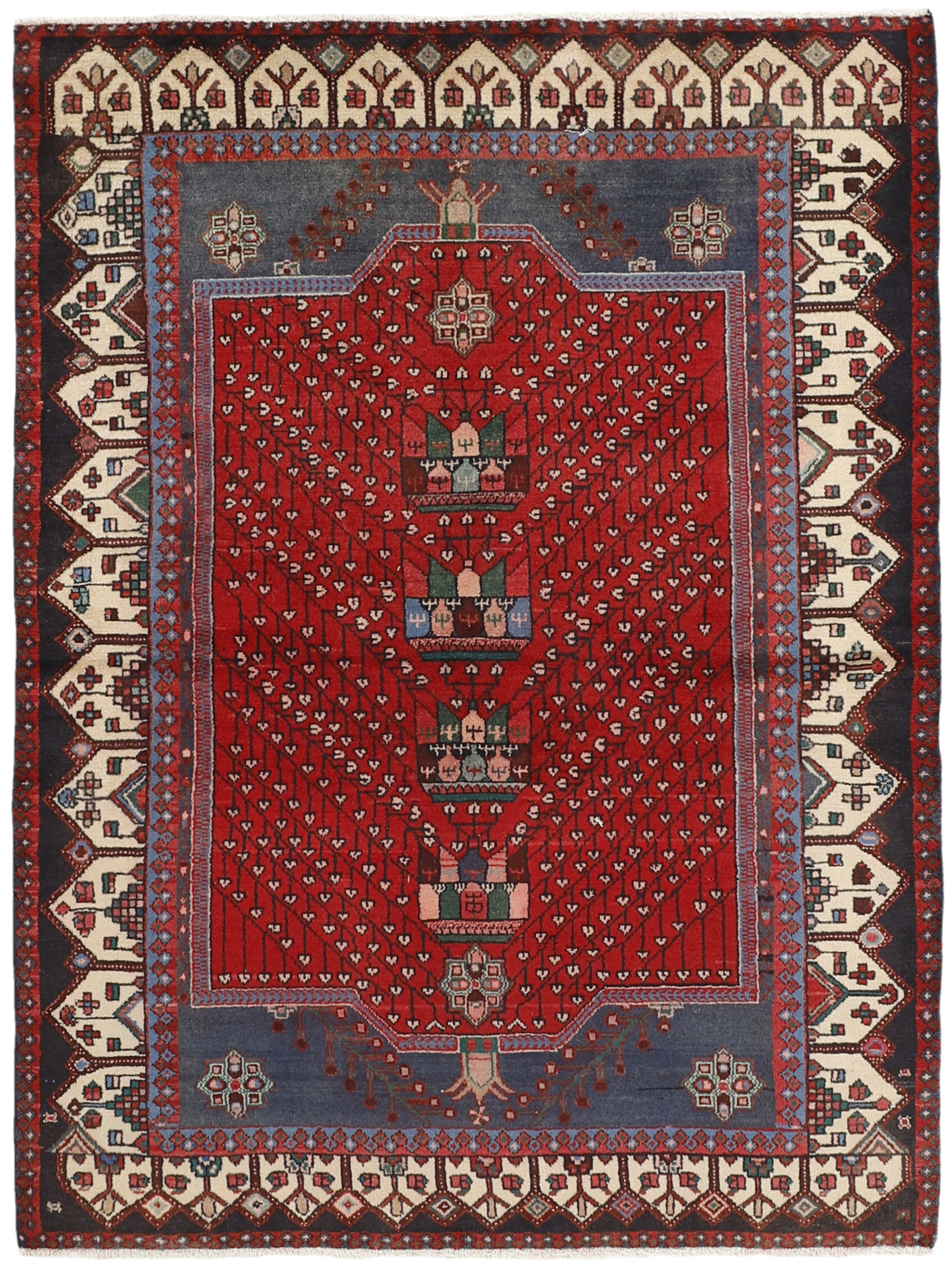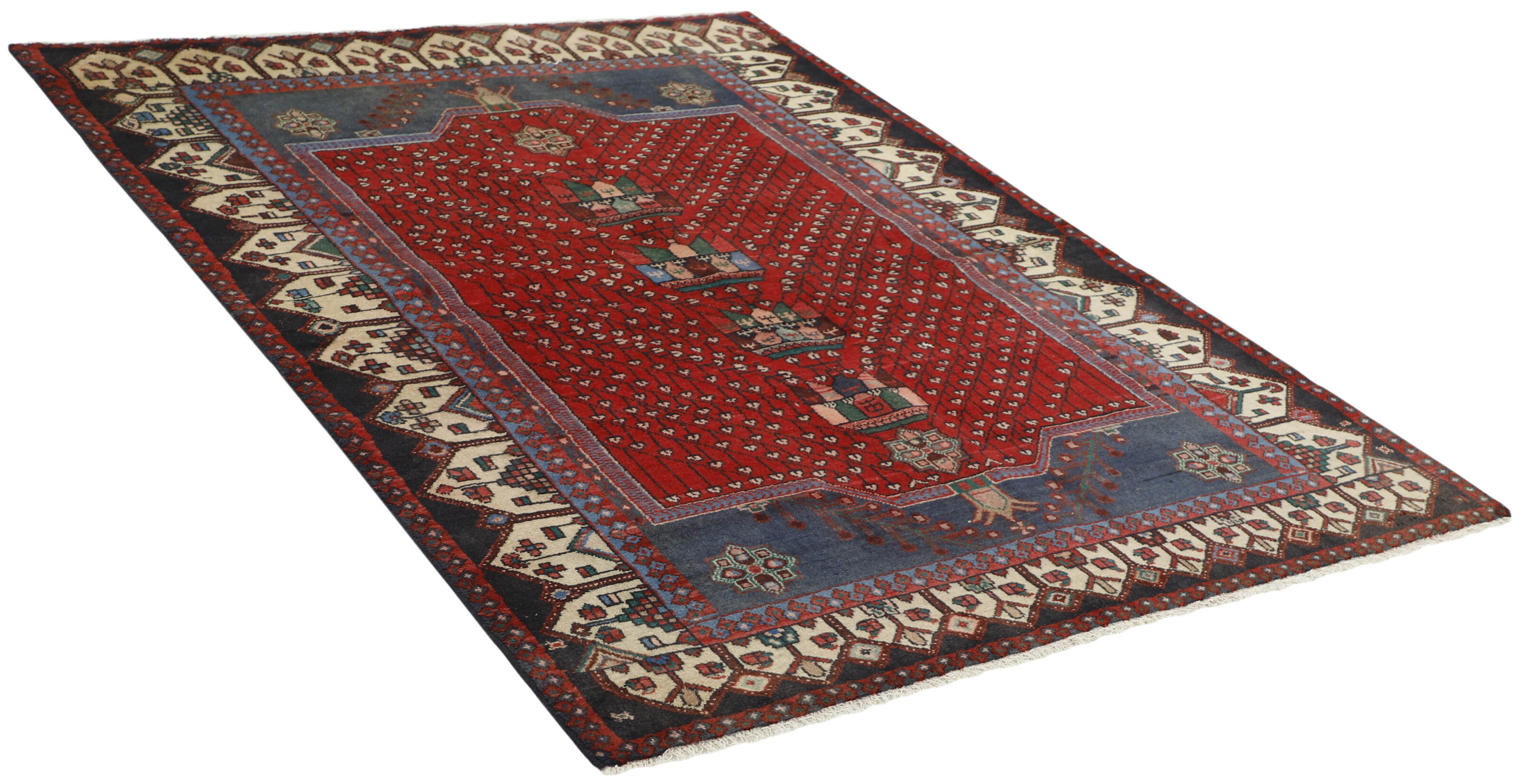 ShahsavanItem no.: 1491092 Size: 140 cm x 184 cmThe city and the district of Hamadan is an important centre for the rug trade, as well as the most productive rug production area of Iran. Hamadan is a major city with hundreds of thousands of people. Like Ekbatan, it was a main city of the Achemenian kings. It has an indigenous Jewish population and numerous monuments, of which the most important are the tombs of Esther and Mordicai (central to Jewish pilgrims), and the tomb at Avicenna. Hamadan is a provincial capitol. Two types of rugs are knotted. One is the so-called “city rug”, also known as the Shahrbaff. The production is modern and largely state controlled. The village production, however, is much more important; Hamadan is a market city for many rug producing villages that each has its own pattern. Most prominent are Borchalu, Tuserkman, Memraban, Khamseh, Begardeh, Enjilas, Hosseinabad, and Zandjan. There is a wide range of patterns but the quality is very consistent. The colours are strong, and often plant colours. The patterns are daring, although random, and Hosseinabad and Enjilas in particular are known for through going patterns. The rugs are usually not much bigger than 3 by 2 metres.