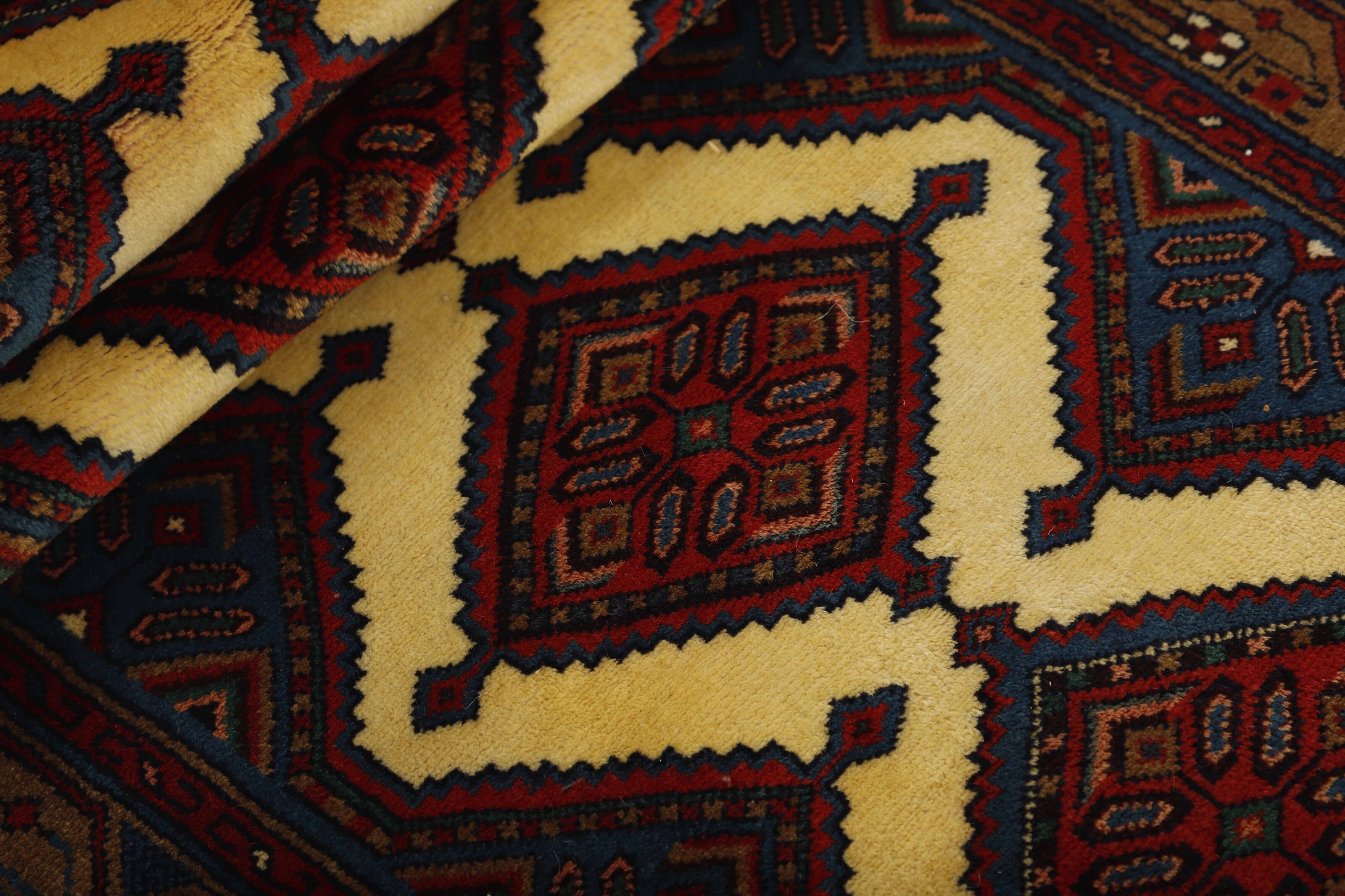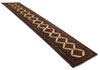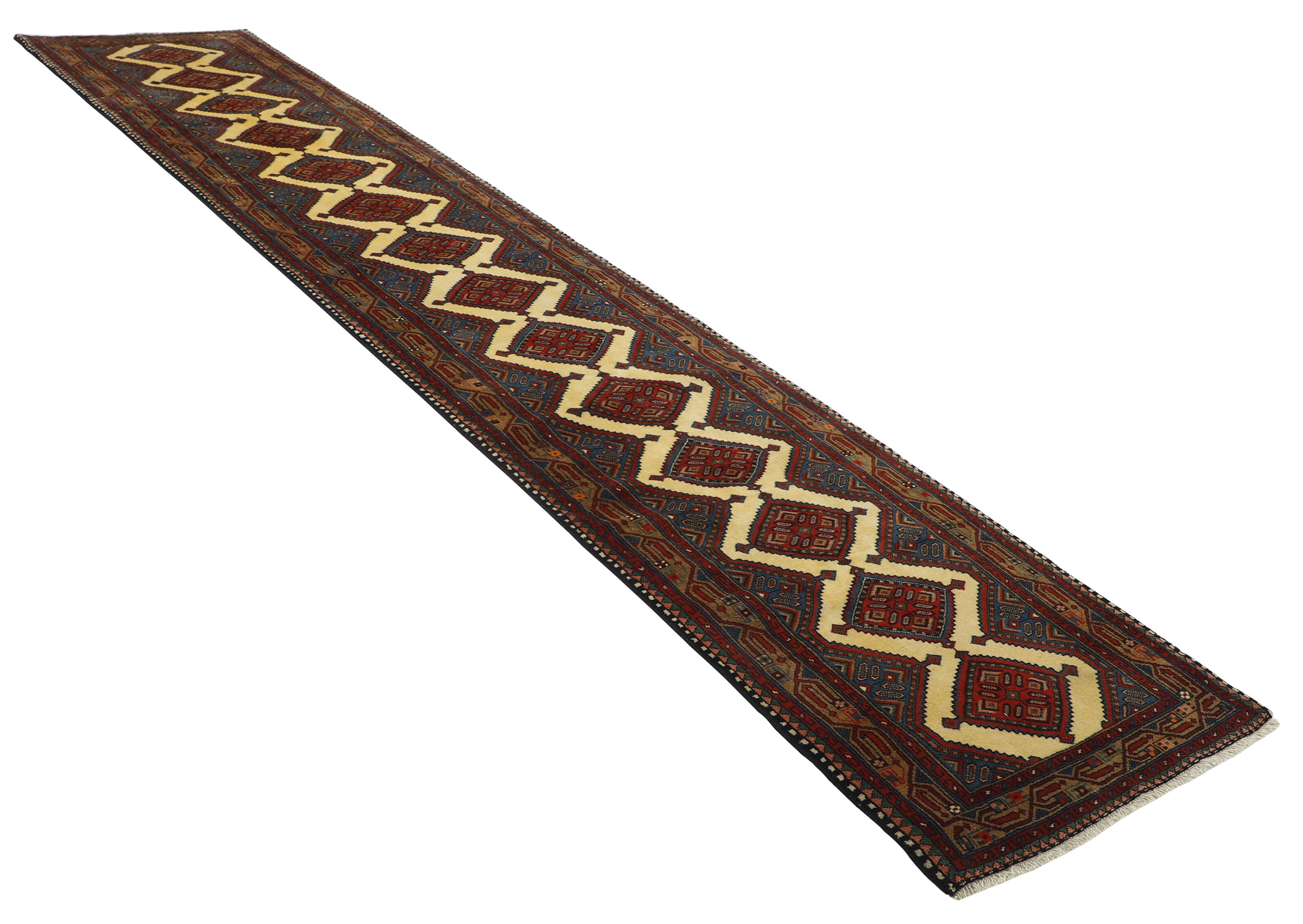 AsadabadItem no.: 1492836 Size: 79 cm x 405 cmThis rug is from the district of Hamadan which is an important centre for the rug trade, as well as the most productive rug production area of Iran. Hamadan is a major city with hundreds of thousands of people. Like Ekbatan, it was a main city of the Achemenian kings. It has an indigenous Jewish population and numerous monuments, of which the most important are the tombs of Esther and Mordicai (central to Jewish pilgrims), and the tomb at Avicenna. Hamadan is a provincial capitol. Two types of rugs are knotted. One is the so-called “city rug”, also known as the Shahrbaff. The production is modern and largely state controlled. The village production, however, is much more important; Hamadan is a market city for many rug producing villages that each has its own pattern. Most prominent are Borchalu, Tuserkman, Memraban, Khamseh, Begardeh, Enjilas, Hosseinabad, and Zandjan. There is a wide range of patterns but the quality is very consistent. The colours are strong, and often plant colours. The patterns are daring, although random, and Hosseinabad and Enjilas in particular are known for through going patterns. The rugs are usually not much bigger than 3 by 2 metres.