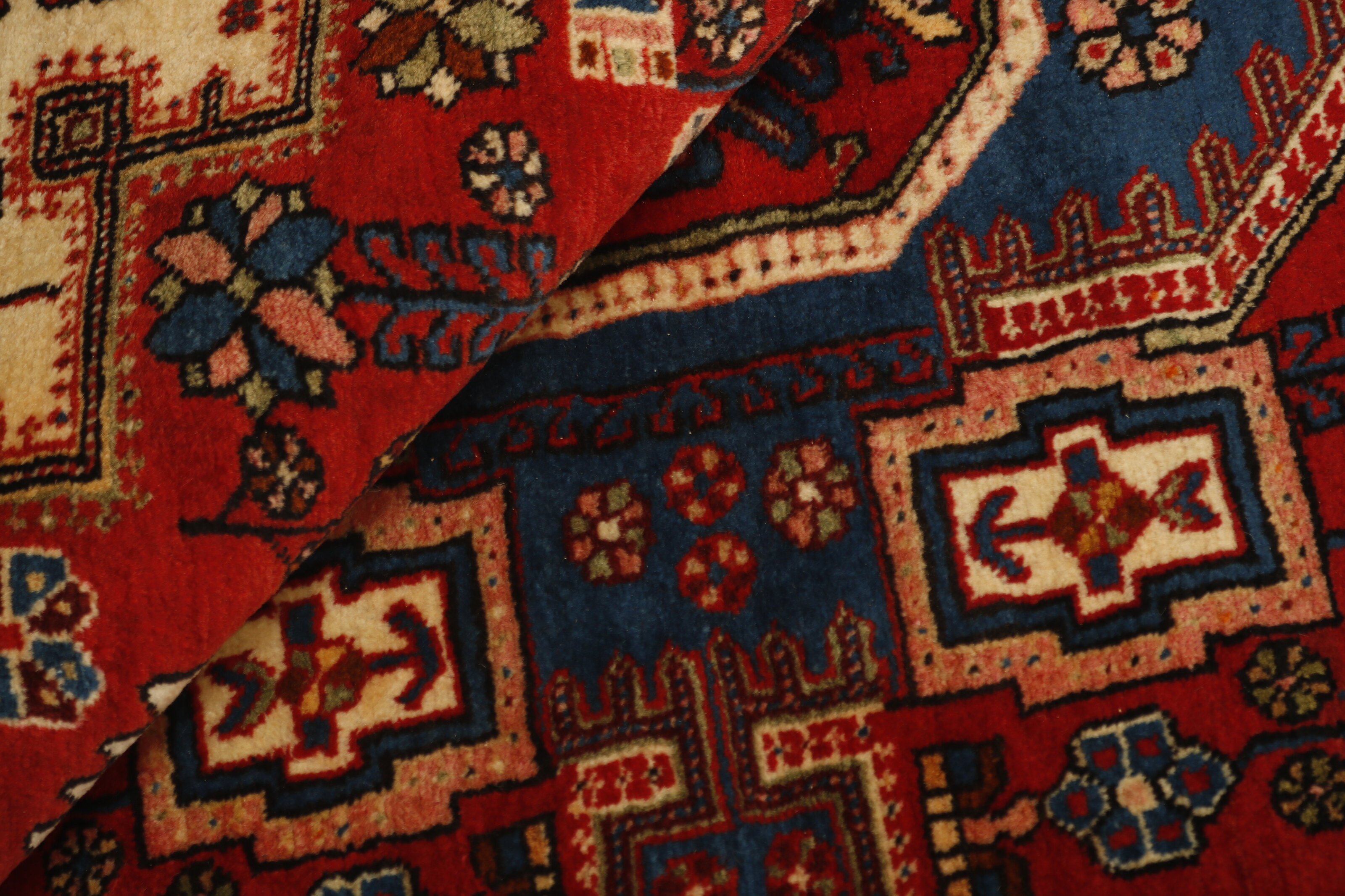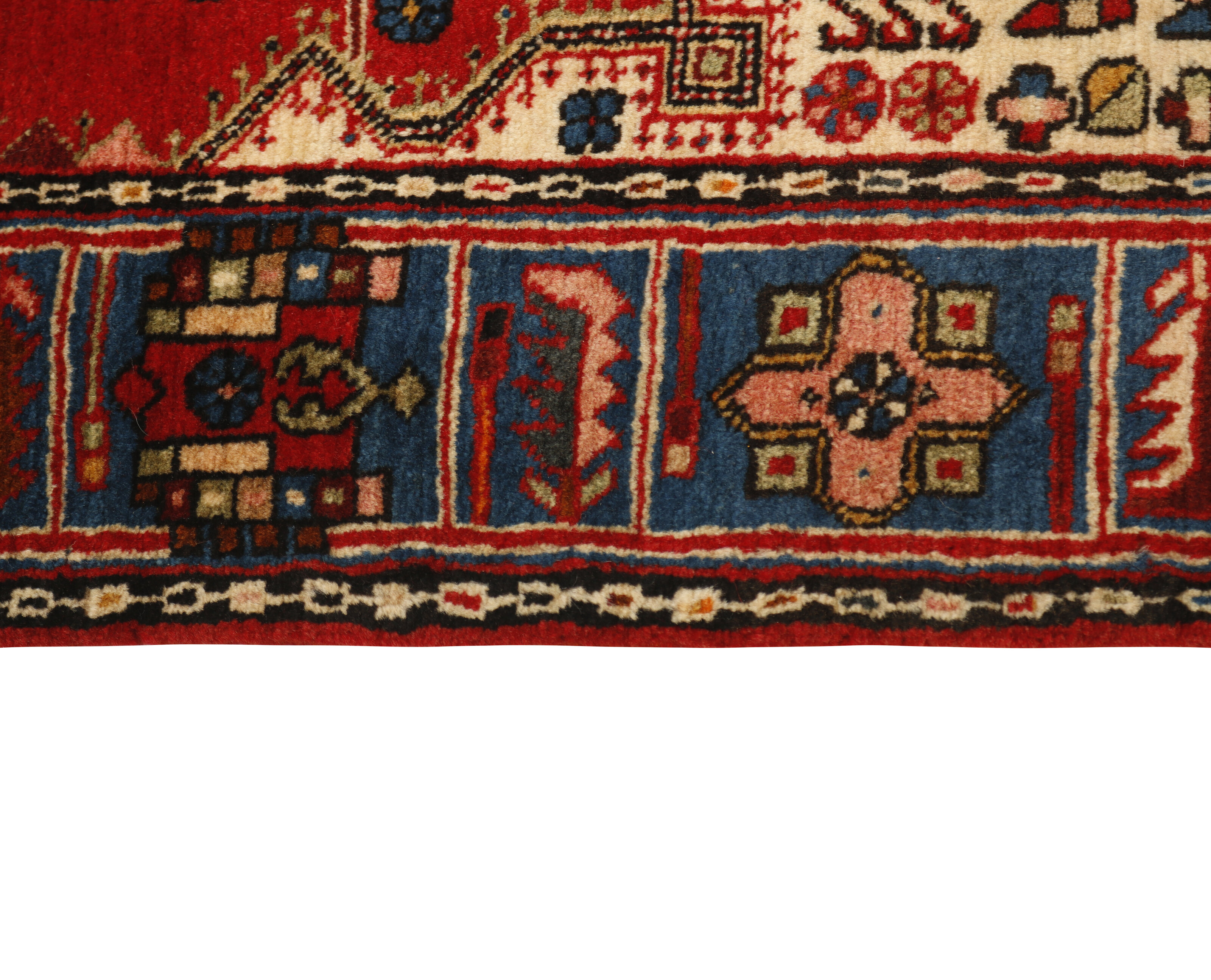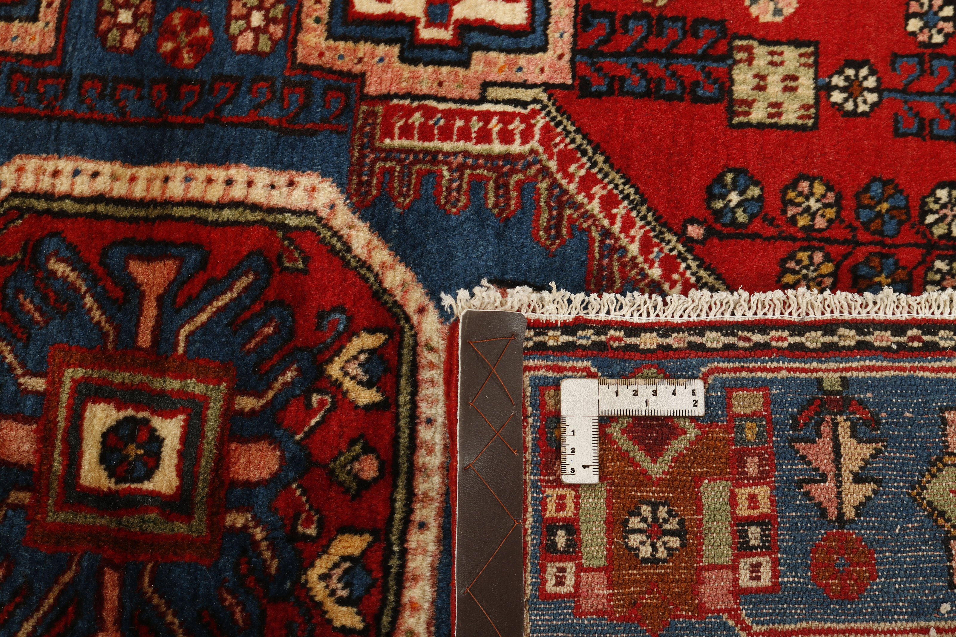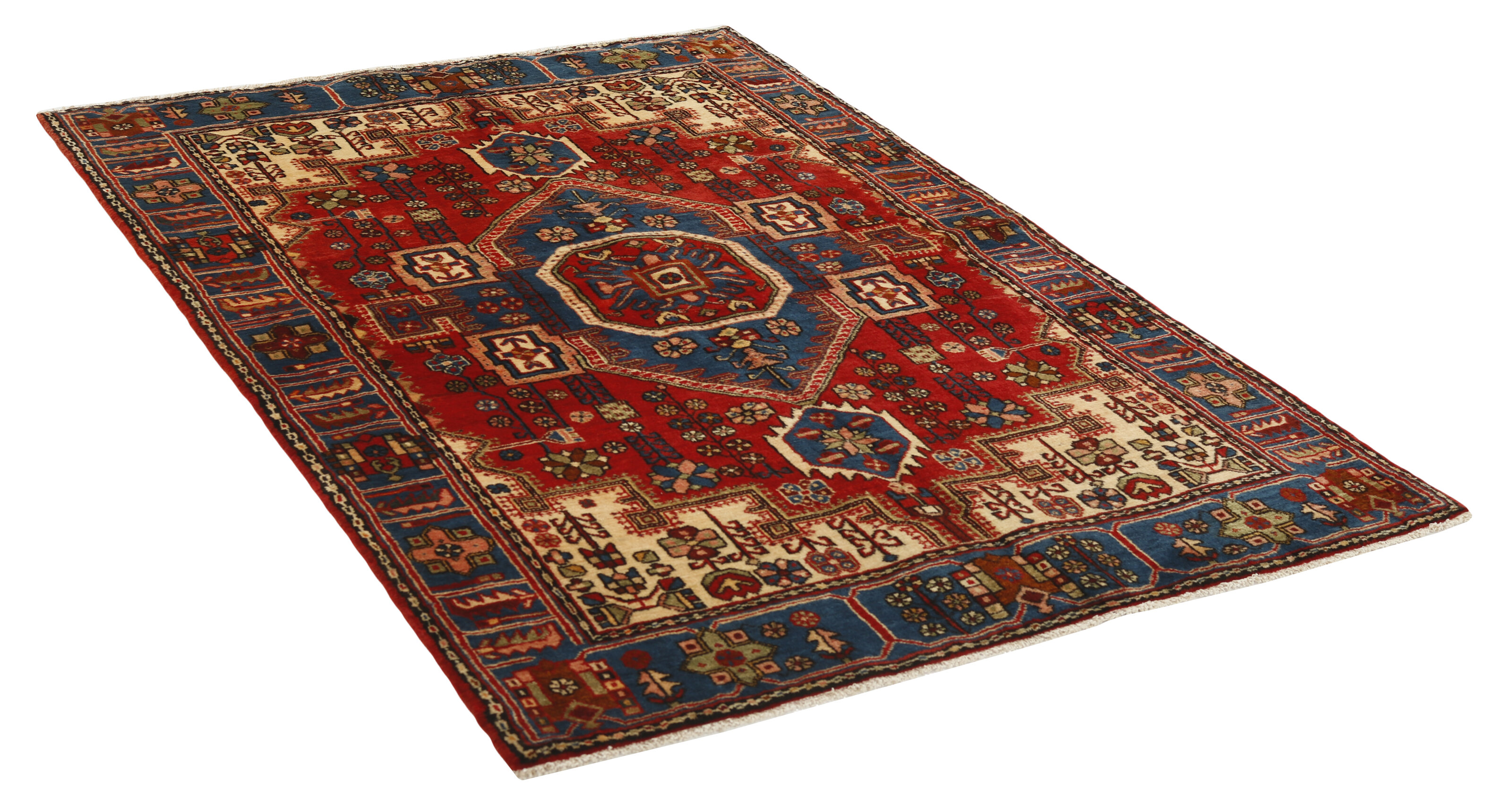 NahavandItem no.: 1514300 Size: 134 cm x 195 cmNahavand is a city of about 200.000 people, situated west of Malayer, in the southern part of the Hamadan province. The rug production is concentrated in the city itself and the surrounding villages, such as Ushvand. The rugs share many characteristics with Hamadan rugs; they have simple warps and wefts, with a wool pile and cotton warp and weft. The patterns can best be described as rural interpretations of classical patterns, with a central medallion and corners. They have warm colours, different nuances of red, as well as brown, blue, and green.
