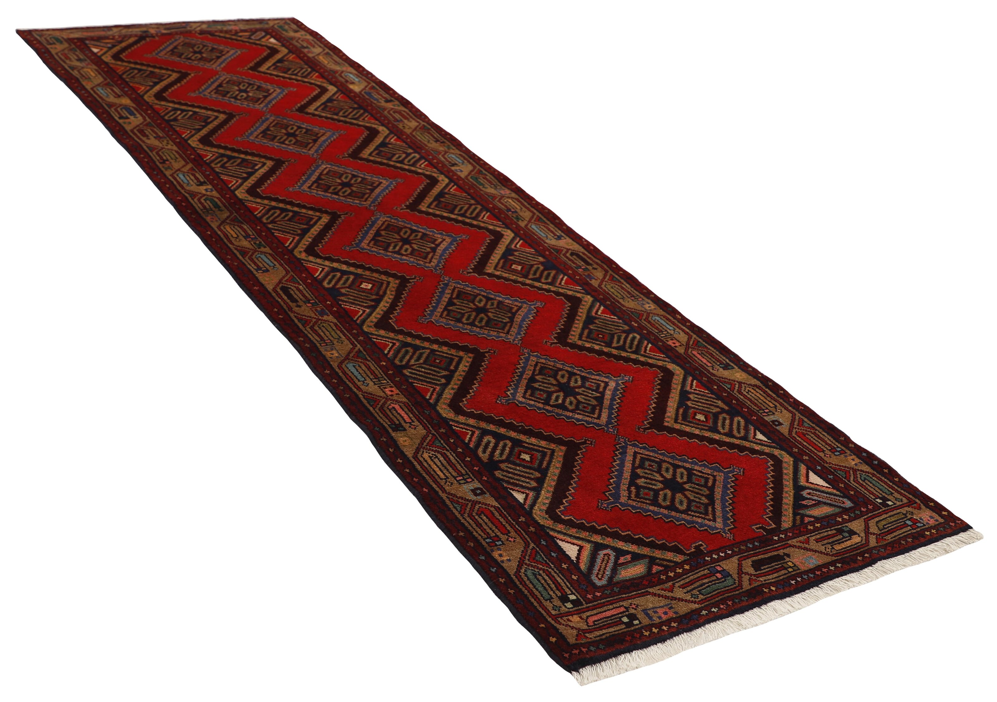 AsadabadItem no.: 1514412 Size: 85 cm x 288 cmThis rug is from the district of Hamadan which is an important centre for the rug trade, as well as the most productive rug production area of Iran. Hamadan is a major city with hundreds of thousands of people. Like Ekbatan, it was a main city of the Achemenian kings. It has an indigenous Jewish population and numerous monuments, of which the most important are the tombs of Esther and Mordicai (central to Jewish pilgrims), and the tomb at Avicenna. Hamadan is a provincial capitol. Two types of rugs are knotted. One is the so-called “city rug”, also known as the Shahrbaff. The production is modern and largely state controlled. The village production, however, is much more important; Hamadan is a market city for many rug producing villages that each has its own pattern. Most prominent are Borchalu, Tuserkman, Memraban, Khamseh, Begardeh, Enjilas, Hosseinabad, and Zandjan. There is a wide range of patterns but the quality is very consistent. The colours are strong, and often plant colours. The patterns are daring, although random, and Hosseinabad and Enjilas in particular are known for through going patterns. The rugs are usually not much bigger than 3 by 2 metres.