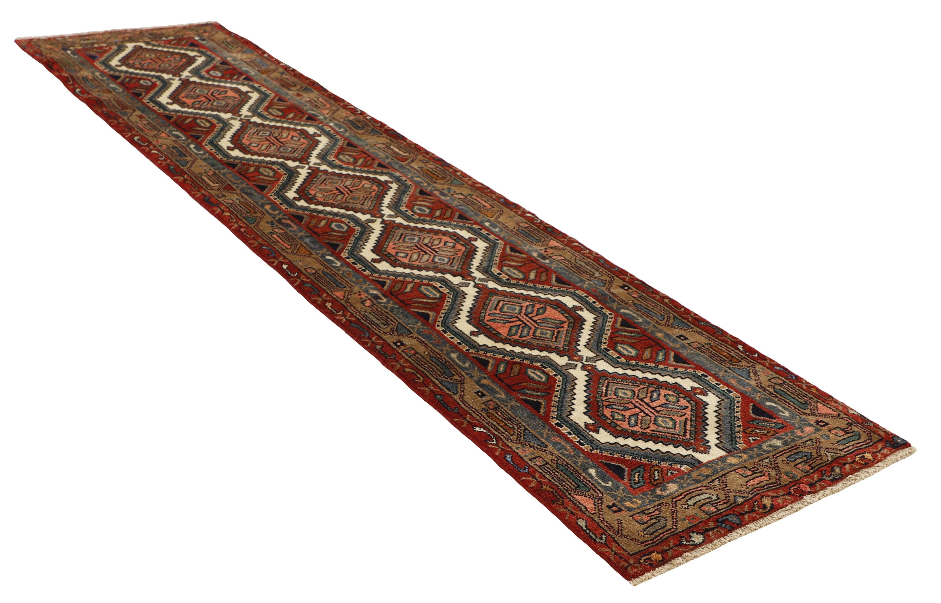 AsadabadItem no.: 1514414 Size: 75 cm x 303 cmThis rug is from the district of Hamadan which is an important centre for the rug trade, as well as the most productive rug production area of Iran. Hamadan is a major city with hundreds of thousands of people. Like Ekbatan, it was a main city of the Achemenian kings. It has an indigenous Jewish population and numerous monuments, of which the most important are the tombs of Esther and Mordicai (central to Jewish pilgrims), and the tomb at Avicenna. Hamadan is a provincial capitol. Two types of rugs are knotted. One is the so-called “city rug”, also known as the Shahrbaff. The production is modern and largely state controlled. The village production, however, is much more important; Hamadan is a market city for many rug producing villages that each has its own pattern. Most prominent are Borchalu, Tuserkman, Memraban, Khamseh, Begardeh, Enjilas, Hosseinabad, and Zandjan. There is a wide range of patterns but the quality is very consistent. The colours are strong, and often plant colours. The patterns are daring, although random, and Hosseinabad and Enjilas in particular are known for through going patterns. The rugs are usually not much bigger than 3 by 2 metres.