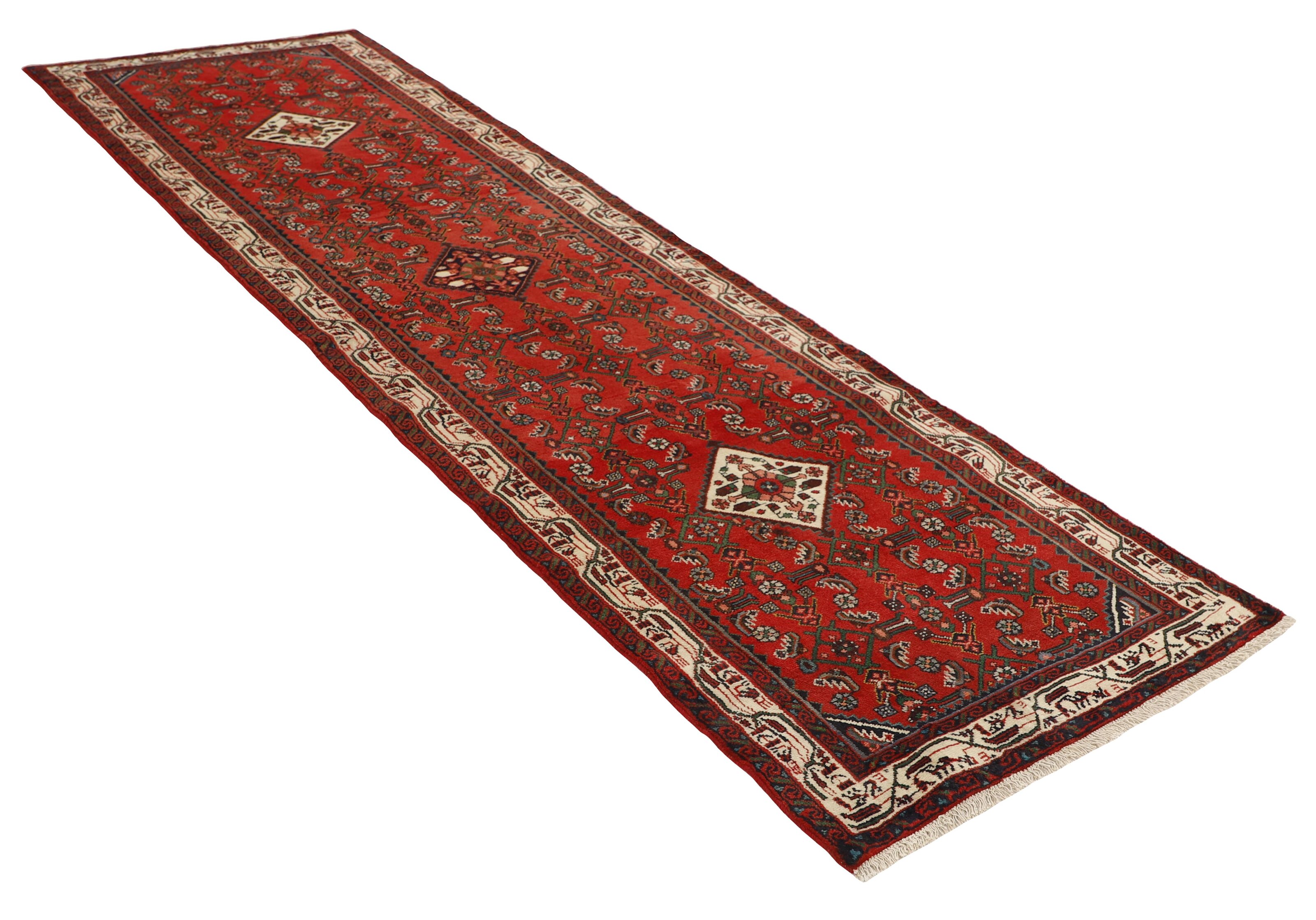 AsadabadItem no.: 1514425 Size: 88 cm x 291 cmThis rug is from the district of Hamadan which is an important centre for the rug trade, as well as the most productive rug production area of Iran. Hamadan is a major city with hundreds of thousands of people. Like Ekbatan, it was a main city of the Achemenian kings. It has an indigenous Jewish population and numerous monuments, of which the most important are the tombs of Esther and Mordicai (central to Jewish pilgrims), and the tomb at Avicenna. Hamadan is a provincial capitol. Two types of rugs are knotted. One is the so-called “city rug”, also known as the Shahrbaff. The production is modern and largely state controlled. The village production, however, is much more important; Hamadan is a market city for many rug producing villages that each has its own pattern. Most prominent are Borchalu, Tuserkman, Memraban, Khamseh, Begardeh, Enjilas, Hosseinabad, and Zandjan. There is a wide range of patterns but the quality is very consistent. The colours are strong, and often plant colours. The patterns are daring, although random, and Hosseinabad and Enjilas in particular are known for through going patterns. The rugs are usually not much bigger than 3 by 2 metres.