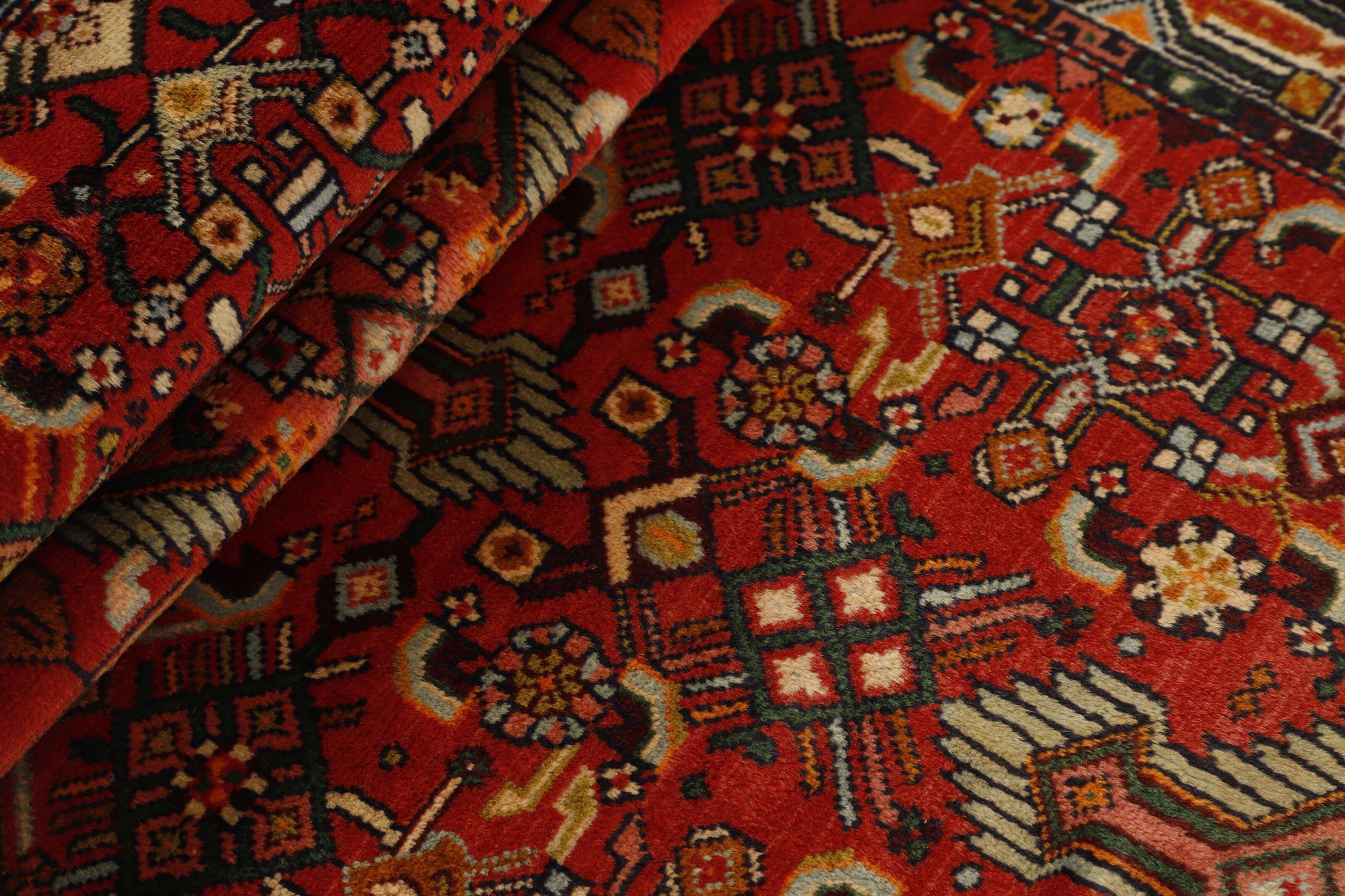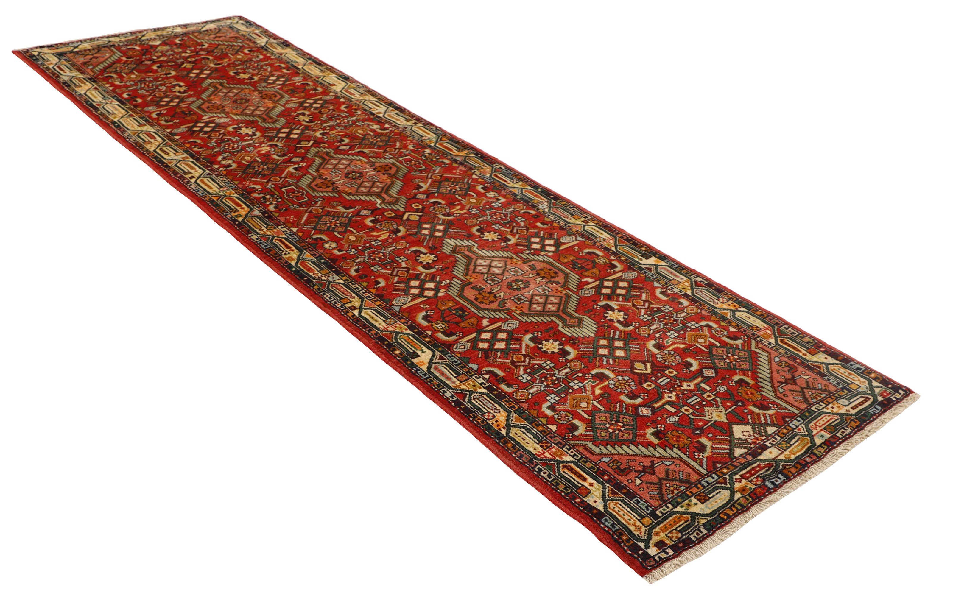 AsadabadItem no.: 1514439 Size: 80 cm x 277 cmThis rug is from the district of Hamadan which is an important centre for the rug trade, as well as the most productive rug production area of Iran. Hamadan is a major city with hundreds of thousands of people. Like Ekbatan, it was a main city of the Achemenian kings. It has an indigenous Jewish population and numerous monuments, of which the most important are the tombs of Esther and Mordicai (central to Jewish pilgrims), and the tomb at Avicenna. Hamadan is a provincial capitol. Two types of rugs are knotted. One is the so-called “city rug”, also known as the Shahrbaff. The production is modern and largely state controlled. The village production, however, is much more important; Hamadan is a market city for many rug producing villages that each has its own pattern. Most prominent are Borchalu, Tuserkman, Memraban, Khamseh, Begardeh, Enjilas, Hosseinabad, and Zandjan. There is a wide range of patterns but the quality is very consistent. The colours are strong, and often plant colours. The patterns are daring, although random, and Hosseinabad and Enjilas in particular are known for through going patterns. The rugs are usually not much bigger than 3 by 2 metres.
