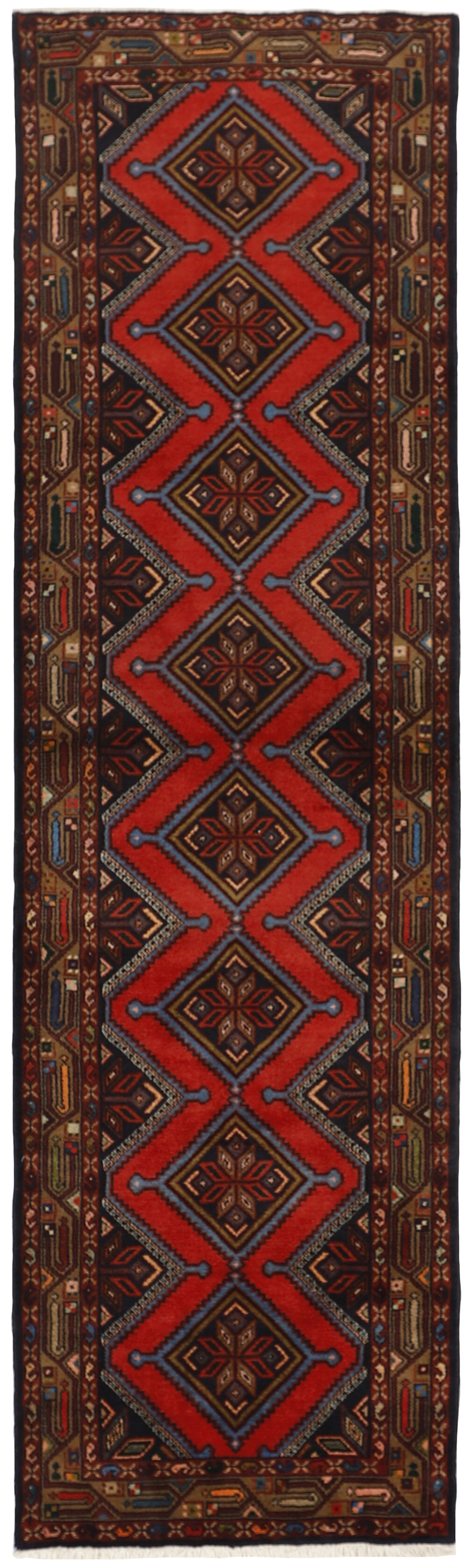 AsadabadItem no.: 1514490 Size: 81 cm x 280 cmThis rug is from the district of Hamadan which is an important centre for the rug trade, as well as the most productive rug production area of Iran. Hamadan is a major city with hundreds of thousands of people. Like Ekbatan, it was a main city of the Achemenian kings. It has an indigenous Jewish population and numerous monuments, of which the most important are the tombs of Esther and Mordicai (central to Jewish pilgrims), and the tomb at Avicenna. Hamadan is a provincial capitol. Two types of rugs are knotted. One is the so-called “city rug”, also known as the Shahrbaff. The production is modern and largely state controlled. The village production, however, is much more important; Hamadan is a market city for many rug producing villages that each has its own pattern. Most prominent are Borchalu, Tuserkman, Memraban, Khamseh, Begardeh, Enjilas, Hosseinabad, and Zandjan. There is a wide range of patterns but the quality is very consistent. The colours are strong, and often plant colours. The patterns are daring, although random, and Hosseinabad and Enjilas in particular are known for through going patterns. The rugs are usually not much bigger than 3 by 2 metres.