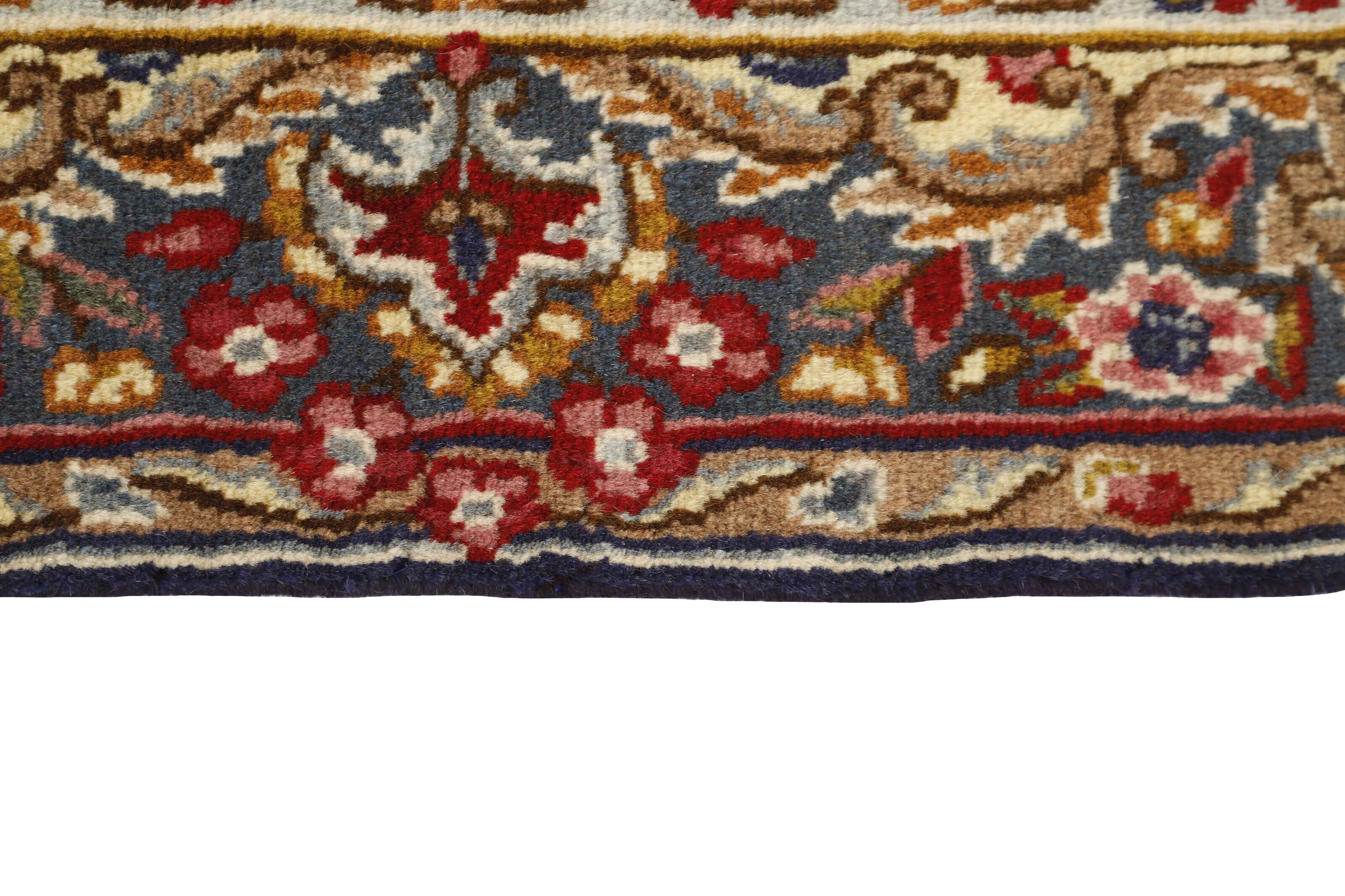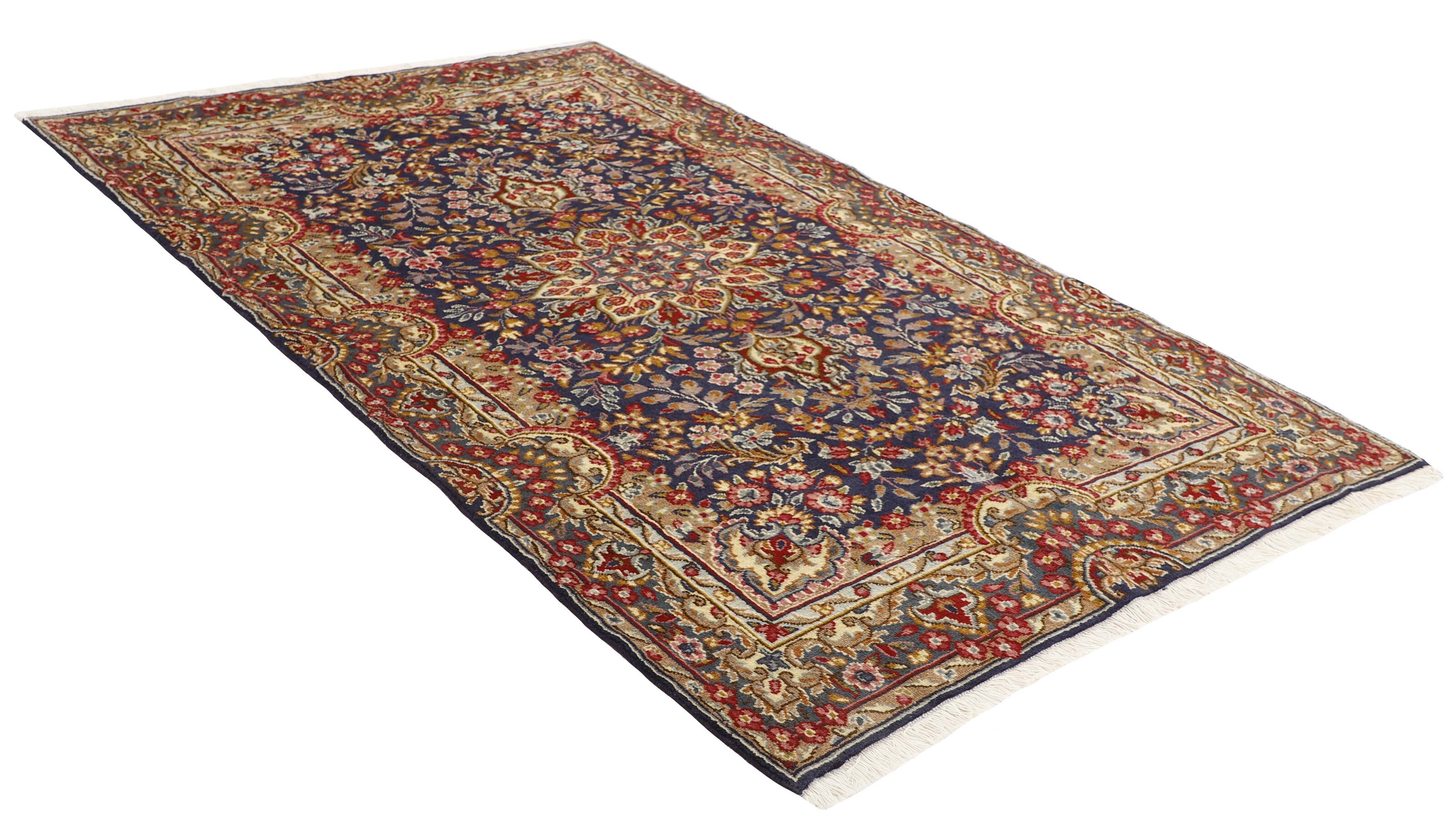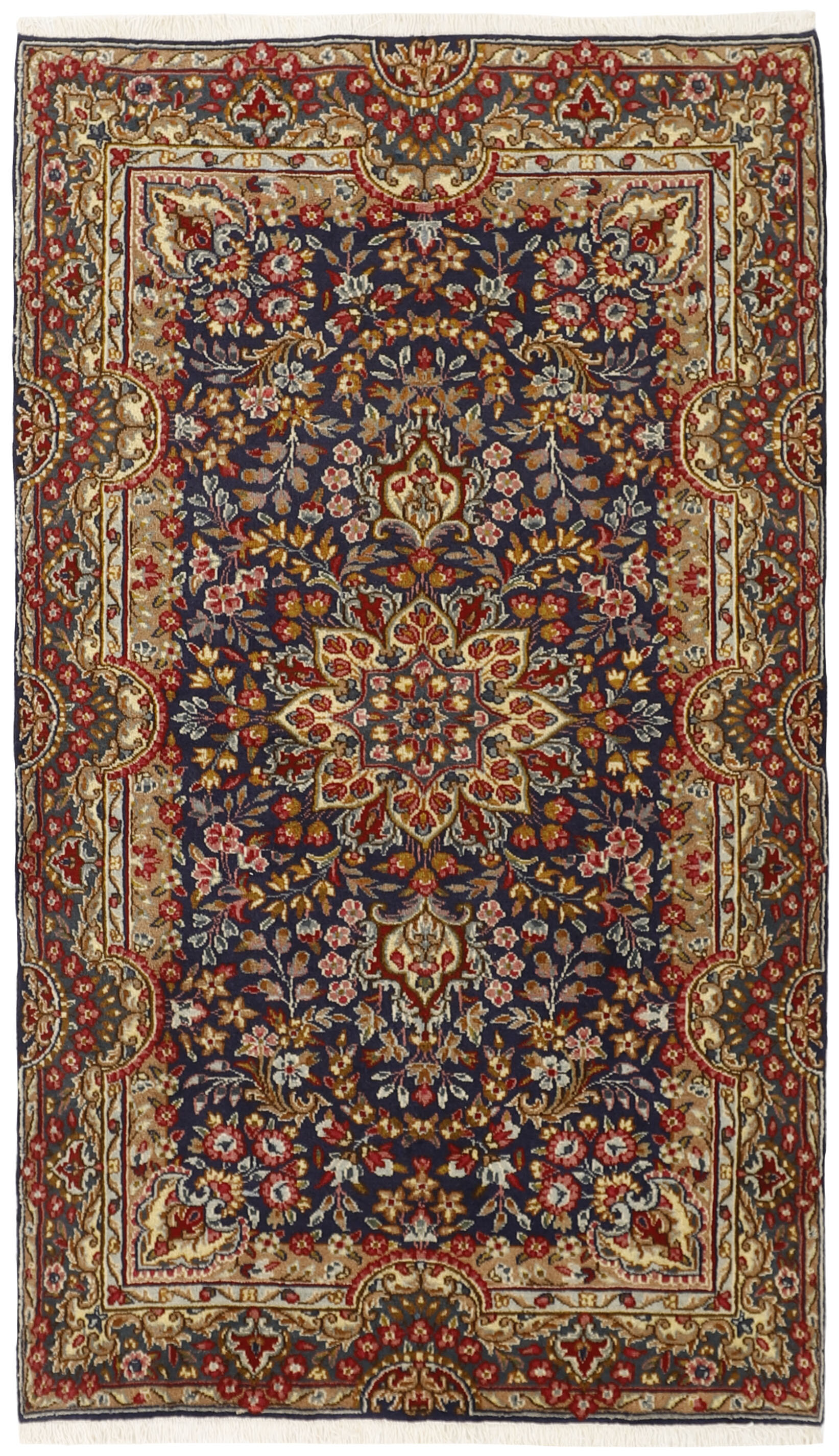 KermanItem no.: 1514265 Size: 140 cm x 240 cmThe city of Kerman lies in south-eastern Iran, on the edge of the Kavir-e-Lut Desert, and is the capitol of the Kerman province, which has about half a million inhabitants. Its geographical isolation has ensured the preservation of many monuments – there is said to be 90 mosques – and a 15th century mausoleum in nearby Mahan is said to be the most beautiful building in Iran. Like Yazd to the northwest, Kerman has a large population of Zoroastrians, who adhere to Iran’s ancient religion, which in other places has been replaced by Islam. The silhouette of Kerman is characterised by its wind towers – chimney like constructions used to catch every breeze and lead them down to the inner parts of the house. Kerman has an ancient textile tradition, and shawls were woven through large parts of the 19th century. When the demand for shawls fell, the weavers changed their looms for rug production. Initially, they used the same patterns they had used in the shawls, but they adapted them as fashion changed, although the Kerman rugs kept their delicate colours and patterns. All sizes are made. The largest rugs have unique colours and patterns, and are often knotted in the northern towns of Lavar or Ravar. Apart from the shawl patterns, Kerman often has adaptations of the Boteh- motif with natural bouquets of flowers, or adaptations of classical rug patterns. A wide range of delicate colours is used. The pile is normally soft, velvet like wool, while warp and weft are always cotton.
