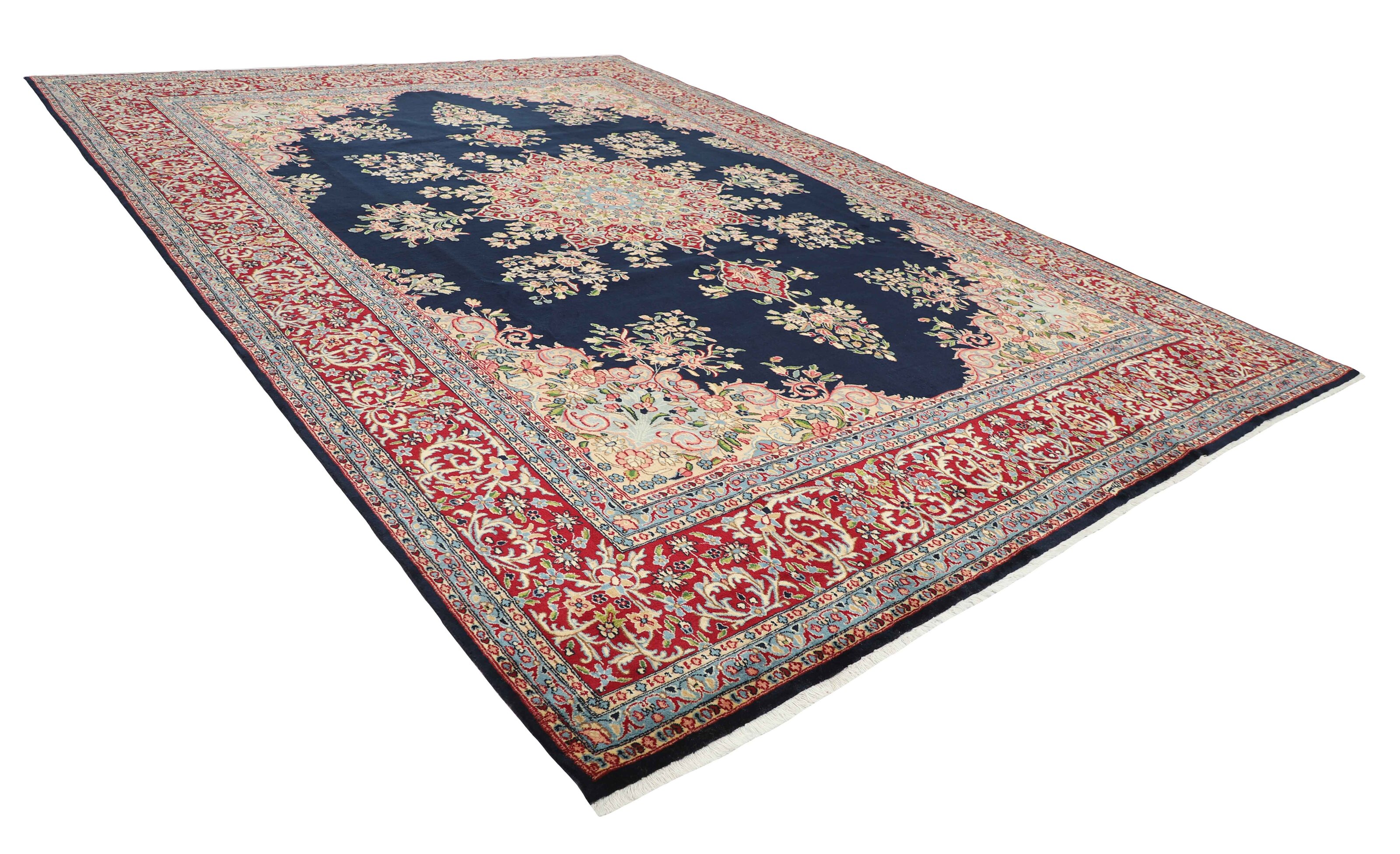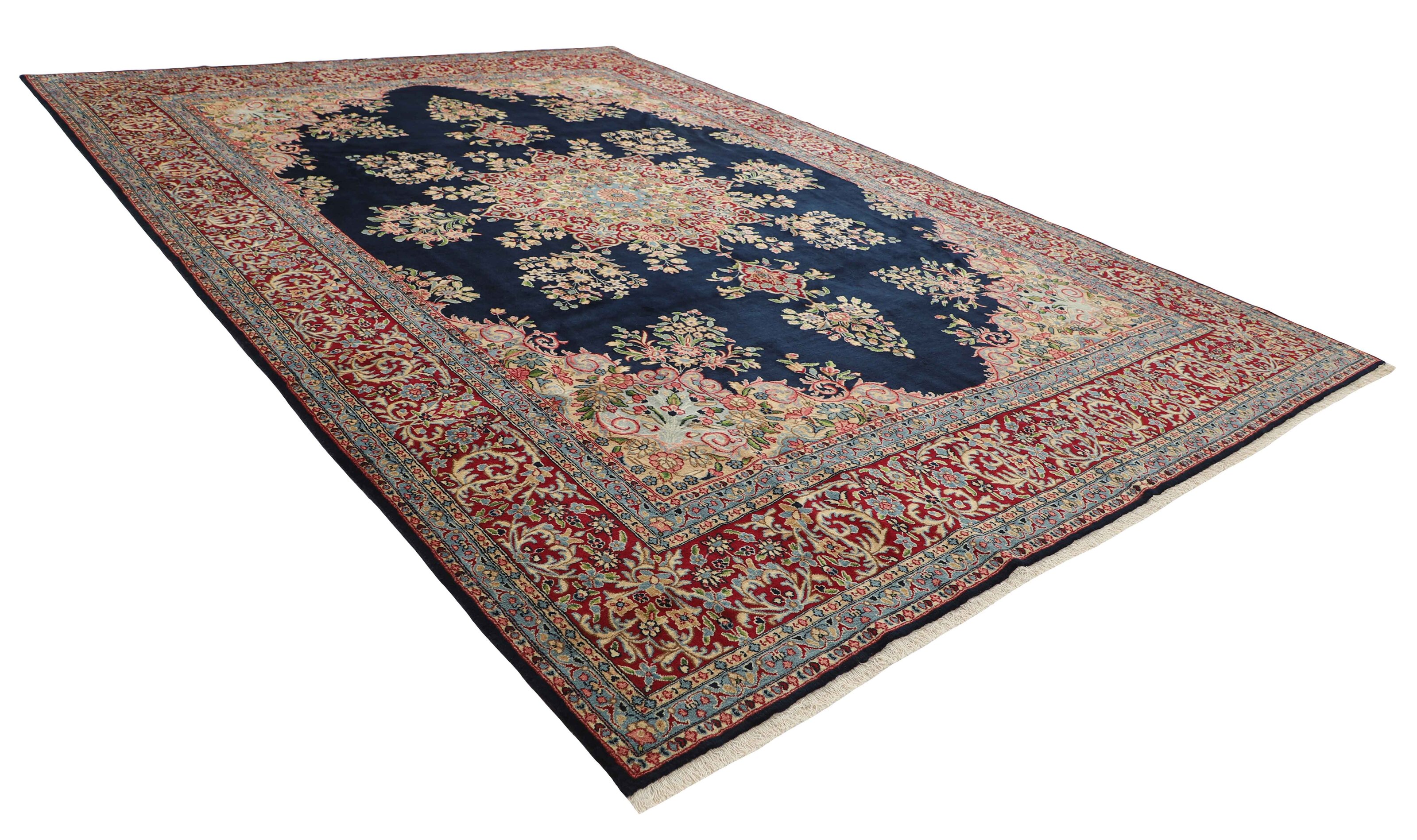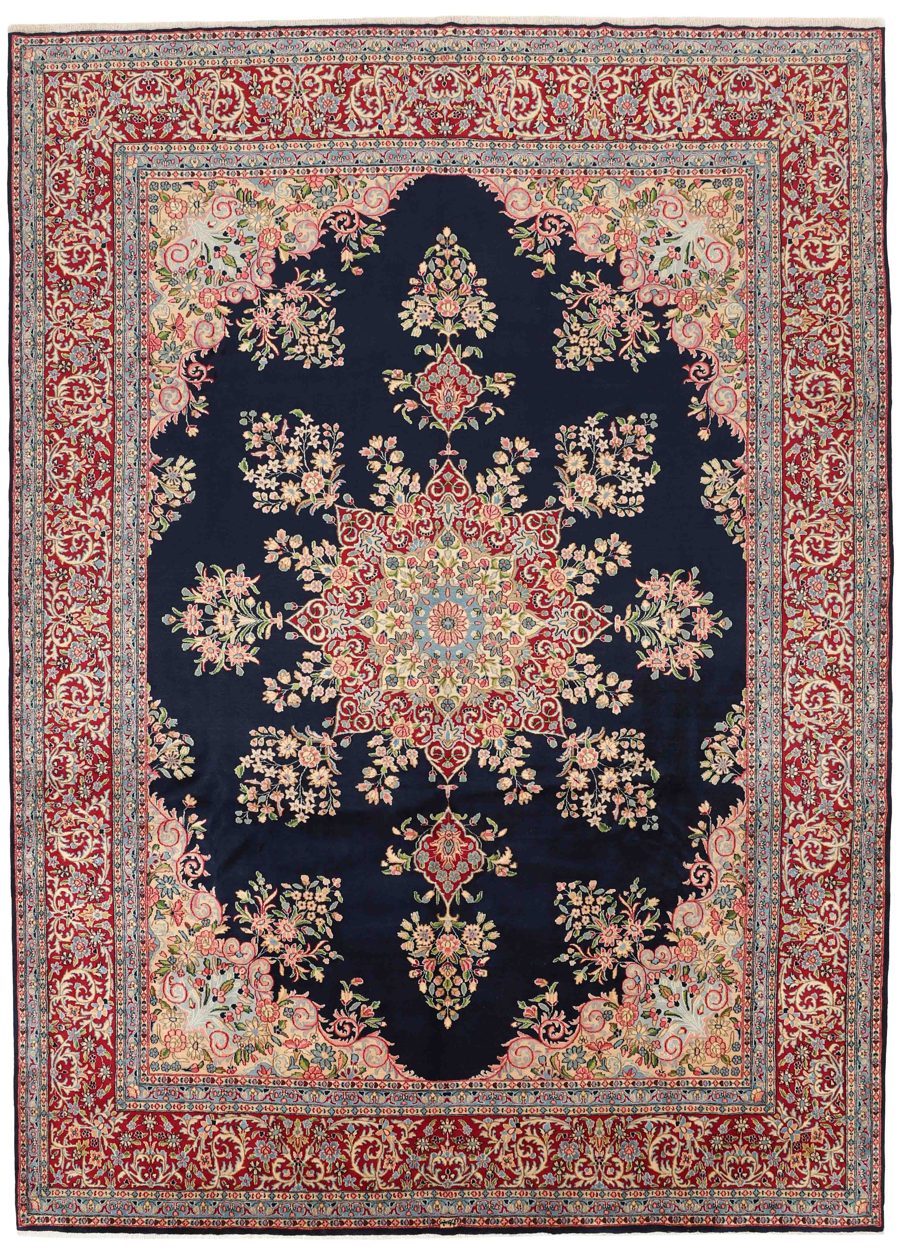 KermanItem no.: 1519707 Size: 302 cm x 424 cmThe city of Kerman lies in south-eastern Iran, on the edge of the Kavir-e-Lut Desert, and is the capitol of the Kerman province, which has about half a million inhabitants. Its geographical isolation has ensured the preservation of many monuments – there is said to be 90 mosques – and a 15th century mausoleum in nearby Mahan is said to be the most beautiful building in Iran. Like Yazd to the northwest, Kerman has a large population of Zoroastrians, who adhere to Iran’s ancient religion, which in other places has been replaced by Islam. The silhouette of Kerman is characterised by its wind towers – chimney like constructions used to catch every breeze and lead them down to the inner parts of the house. Kerman has an ancient textile tradition, and shawls were woven through large parts of the 19th century. When the demand for shawls fell, the weavers changed their looms for rug production. Initially, they used the same patterns they had used in the shawls, but they adapted them as fashion changed, although the Kerman rugs kept their delicate colours and patterns. All sizes are made. The largest rugs have unique colours and patterns, and are often knotted in the northern towns of Lavar or Ravar. Apart from the shawl patterns, Kerman often has adaptations of the Boteh- motif with natural bouquets of flowers, or adaptations of classical rug patterns. A wide range of delicate colours is used. The pile is normally soft, velvet like wool, while warp and weft are always cotton.