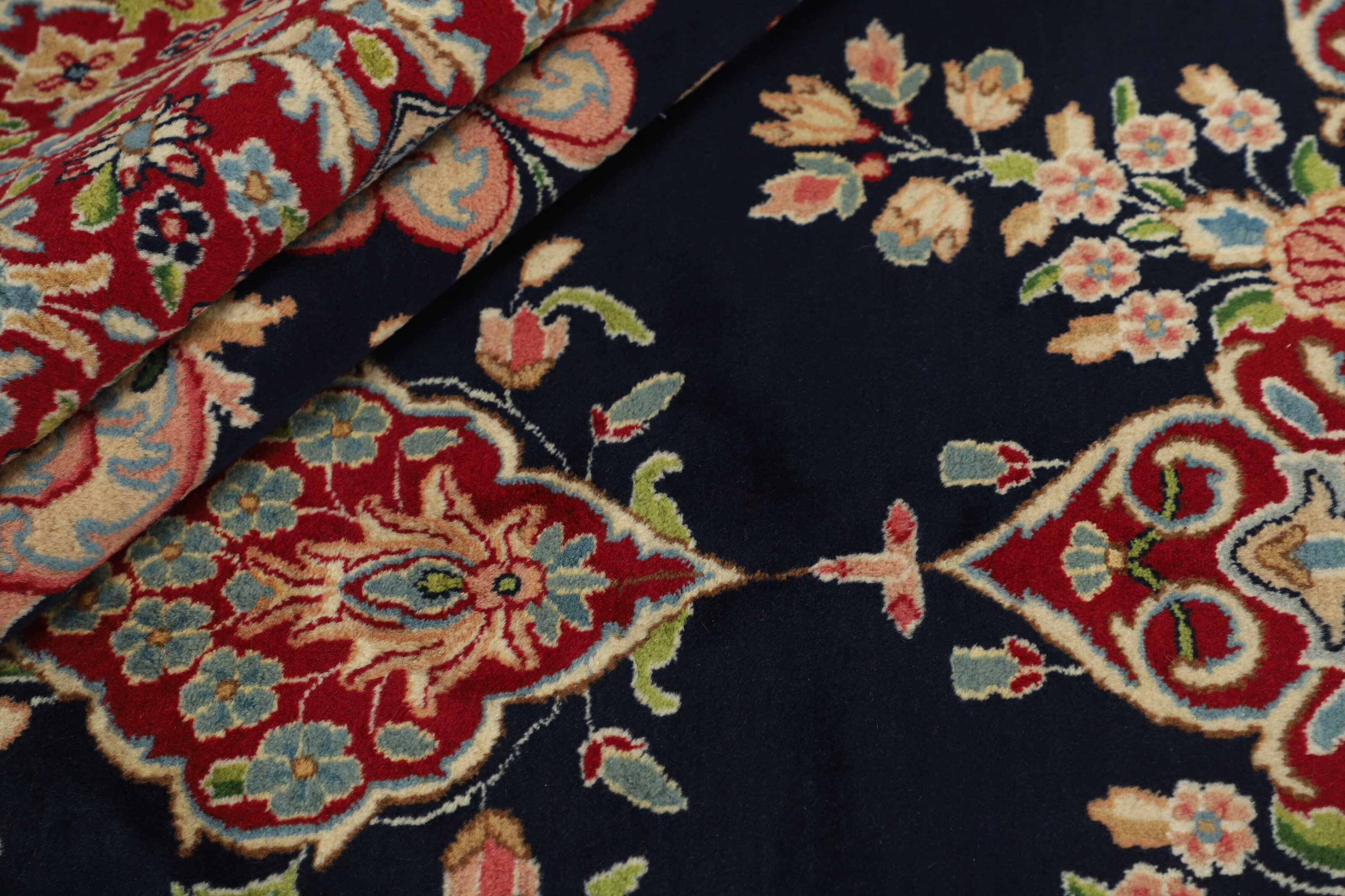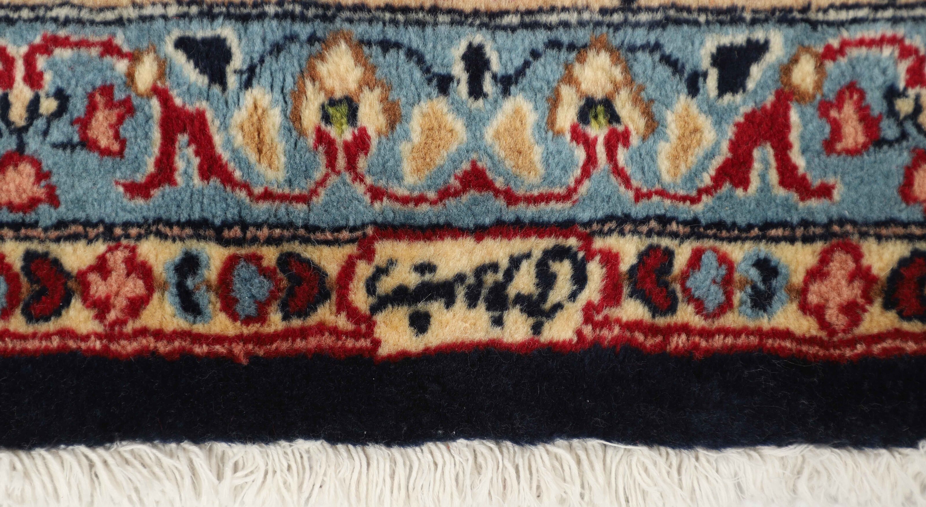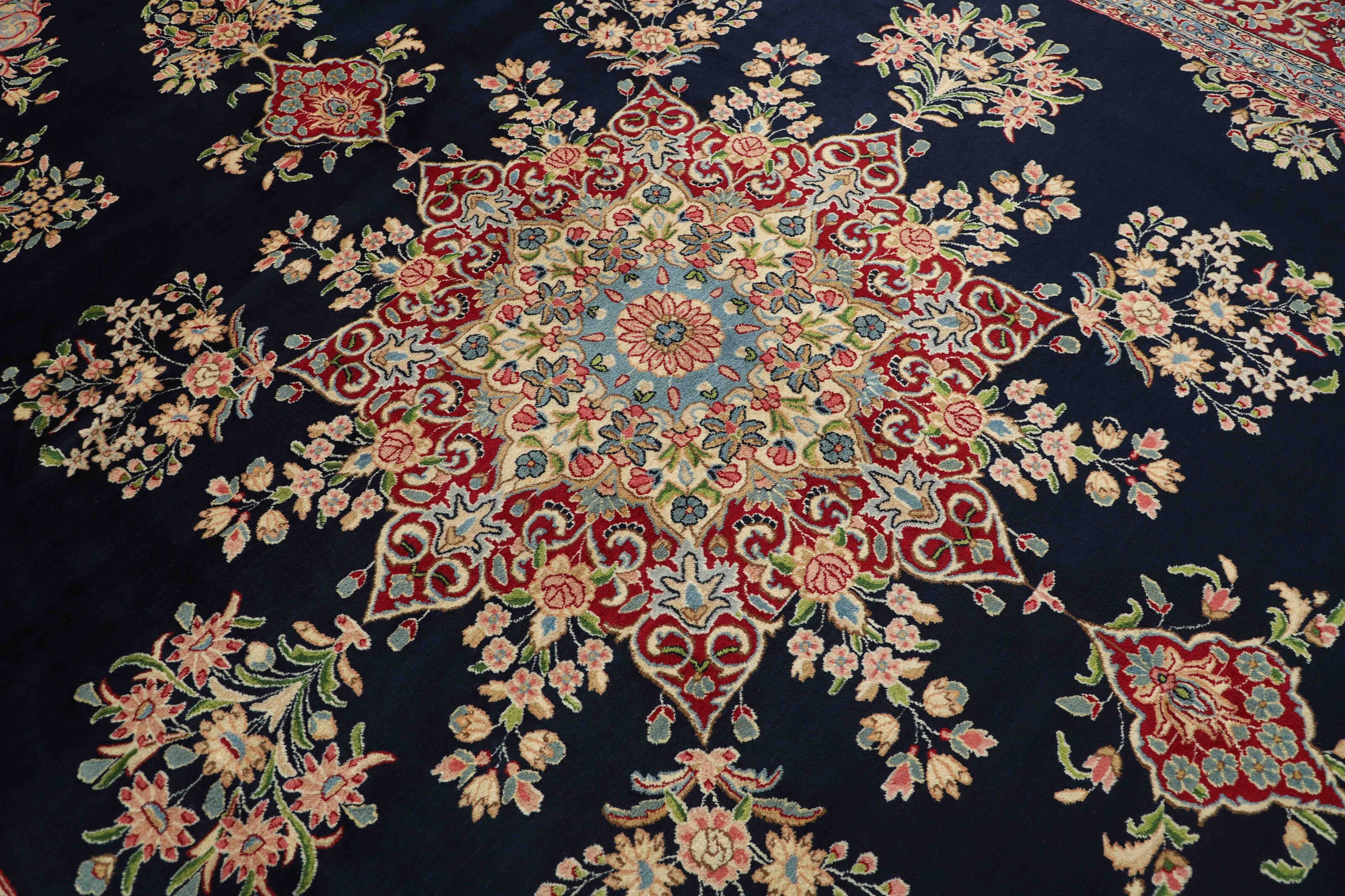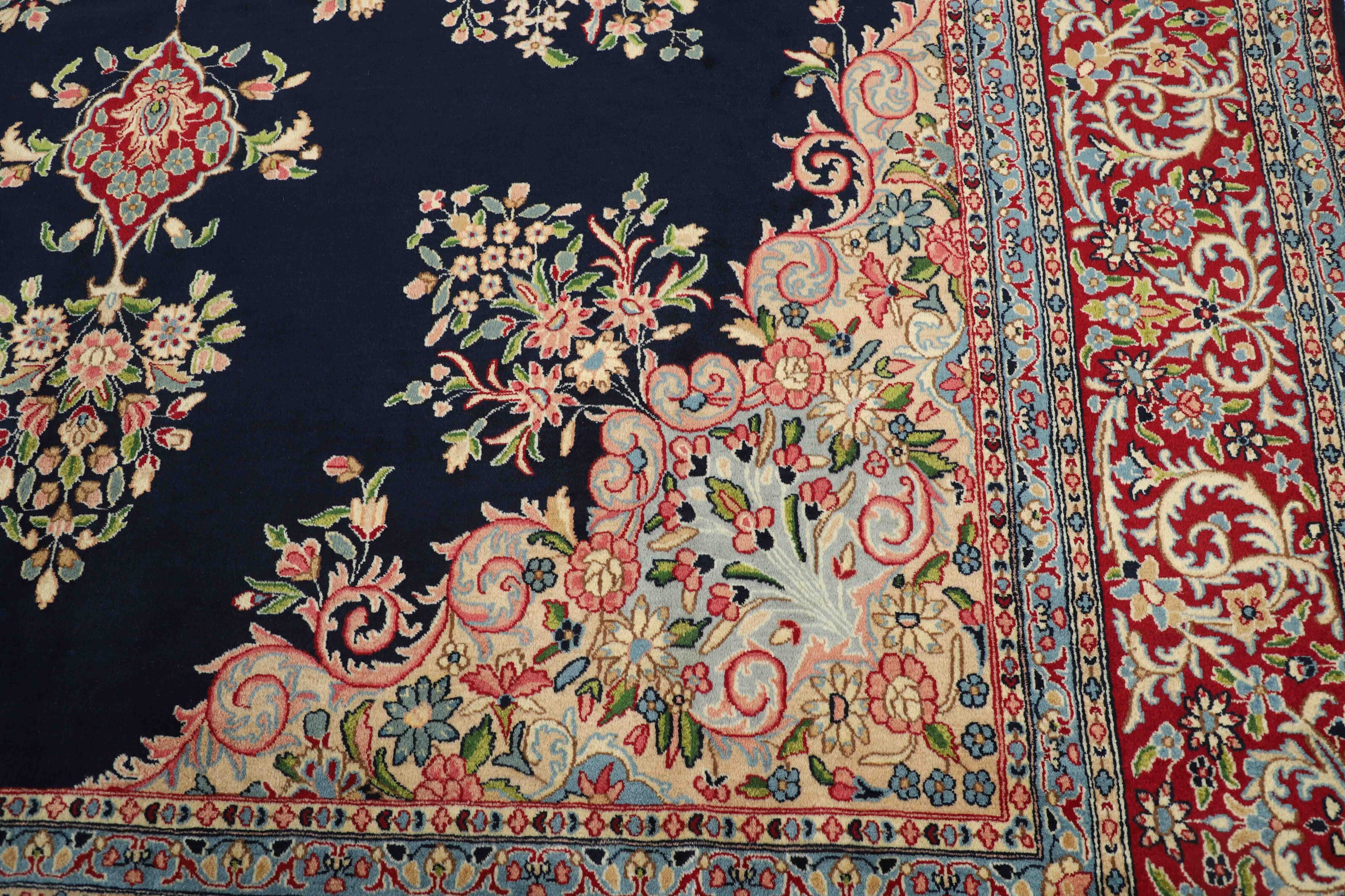 KermanItem no.: 1519707 Size: 302 cm x 424 cmThe city of Kerman lies in south-eastern Iran, on the edge of the Kavir-e-Lut Desert, and is the capitol of the Kerman province, which has about half a million inhabitants. Its geographical isolation has ensured the preservation of many monuments – there is said to be 90 mosques – and a 15th century mausoleum in nearby Mahan is said to be the most beautiful building in Iran. Like Yazd to the northwest, Kerman has a large population of Zoroastrians, who adhere to Iran’s ancient religion, which in other places has been replaced by Islam. The silhouette of Kerman is characterised by its wind towers – chimney like constructions used to catch every breeze and lead them down to the inner parts of the house. Kerman has an ancient textile tradition, and shawls were woven through large parts of the 19th century. When the demand for shawls fell, the weavers changed their looms for rug production. Initially, they used the same patterns they had used in the shawls, but they adapted them as fashion changed, although the Kerman rugs kept their delicate colours and patterns. All sizes are made. The largest rugs have unique colours and patterns, and are often knotted in the northern towns of Lavar or Ravar. Apart from the shawl patterns, Kerman often has adaptations of the Boteh- motif with natural bouquets of flowers, or adaptations of classical rug patterns. A wide range of delicate colours is used. The pile is normally soft, velvet like wool, while warp and weft are always cotton.