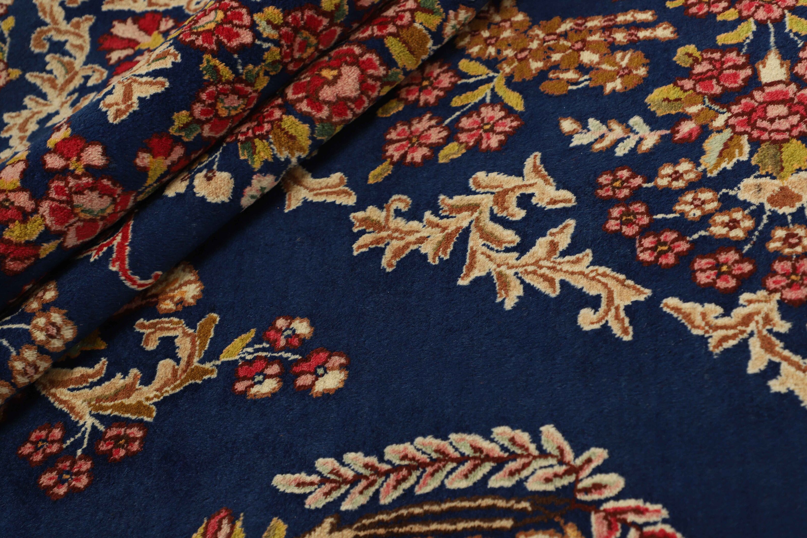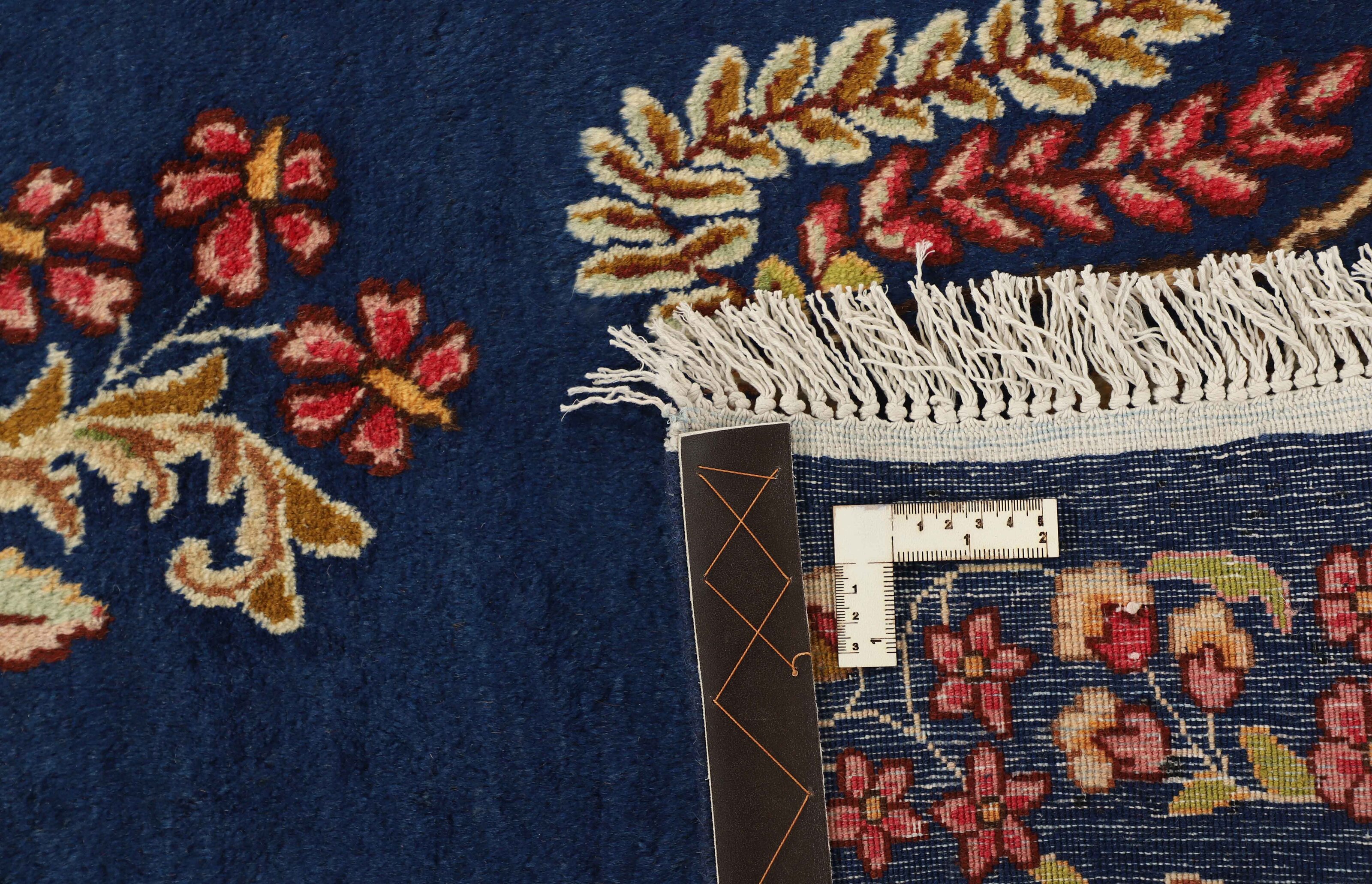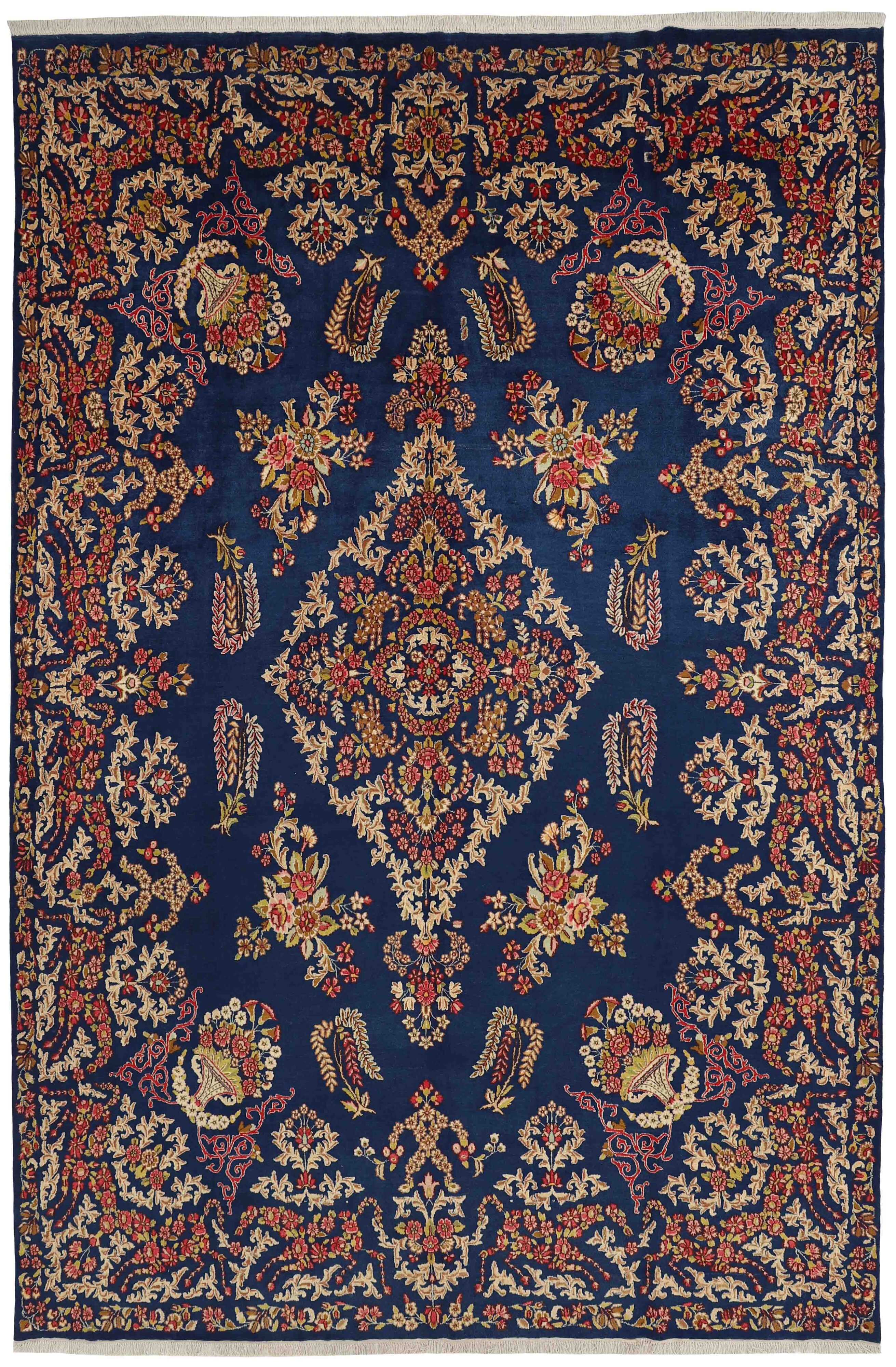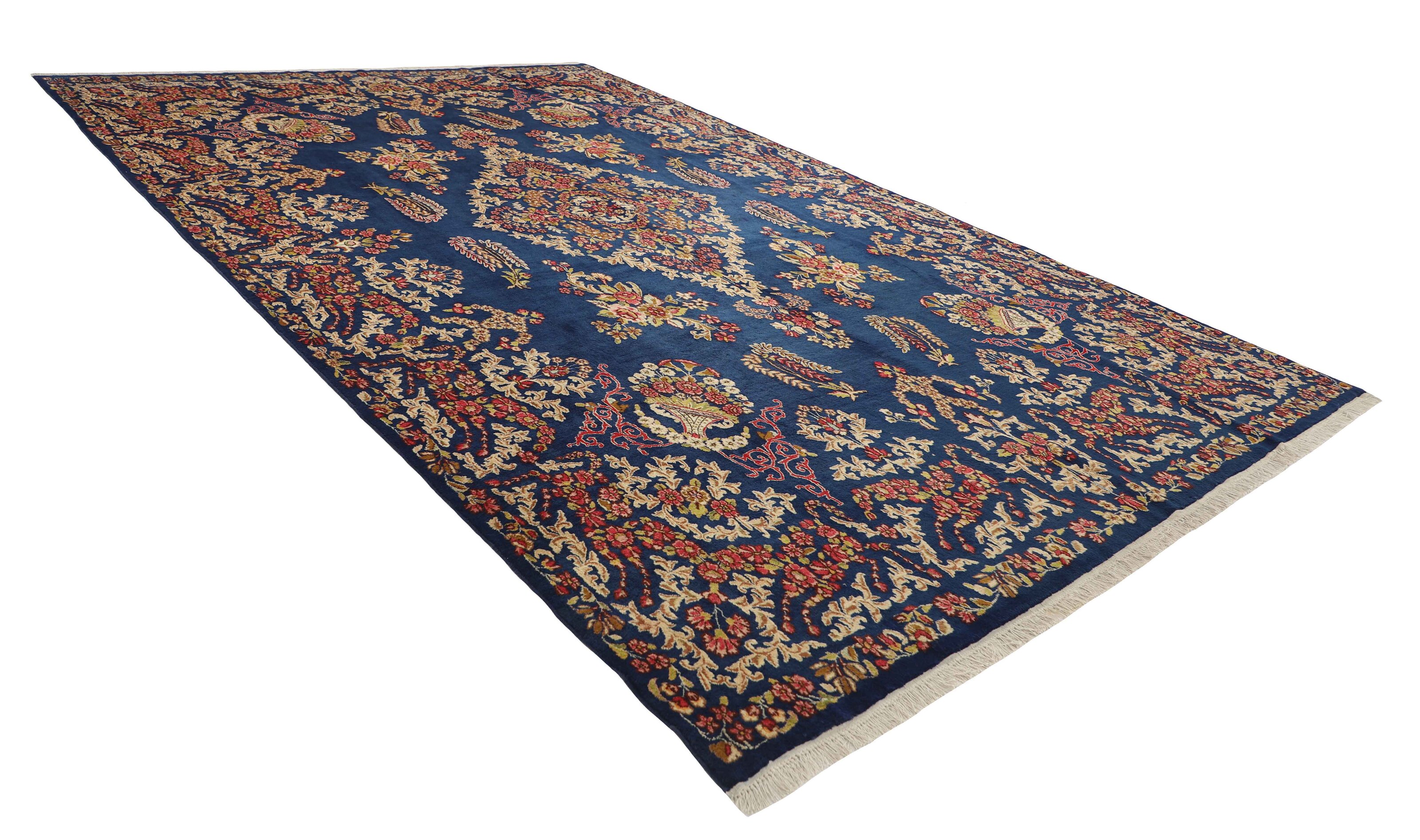 KermanItem no.: 1519709 Size: 292 cm x 448 cmThe city of Kerman lies in south-eastern Iran, on the edge of the Kavir-e-Lut Desert, and is the capitol of the Kerman province, which has about half a million inhabitants. Its geographical isolation has ensured the preservation of many monuments – there is said to be 90 mosques – and a 15th century mausoleum in nearby Mahan is said to be the most beautiful building in Iran. Like Yazd to the northwest, Kerman has a large population of Zoroastrians, who adhere to Iran’s ancient religion, which in other places has been replaced by Islam. The silhouette of Kerman is characterised by its wind towers – chimney like constructions used to catch every breeze and lead them down to the inner parts of the house. Kerman has an ancient textile tradition, and shawls were woven through large parts of the 19th century. When the demand for shawls fell, the weavers changed their looms for rug production. Initially, they used the same patterns they had used in the shawls, but they adapted them as fashion changed, although the Kerman rugs kept their delicate colours and patterns. All sizes are made. The largest rugs have unique colours and patterns, and are often knotted in the northern towns of Lavar or Ravar. Apart from the shawl patterns, Kerman often has adaptations of the Boteh- motif with natural bouquets of flowers, or adaptations of classical rug patterns. A wide range of delicate colours is used. The pile is normally soft, velvet like wool, while warp and weft are always cotton.