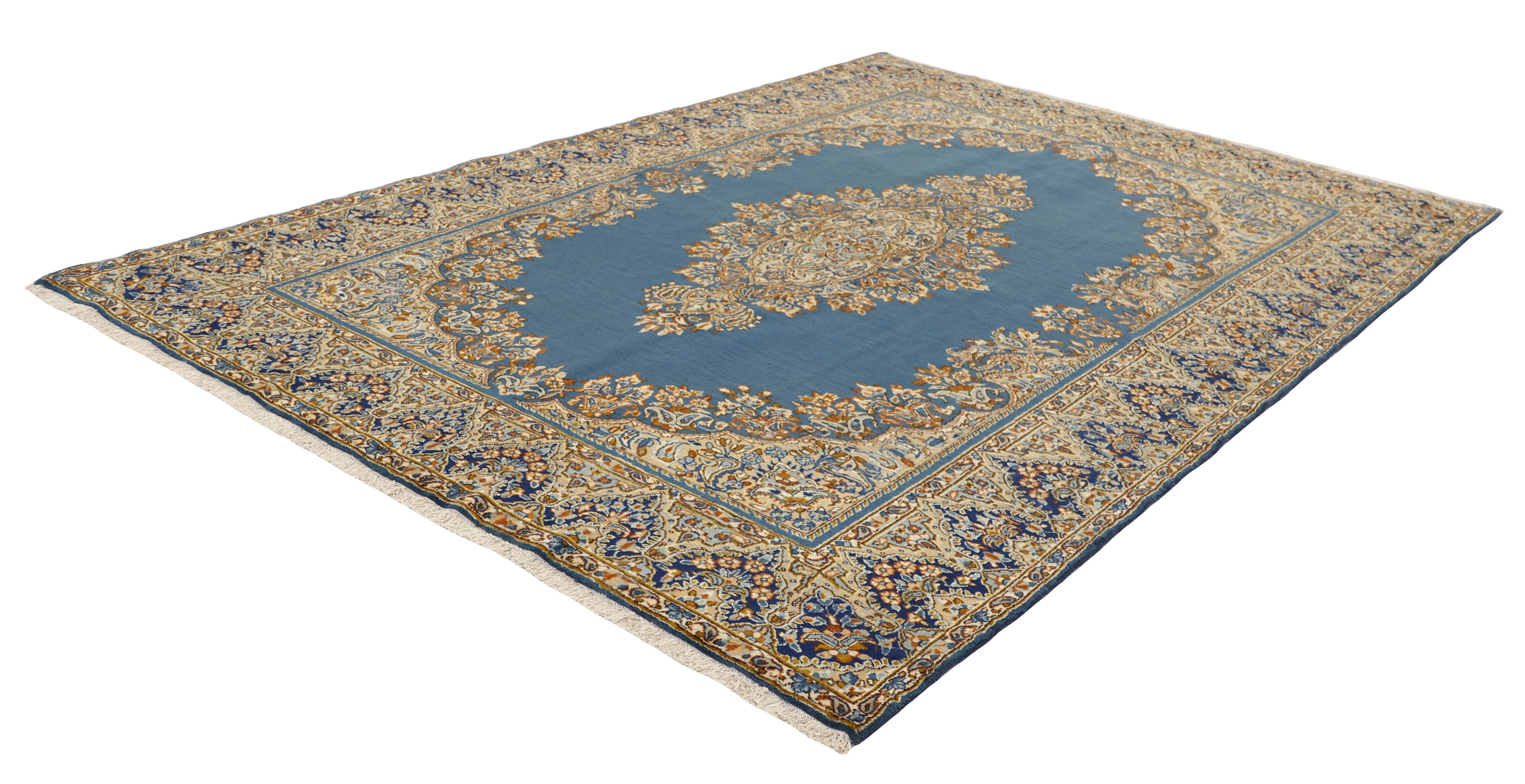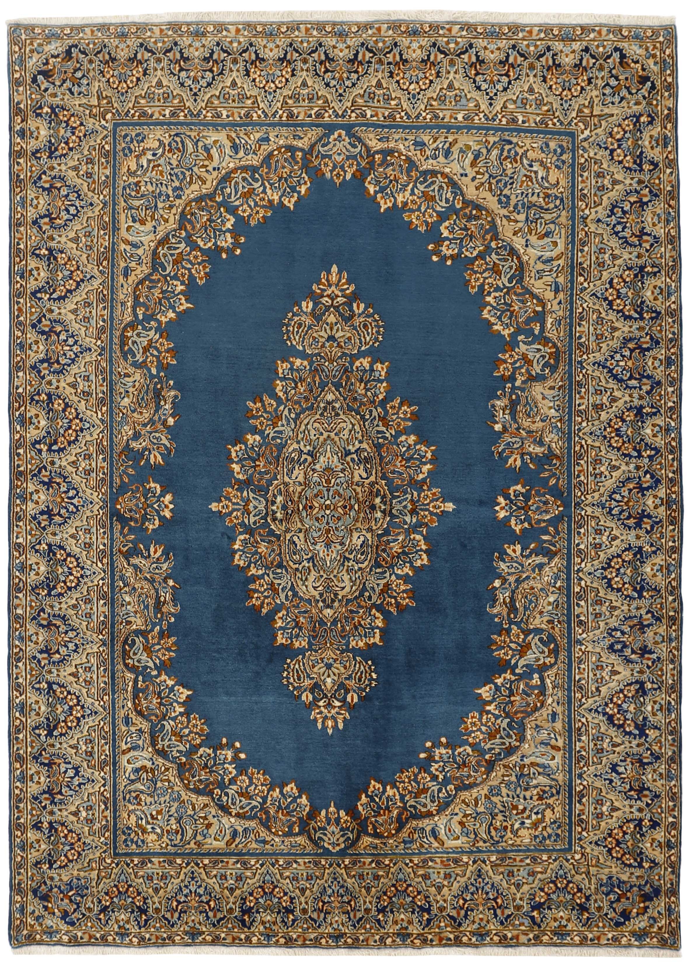 KermanItem no.: 1519719 Size: 204 cm x 295 cmThe city of Kerman lies in south-eastern Iran, on the edge of the Kavir-e-Lut Desert, and is the capitol of the Kerman province, which has about half a million inhabitants. Its geographical isolation has ensured the preservation of many monuments – there is said to be 90 mosques – and a 15th century mausoleum in nearby Mahan is said to be the most beautiful building in Iran. Like Yazd to the northwest, Kerman has a large population of Zoroastrians, who adhere to Iran’s ancient religion, which in other places has been replaced by Islam. The silhouette of Kerman is characterised by its wind towers – chimney like constructions used to catch every breeze and lead them down to the inner parts of the house. Kerman has an ancient textile tradition, and shawls were woven through large parts of the 19th century. When the demand for shawls fell, the weavers changed their looms for rug production. Initially, they used the same patterns they had used in the shawls, but they adapted them as fashion changed, although the Kerman rugs kept their delicate colours and patterns. All sizes are made. The largest rugs have unique colours and patterns, and are often knotted in the northern towns of Lavar or Ravar. Apart from the shawl patterns, Kerman often has adaptations of the Boteh- motif with natural bouquets of flowers, or adaptations of classical rug patterns. A wide range of delicate colours is used. The pile is normally soft, velvet like wool, while warp and weft are always cotton.